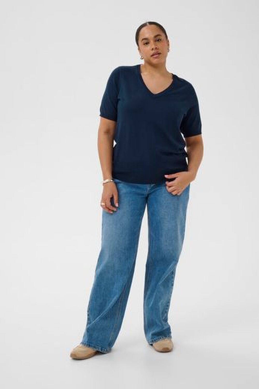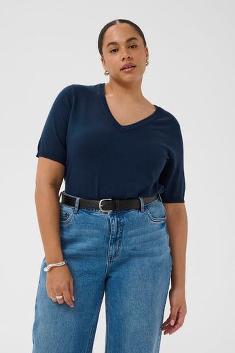 Deze V-hals trui heeft een tijdloze, normale pasvorm en mouwen tot aan de elleboog voor veelzijdig dagelijks gebruik. Zachte, lichte stof biedt comfort, terwijl de ribboord zorgt voor een nette afwerking.