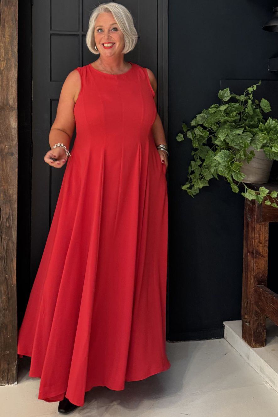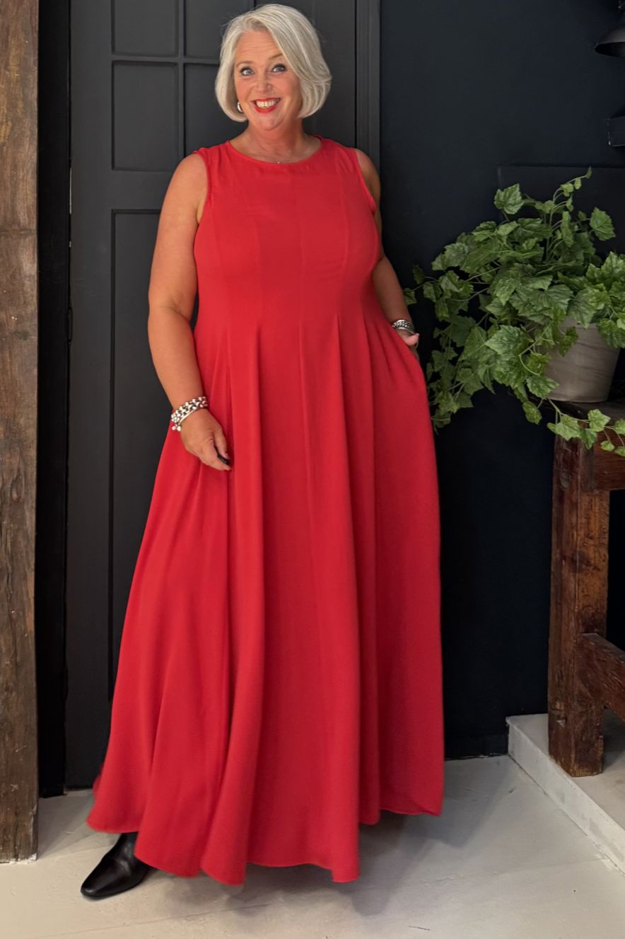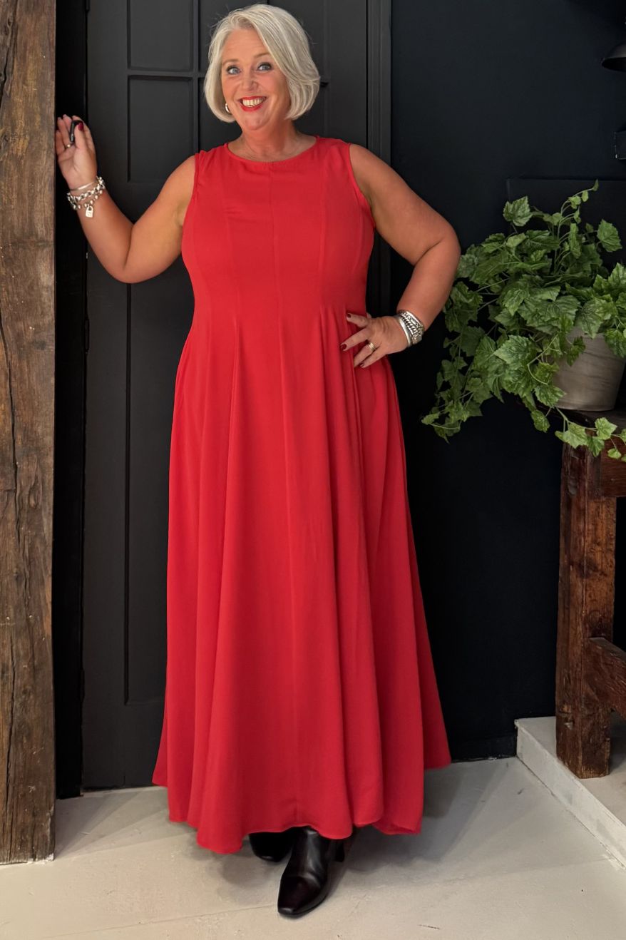 Doe een opvallende uitspraak met deze levendige en elegante mouwloze maxijurk. Gemaakt van hoogwaardig polyester, beweegt het prachtig met elke stap en biedt het zowel comfort als verfijning. De strakke, gestructureerde halslijn en de vloeiende silhouet maken het de perfecte basis voor gedurfde accessoires of tijdloze eenvoud.