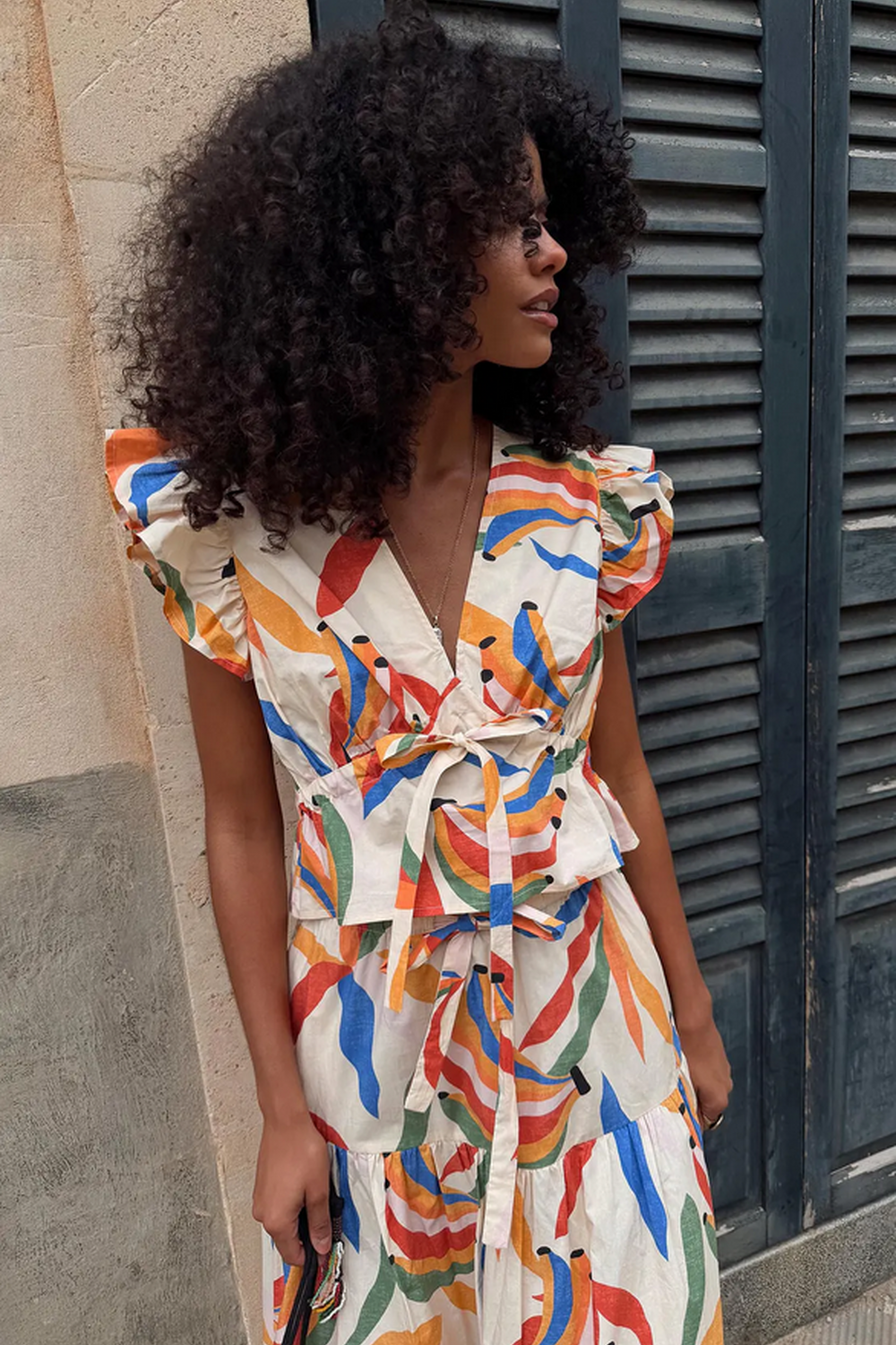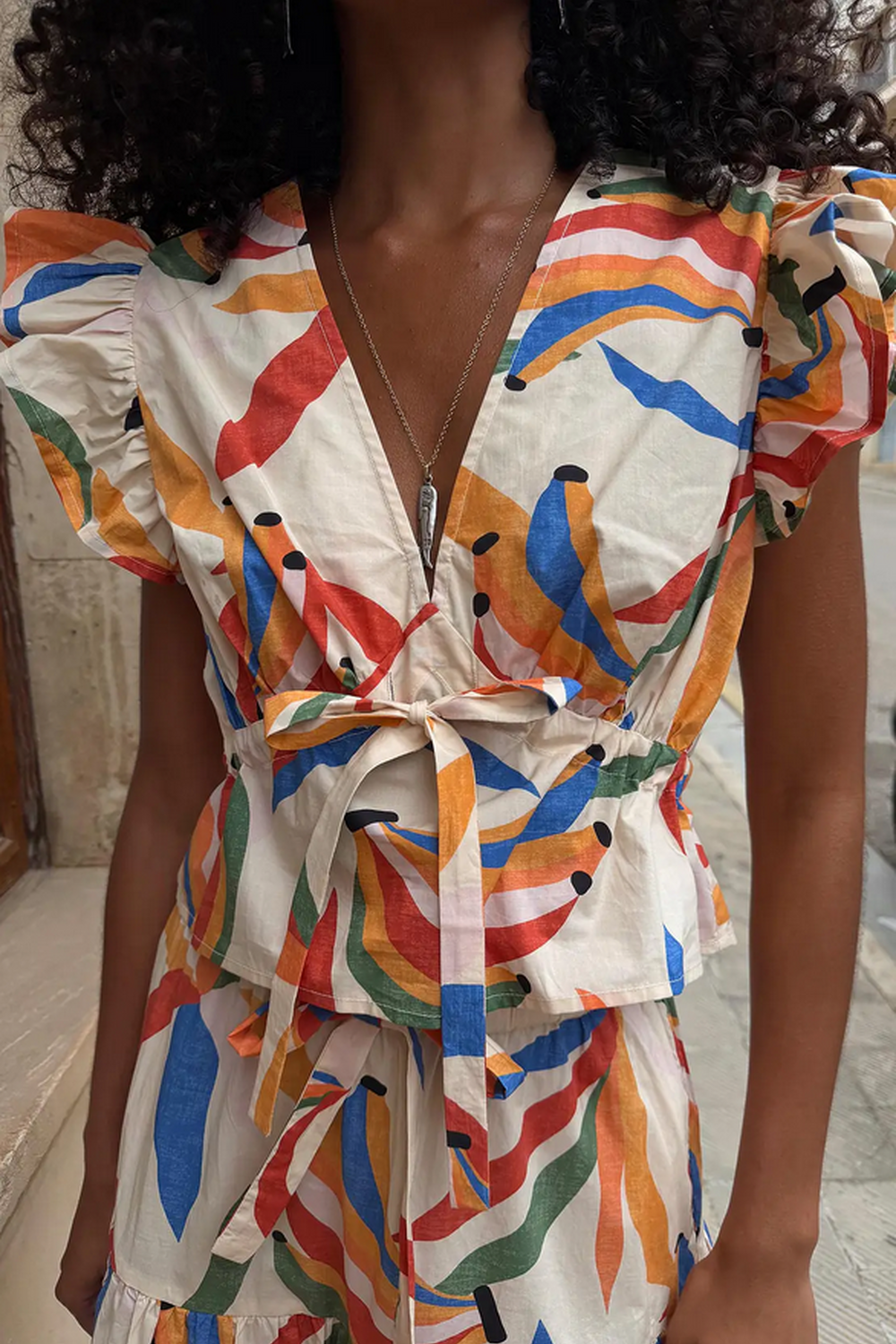Top met een V-hals, pofmouwen en een strik aan de voorkant die de taille accentueert. De opvallende bananenprint maakt het speels en makkelijk te dragen, terwijl de peplumzoom een extra detail toevoegt. Combineer met de bijpassende rok. Wasvoorschriften: op 30 graden wassen.