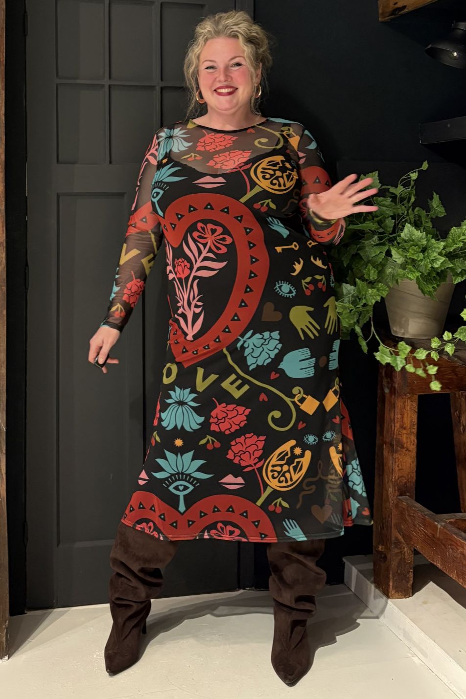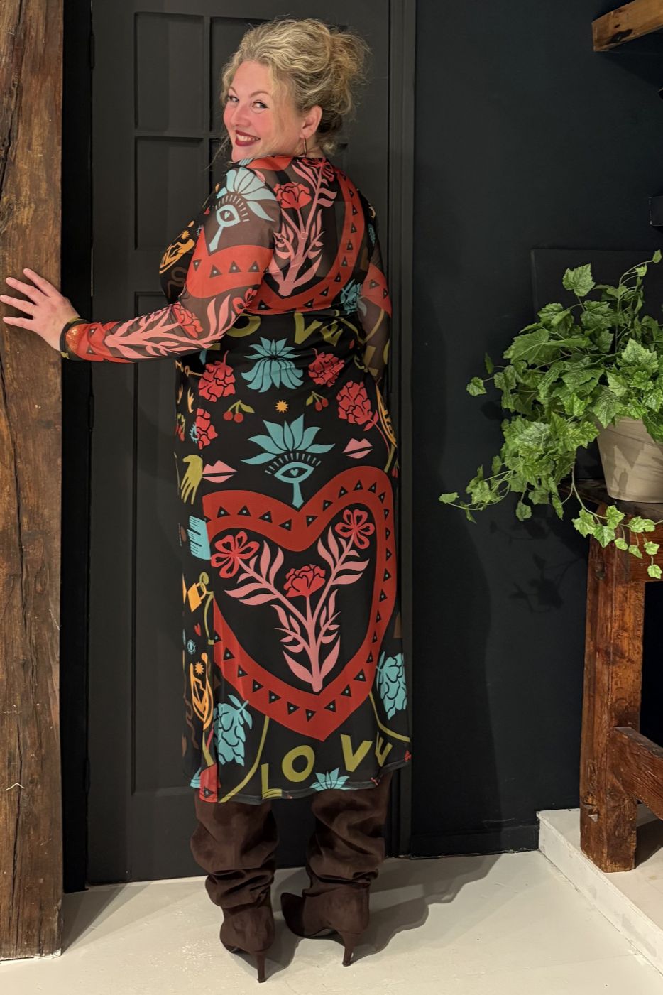 Maxi-jurk van mesh-stof met comfortabele stretch, voorzien van handgeschilderde print met hart- en oogdetails.