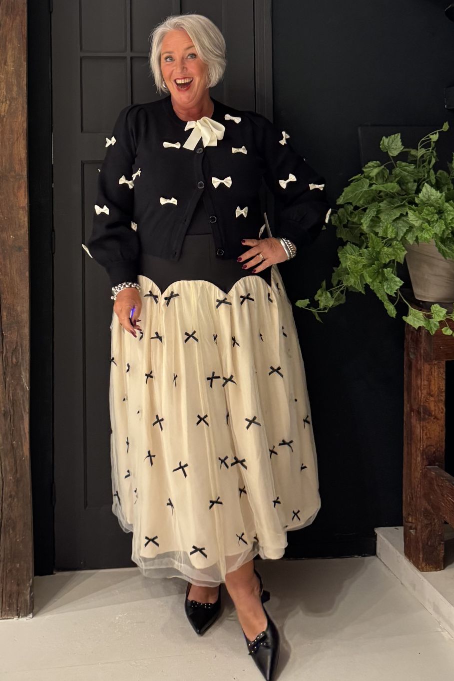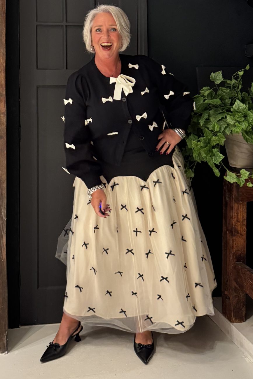 Rok met een basis gemaakt van jersey, die je taille accentueert, maar ook comfortabel is. De schulprand loopt over in een geplooide tule mesh rok. De rok is versierd met kleine strikjes die er chic uitzien en het silhouet benadrukken.