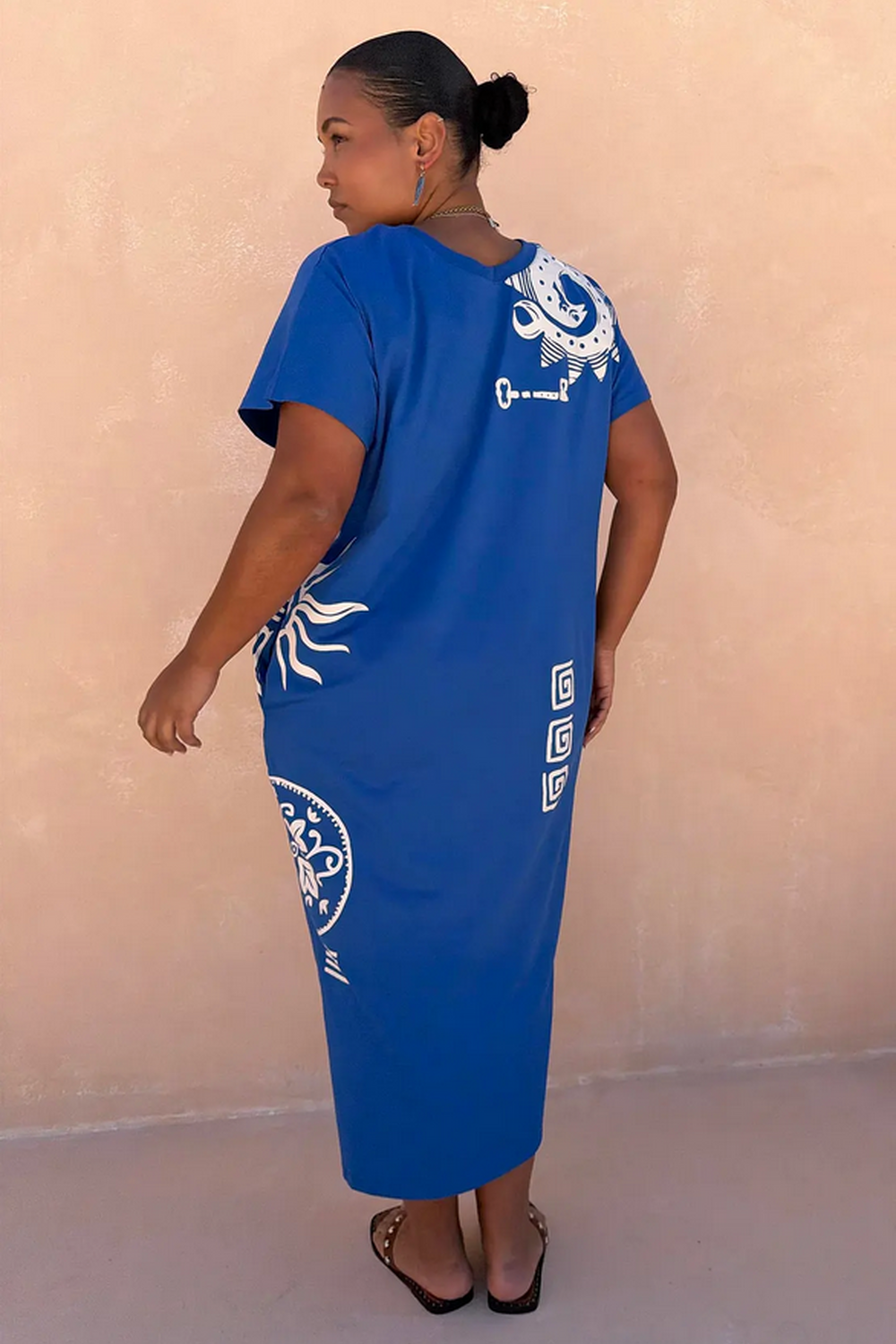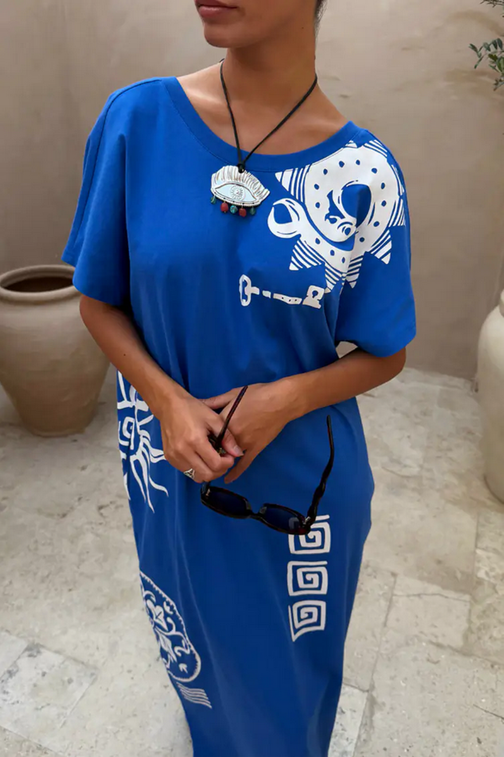 Een lichtgewicht katoenen maxi-jurk, geschikt voor zowel casual als formele gelegenheden. Bevat zonmotieven en handgeschilderde afbeeldingen die elementen van Griekse kunst weerspiegelen. Draag hem casual met de klassieke T-shirthals of leef alvast naar de zomer toe met de off-shoulder look. Ook in het zwart te krijgen! Wasvoorschriften: op 30 graden wassen.