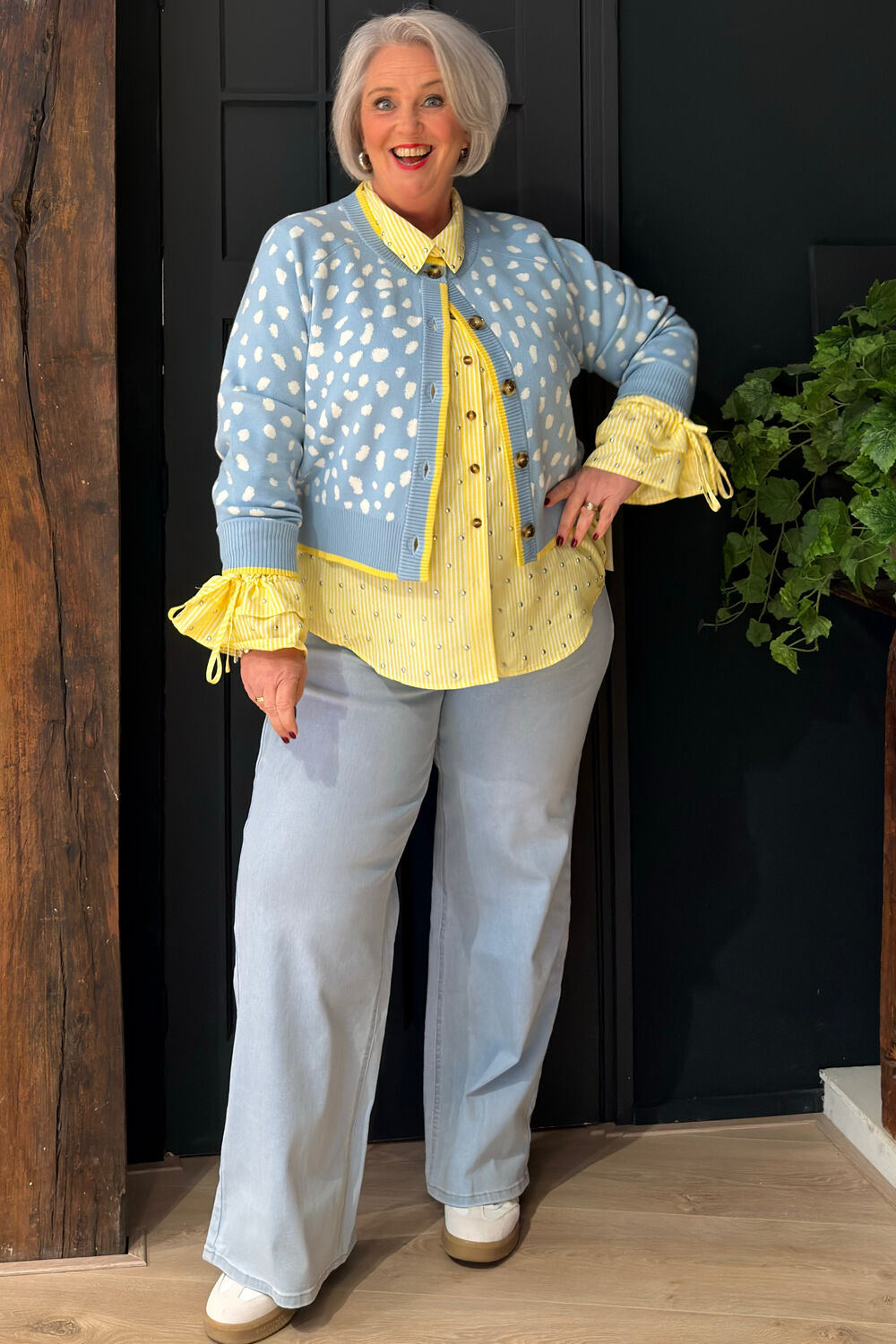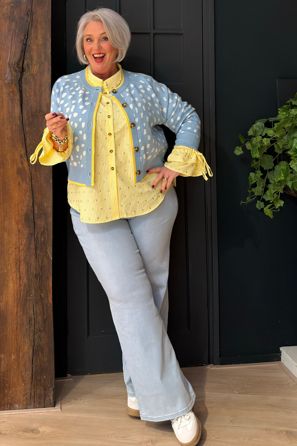 Vest van zachte gebreide stof met een lichtblauwe basis en een gevlekte hertenprint in blush- en crèmekleuren. Dit vest heeft een slankere pasvorm, waardoor het iets dichter op het lichaam valt voor een gestroomlijnde look. De mouwen zijn ook iets korter dan bij het merk haar gebruikelijke modellen, wat het een nette, moderne uitstraling geeft. Als je de voorkeur geeft aan een lossere, meer ontspannen pasvorm, kun je een maat groter bestellen. Wasvoorschriften: op 30 graden wassen.