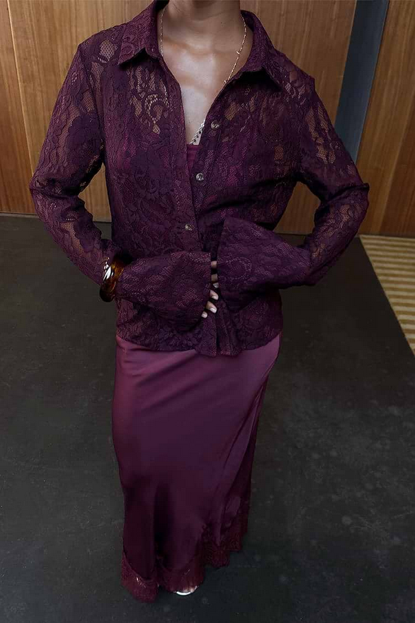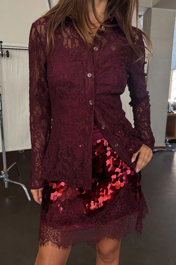 Top met delicate kanten stof in een diep bordeauxrode kleur. Met figuurnaden voor een iets meer getailleerd silhouet en uitlopende manchetten voor een extra vleugje stijl. Inclusief slipvest. Wasvoorschrift: dry clean only