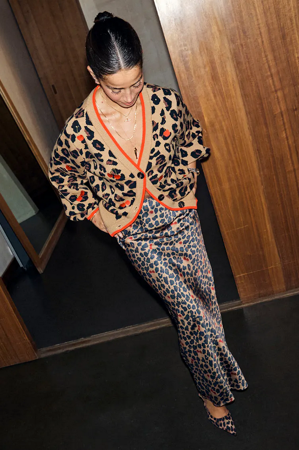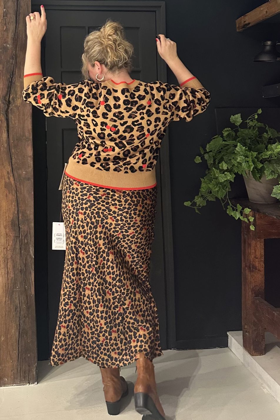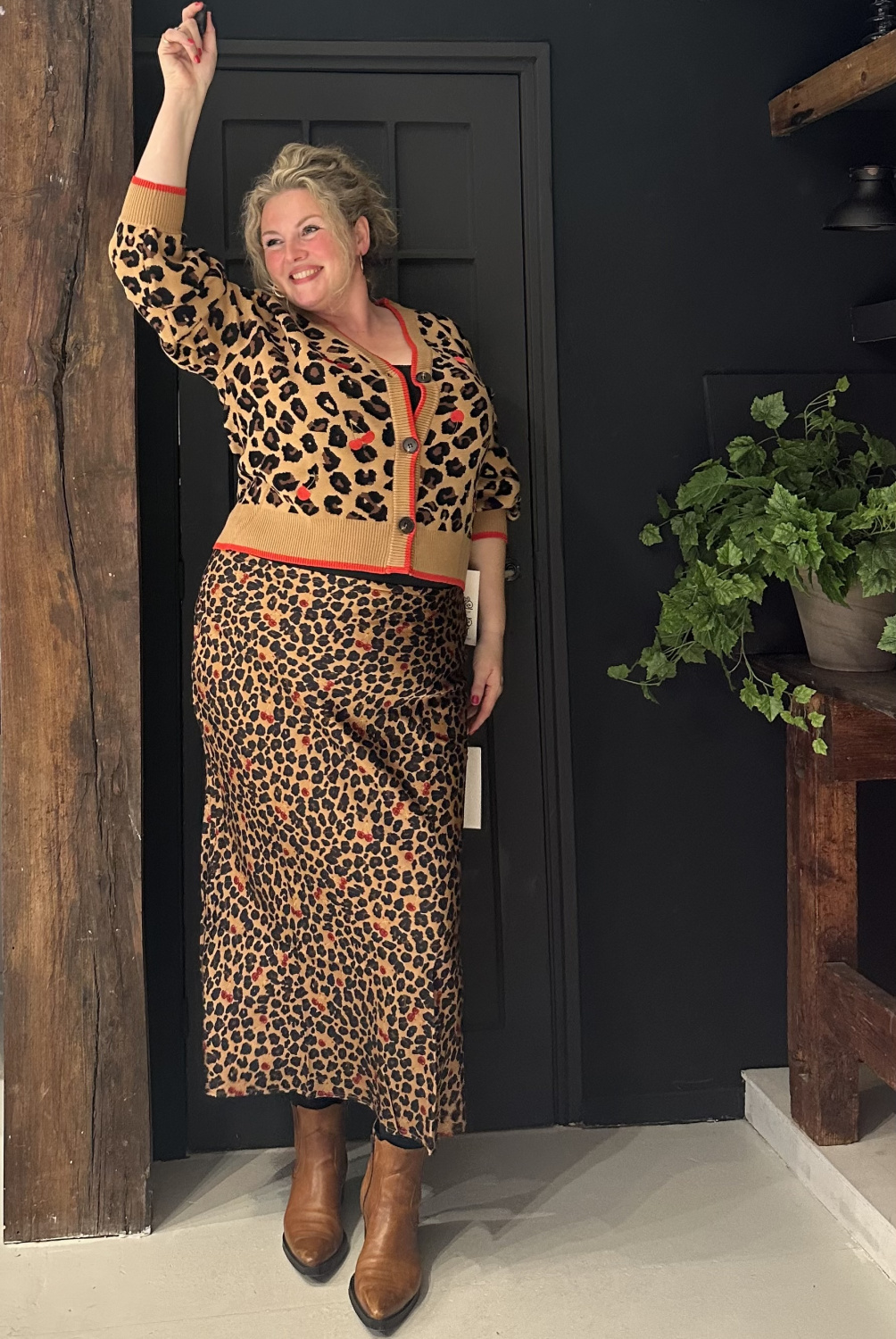 Superzacht gebreid vest met luipaardprint en kersendetails. Bevat contrasterende rode biezen langs de zomen die een vleugje kleur toevoegen.