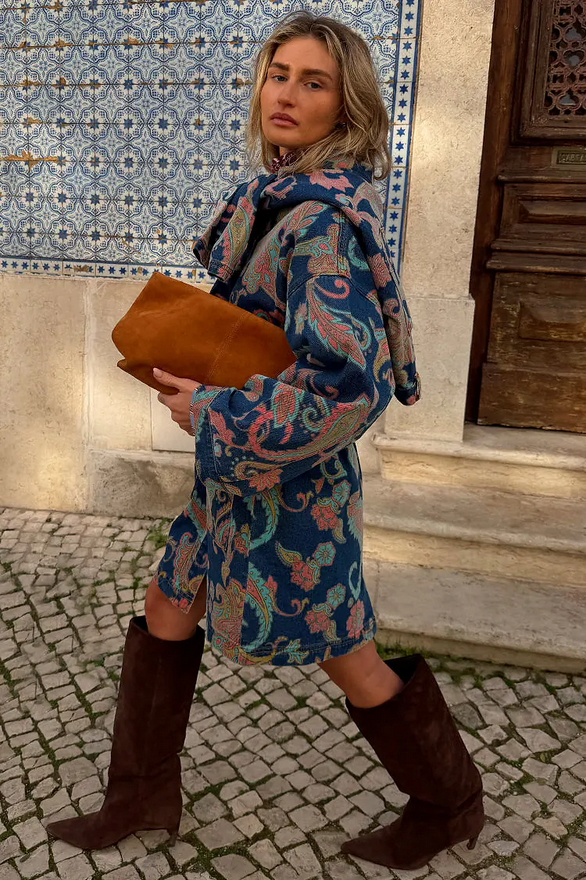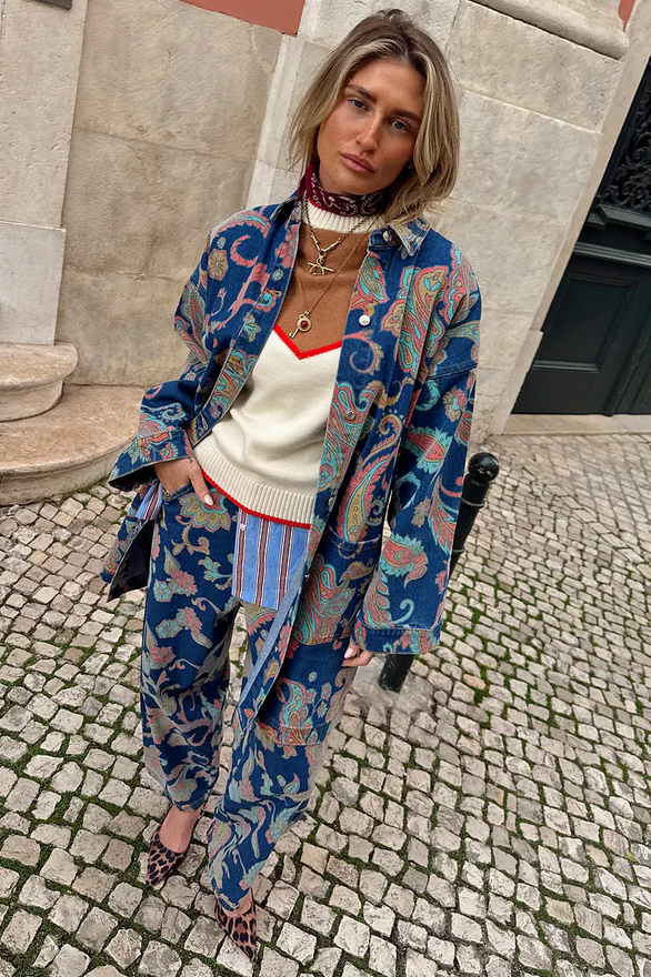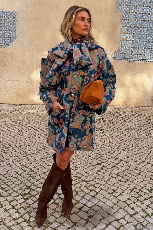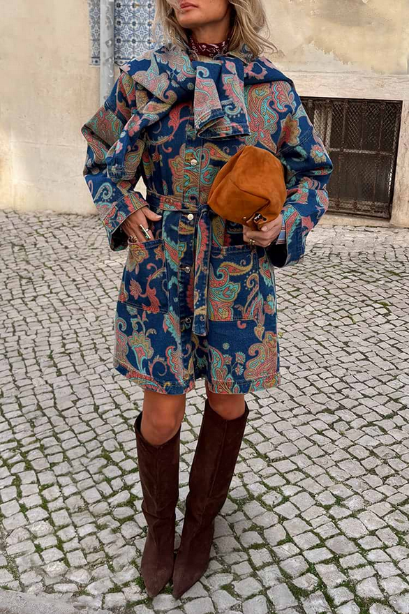 Lichtgewicht denim shacket met een paisleyprint over de hele stof in heldere en opvallende tinten. De lange lengte zorgt voor talloze stylingmogelijkheden, terwijl de riem de taille accentueert voor een meer gedefinieerd silhouet. Wasvoorschrift: 30 graden wassen