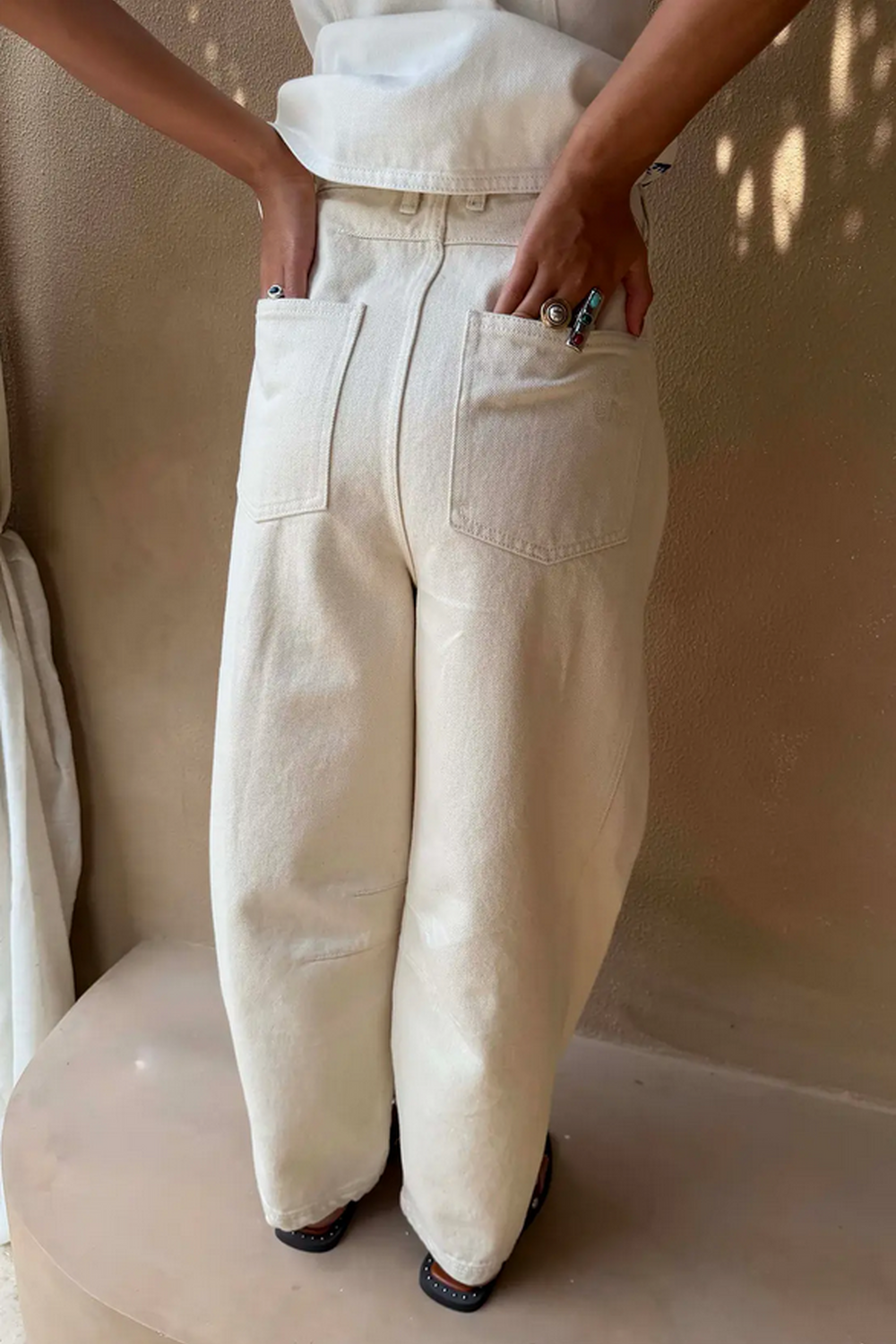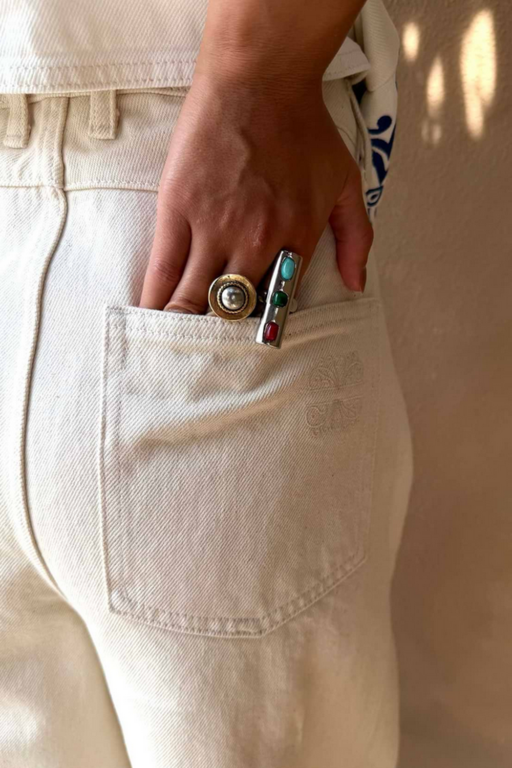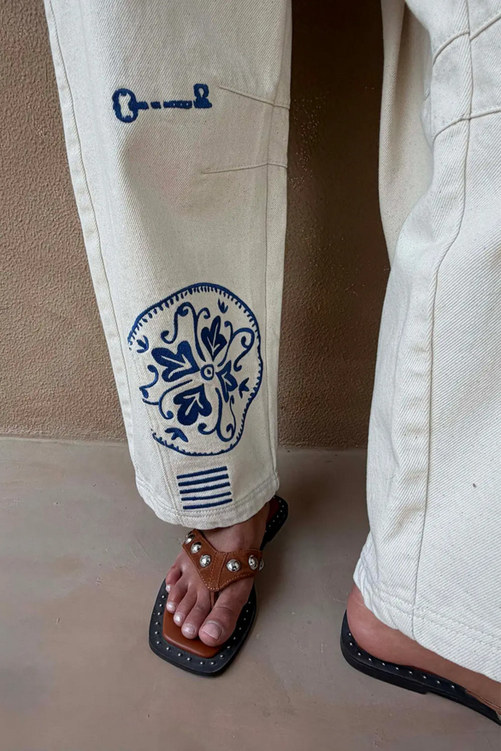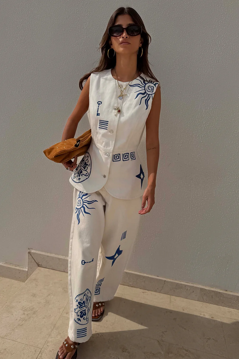 Jeans met zonmotieven, gecombineerd met geborduurde afbeeldingen geïnspireerd op Griekse kunst wat de verder eenvoudige, rechte pijpen een extra dimensie geeft. Het contrast tussen crème en blauw oogt fris en chic, perfect om te combineren met verschillende outfits. Draag ze met het bijpassende vest.Wasvoorschrift: op 30 graden wassen.