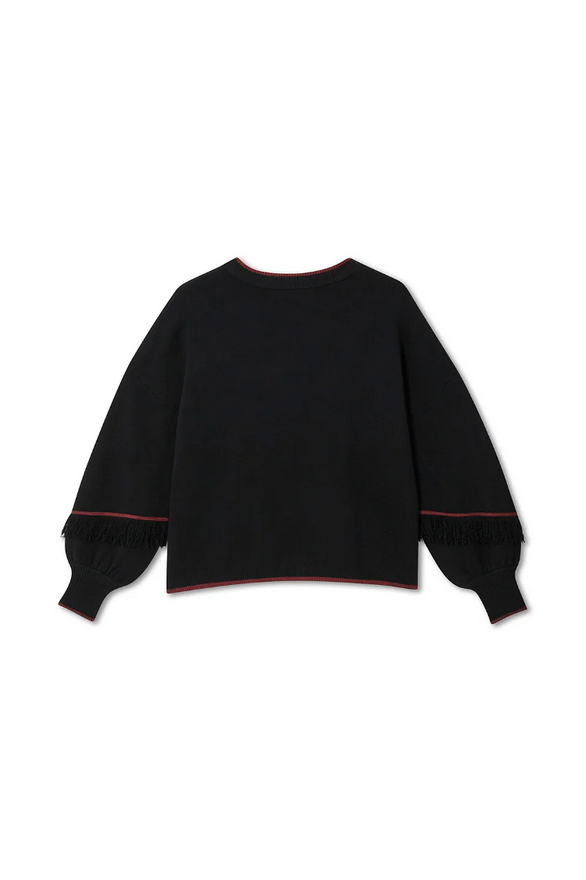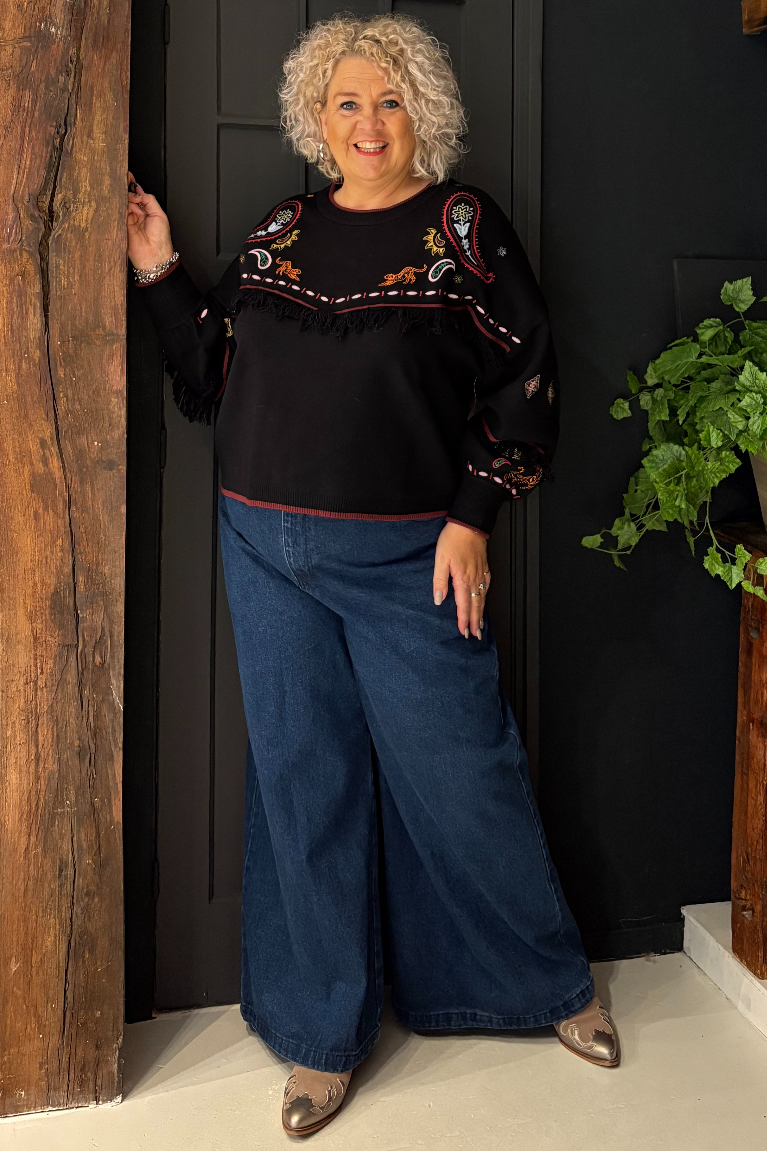 Trui met stretch en een gebreide basis met franjes langs de mouwen en borst. Geborduurd met een combinatie van paisleypatronen en enkele klassieke Never Fully Dressed motieven.