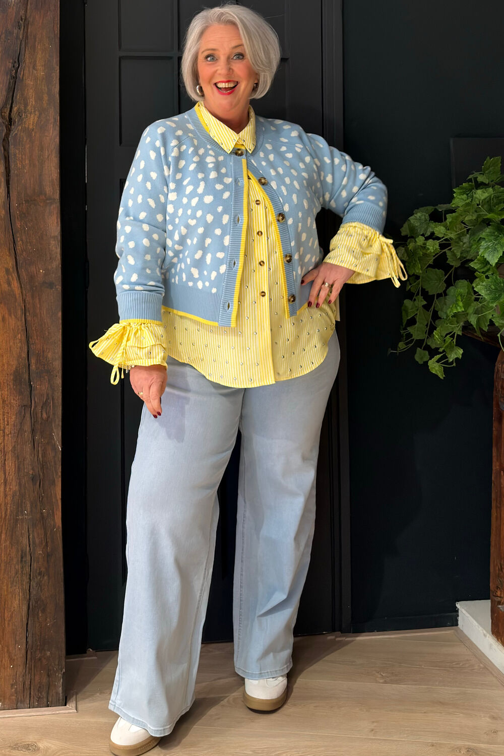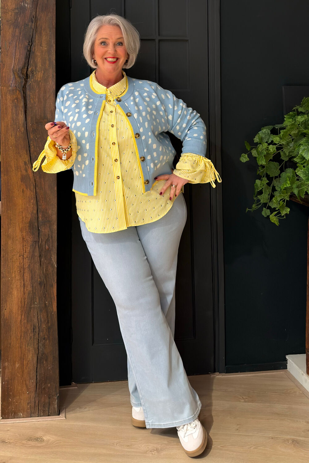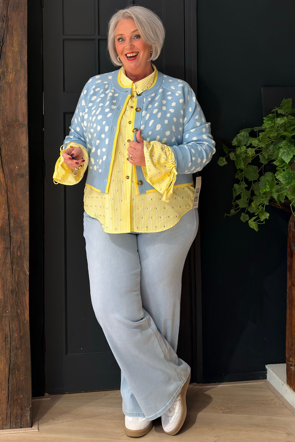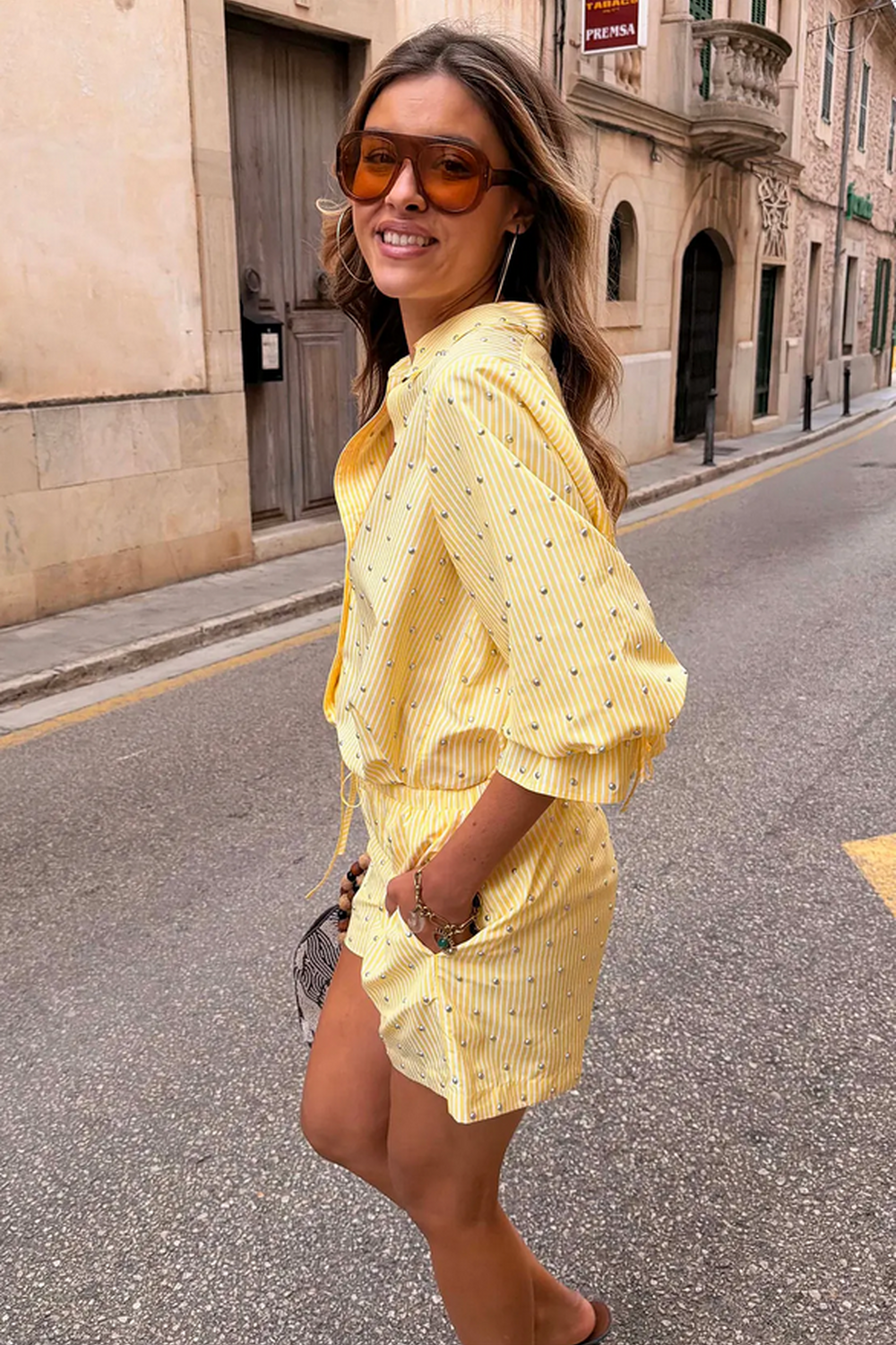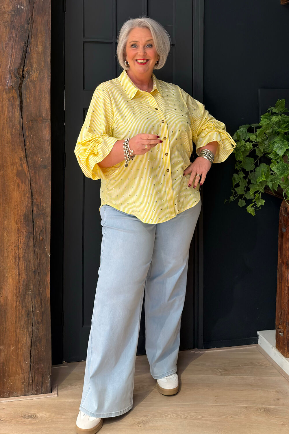 Blouse met een frisse citroenkleurige streepprint, knoopsluiting, strikceintuur in de taille en elastische boorden voor makkelijke stylingopties. Wasvoorschriften: Alleen handwas met koud water.