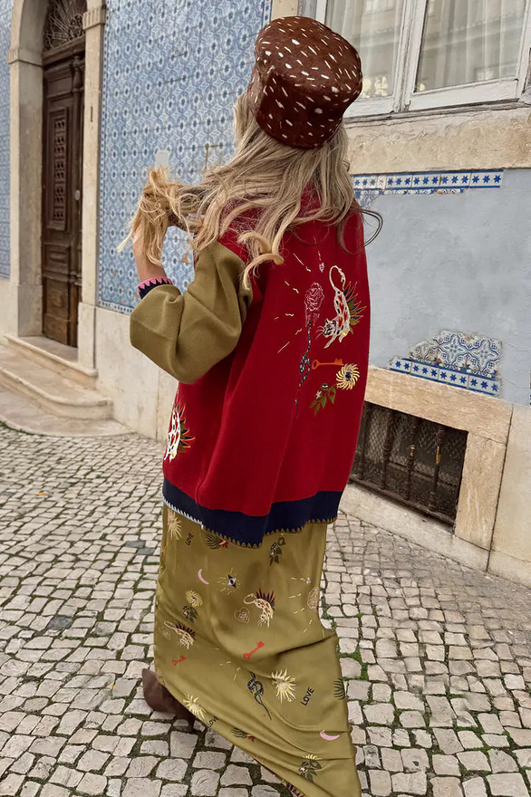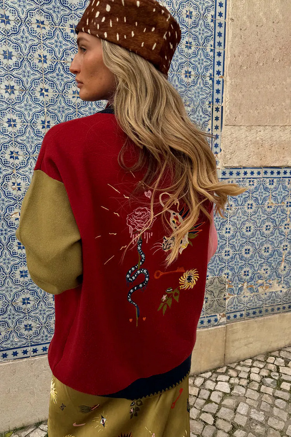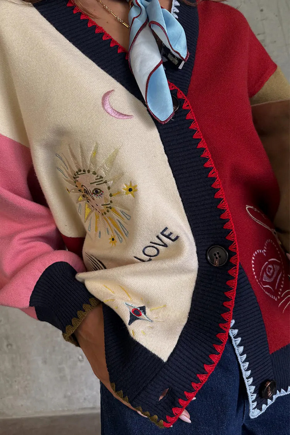 Zware, gebreide trui met knoopsluiting en geborduurde motieven op een veelkleurige basis. De contrasterende stiksels aan de zomen zorgen voor een extra vleugje textuur.