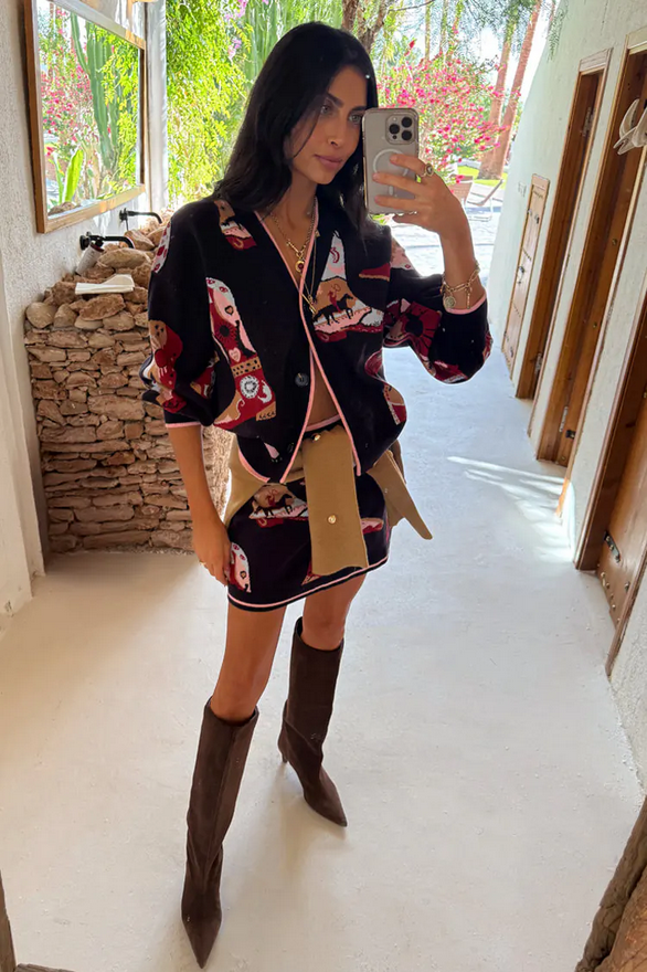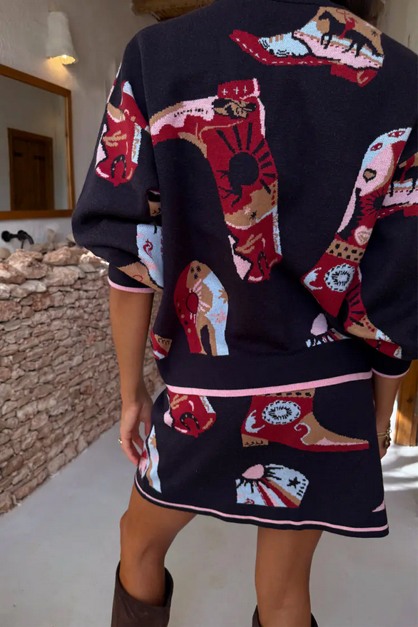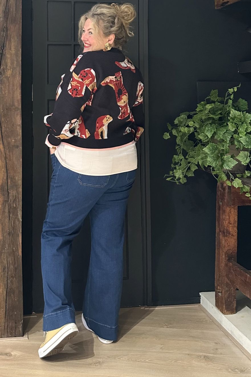 Zwaar, gebreid vest voorzien van cowboylaarzen en cowgirlmotieven op een navy blauwe basis. De contrasterende roze details aan de zomen zorgen voor een extra vleugje kleur. Bevat knoopsluiting. Wasvoorschrift: op 30 graden wassen