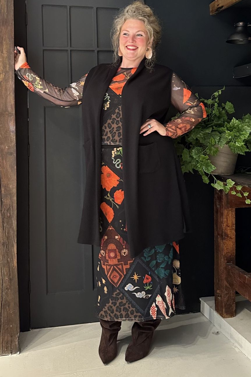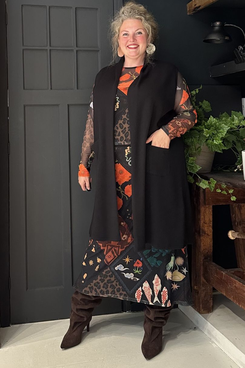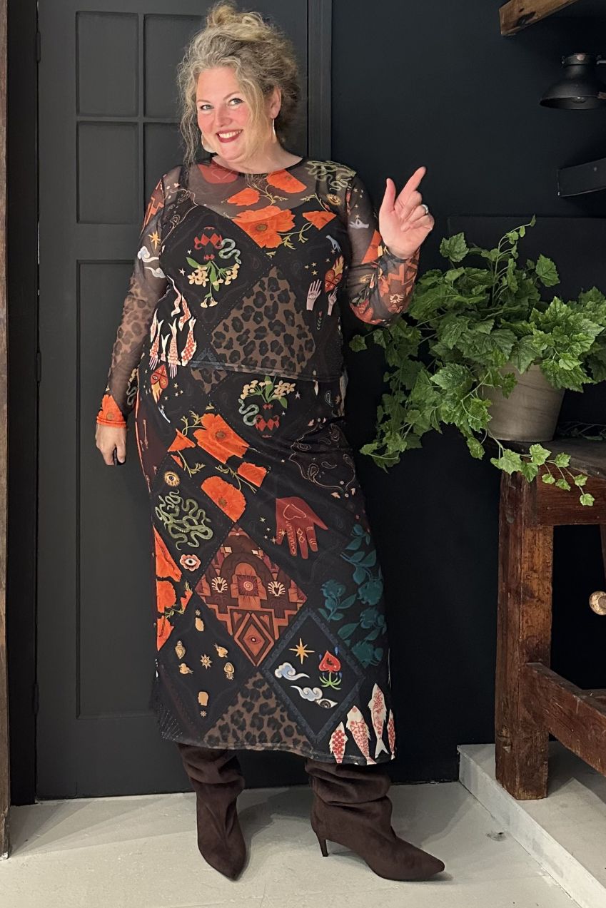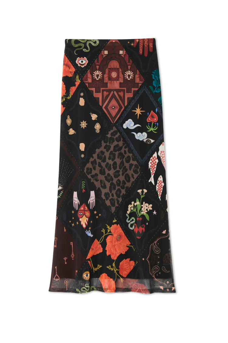 Rekbare lange rok met vrolijke motieven in mesh stof.