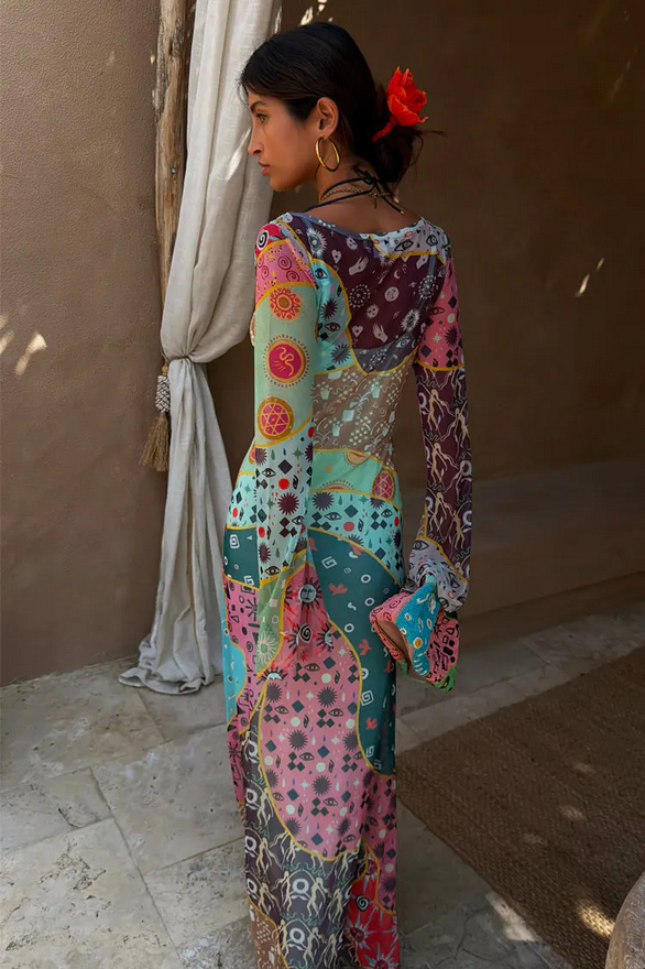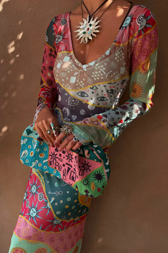 Jurk gemaakt van meshstof in de nieuwe Marokko-print, effen kleuren met diverse motieven, waaronder onze zon-, oog- en palmprint. Bevat een onderjurk. Wasvoorschrift: op 30 graden wassen.