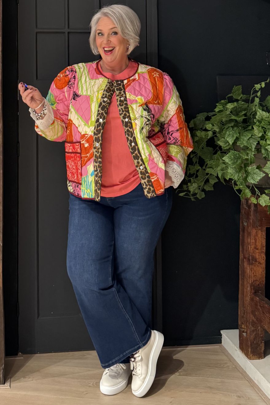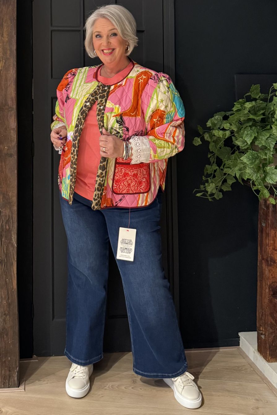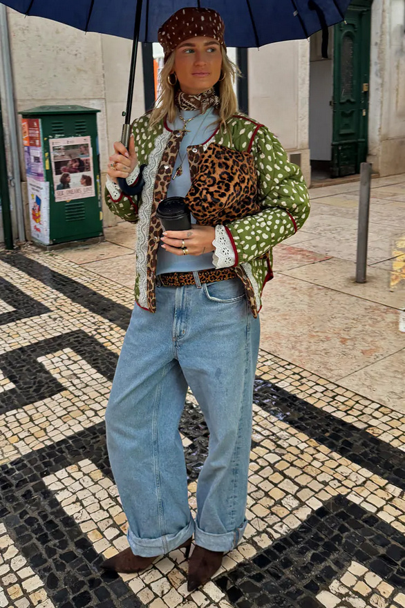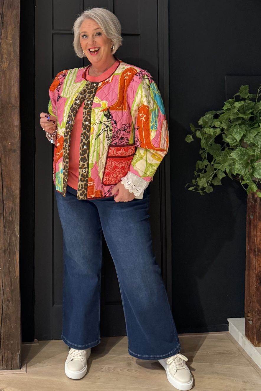 Jas met roze Dallas-print met abstracte cowboy-silhouetten en cowgirl-motieven die omkeerbaar is tot een schitterende hertenprint met bordeauxrode details. Met subtiele accenten van een luipaardprint en verfijnde kanten details langs de manchetten die toevoegen aan de gewatteerde structuur. Bevat voorzakken en drukknoopsluiting. Wasvoorschrift: 30 graden wassen