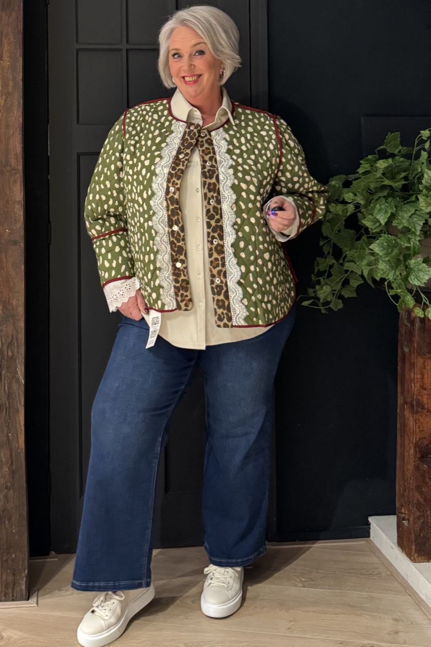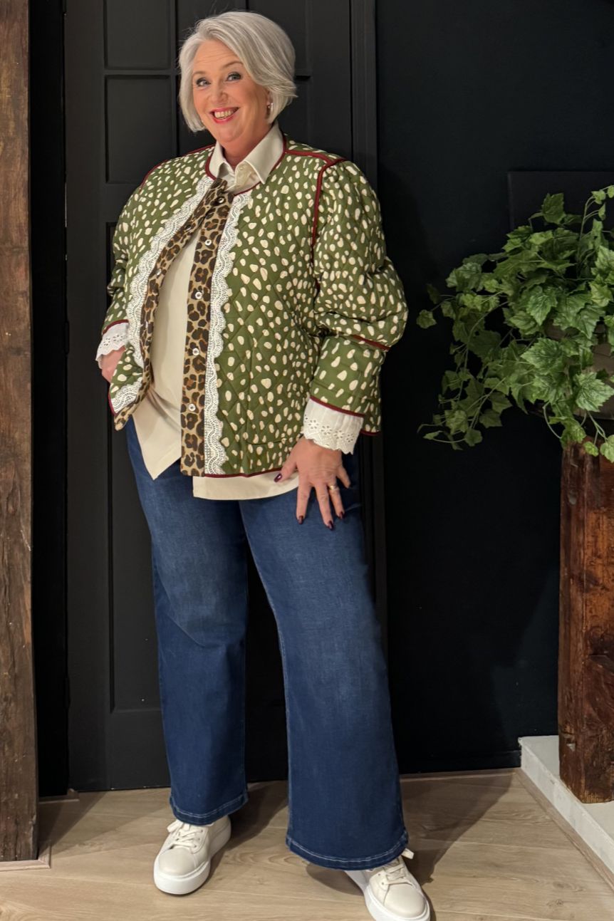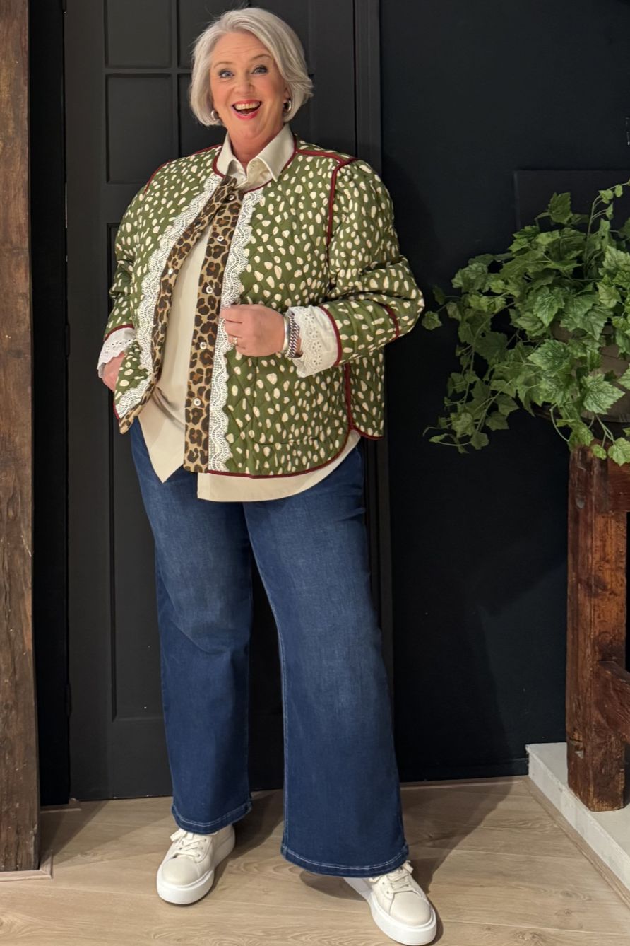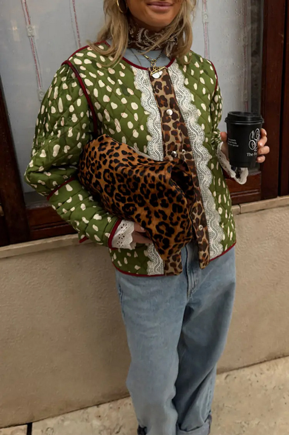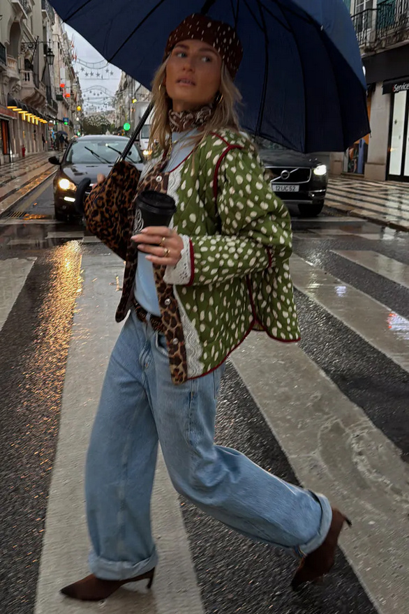 Jas met roze Dallas-print met abstracte cowboy-silhouetten en cowgirl-motieven die omkeerbaar is tot een schitterende hertenprint met bordeauxrode details. Met subtiele accenten van een luipaardprint en verfijnde kanten details langs de manchetten die toevoegen aan de gewatteerde structuur. Bevat voorzakken en drukknoopsluiting. Wasvoorschrift: 30 graden wassen