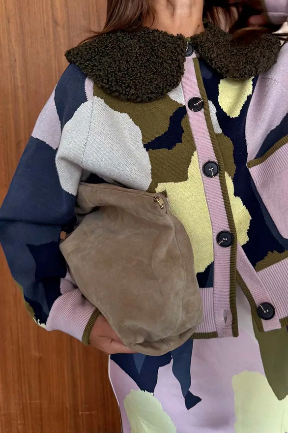 Vest met neutrale aardetinten, zachte basis, knoopsluiting en afneembare wollen kraag die een vleugje textuur toevoegt aan het silhouet.