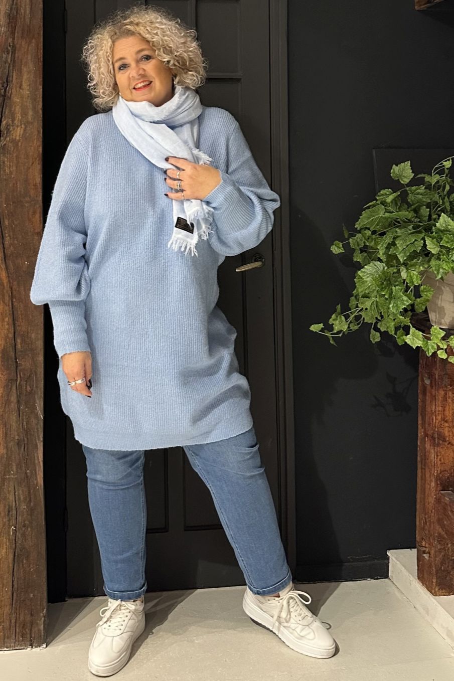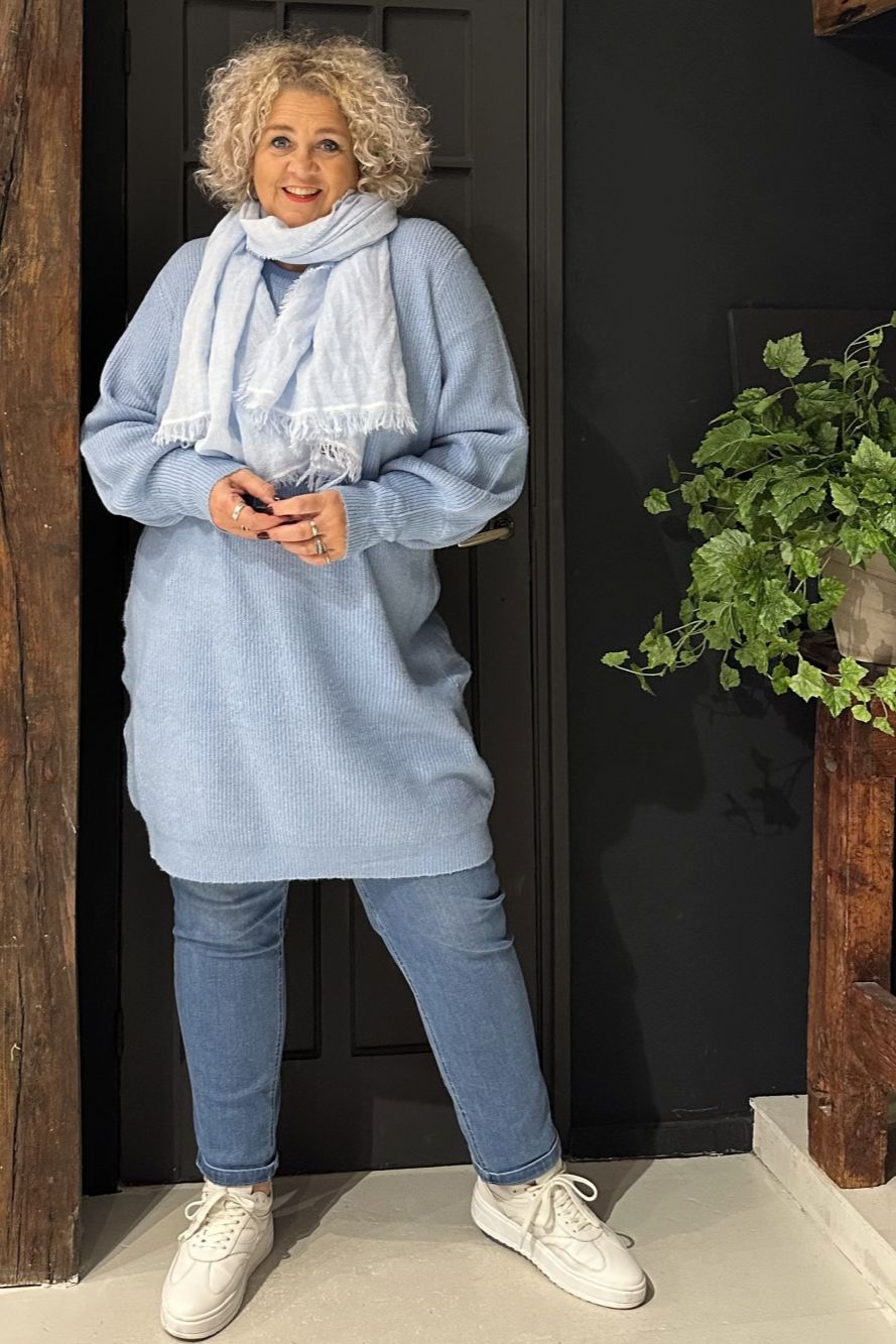 Eenvoudige en stijlvolle gebreide jurk. De jurk heeft lange mouwen en ribboorden bij de mouwuiteinden, wat een elegant ballon-effect creëert. Draag de gebreide jurk met panty's, leggings of voeg je favoriete broek toe. Deze klassieke en tijdloze gebreide jurk is een veilige keuze het hele jaar door en geschikt voor elke gelegenheid.