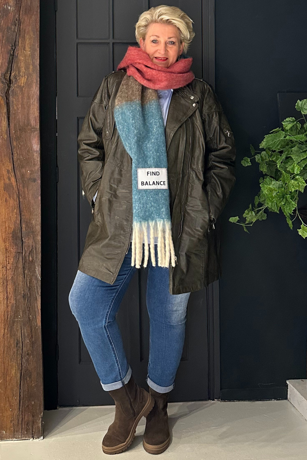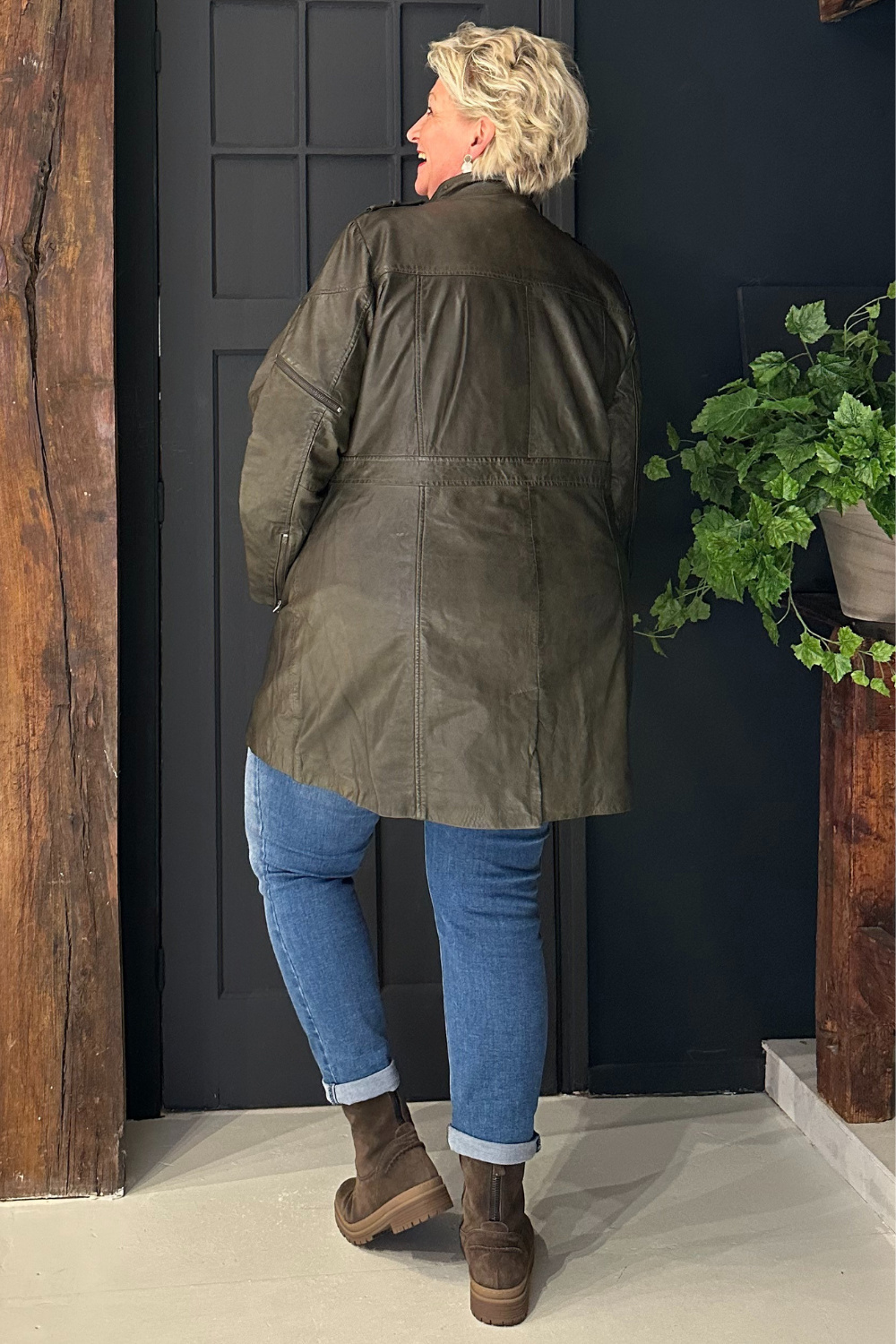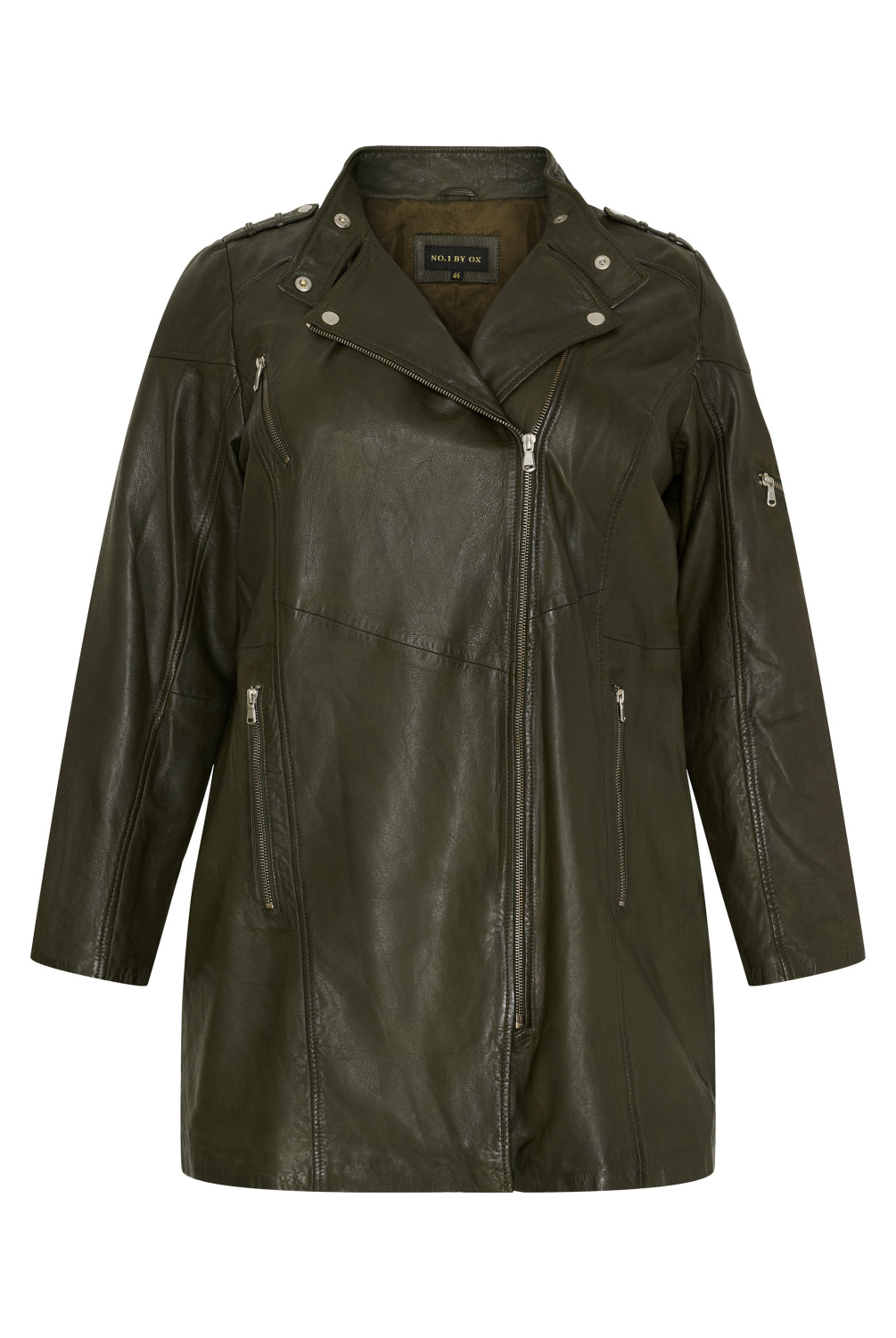 Lange leren jas in een raw-look. Hij heeft een schuine rits aan de voorkant. De jas heeft ritszakken op de mouw, op de borst en gewone zijzakken. Schouder- en polsbanden geven de jas een bijzonder accent. Open kraag die gesloten kan worden, en twee drukknopen bij de hals. Een ruwe en coole leren jas die meerdere seizoenen trendy zal blijven. Opmerking: Pasvorm: Regular Fit Afmetingen: 92 cm langs de voorkant, borstomvang 140 cm in maat 52 Materiaal: 100% lamsleer | Voering: 100% polyester Reiniging: Niet wassen. Chemische reiniging door een leerspecialist. Levensduur van het product.