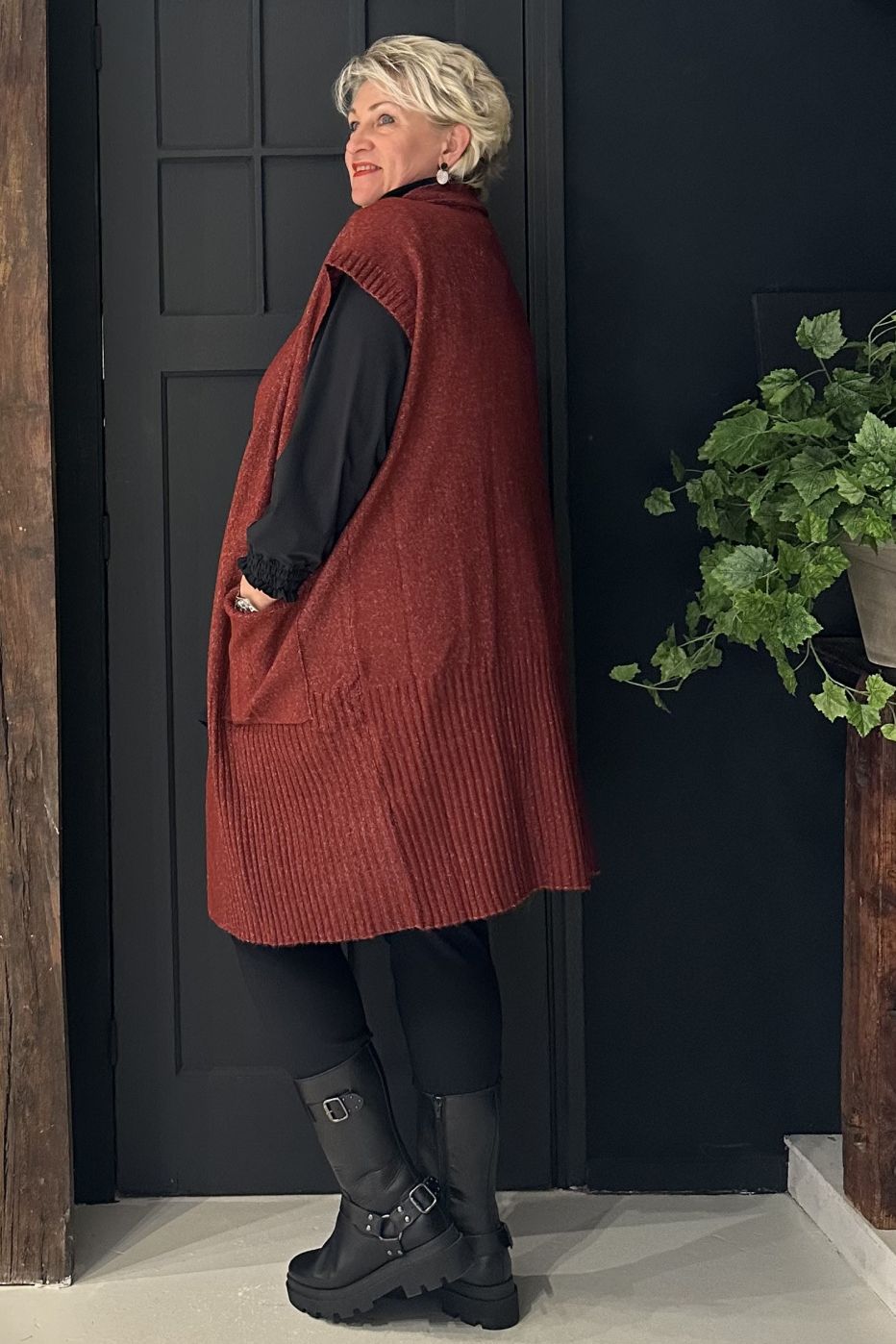 Lang gebreide cardigan zonder mouwen in een heerlijk zachte en rekbare kwaliteit. De cardigan heeft een open voorkant en een broekzak aan elke kant. Een casual, maar stijlvolle cardigan die perfect is om over je basic lange mouwen truien te dragen. Maten: Meet 94 cm langs de voorkant, borstomtrek 124 cm in maat M (46-48)