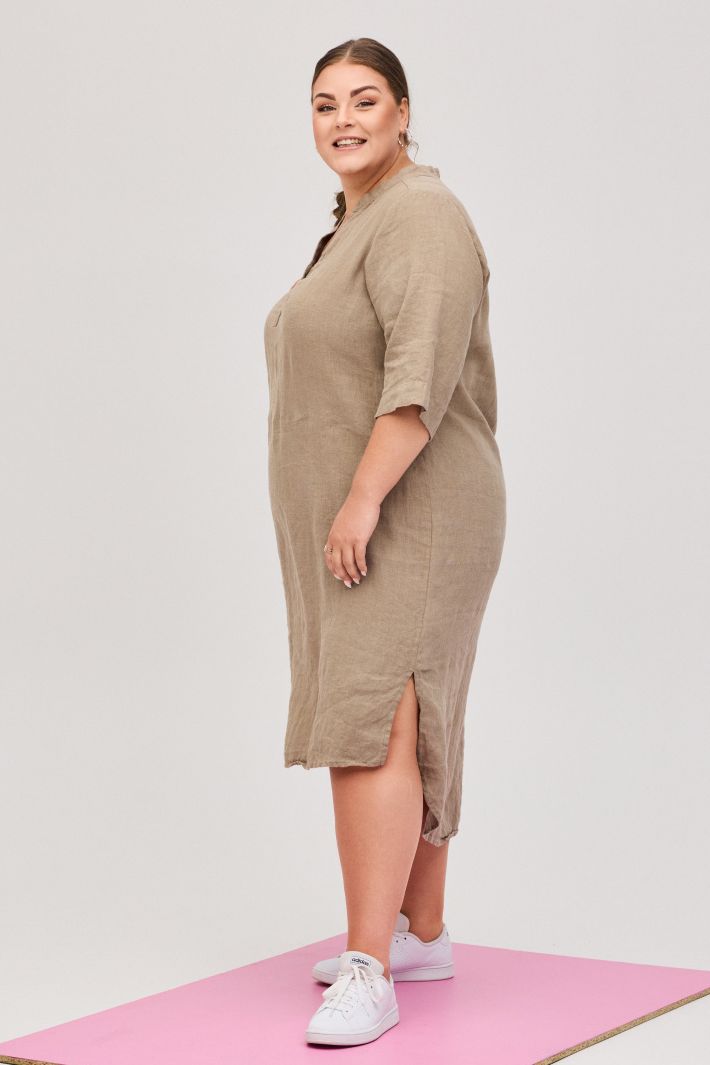 Tuniek in een lichte kwaliteit van 100% linnen met mouwen. Daarnaast heeft de tuniek een V-halslijn, splitten in de zijkanten, plooien op de rug en een langer, afgerond achterstuk.