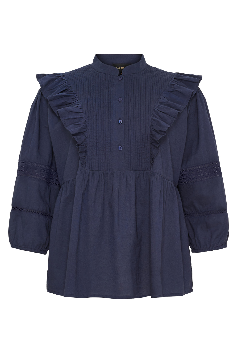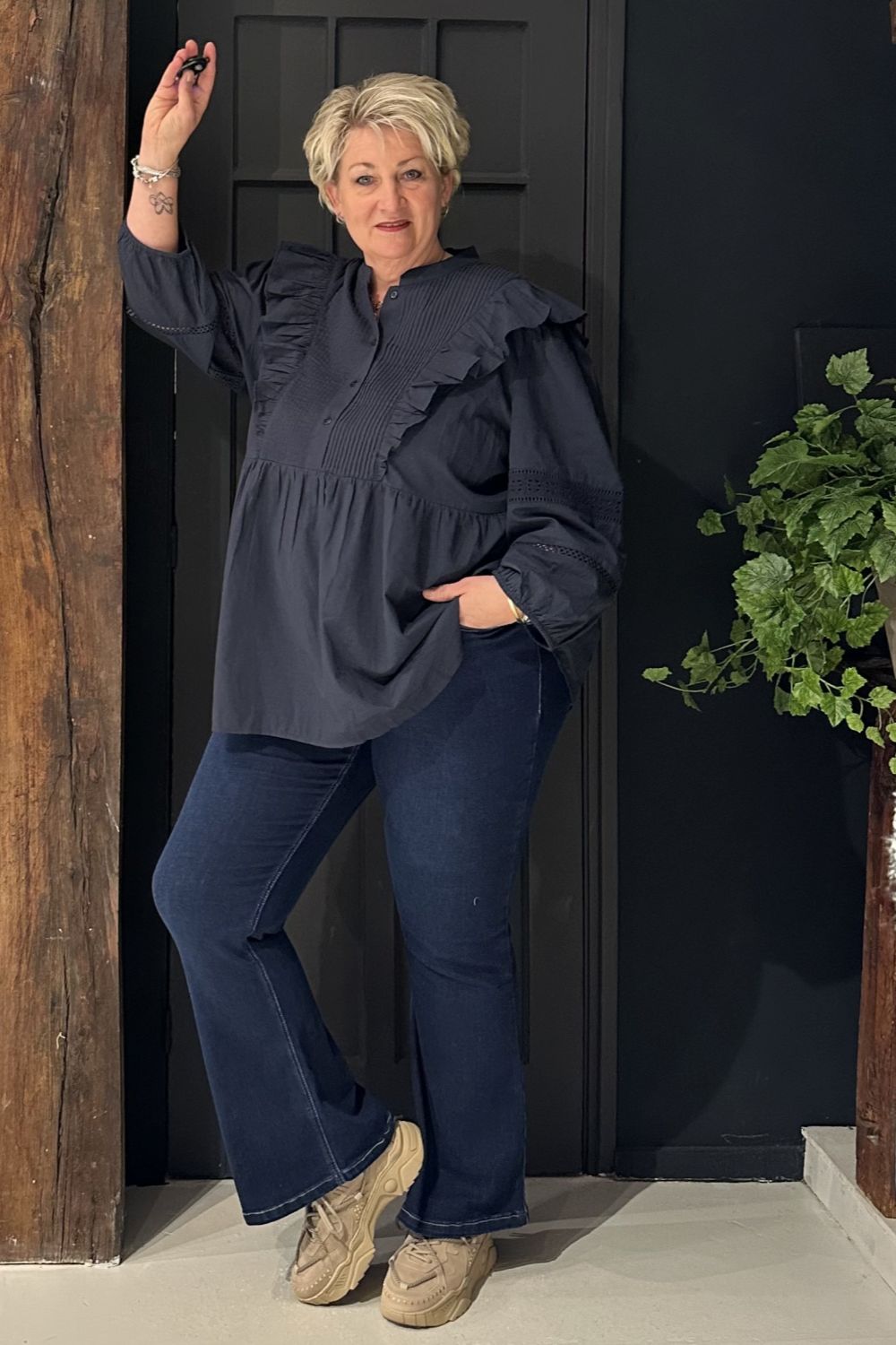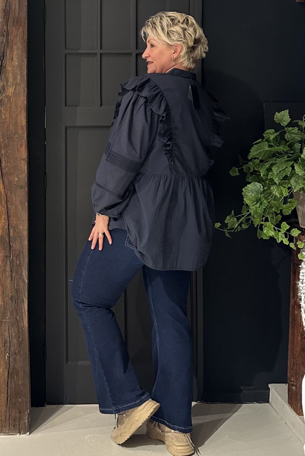 Geef je look een vrouwelijke flair met deze mooie blouse. Ruches op de schouders en op de borst zorgen voor een elegante uitstraling, terwijl 3/4-mouwen met borduurdetails een verfijnde touch geven. Fijne kleine plooien en een knoopsluiting maken deze blouse tot een stijlvolle en comfortabele metgezel voor elke gelegenheid.