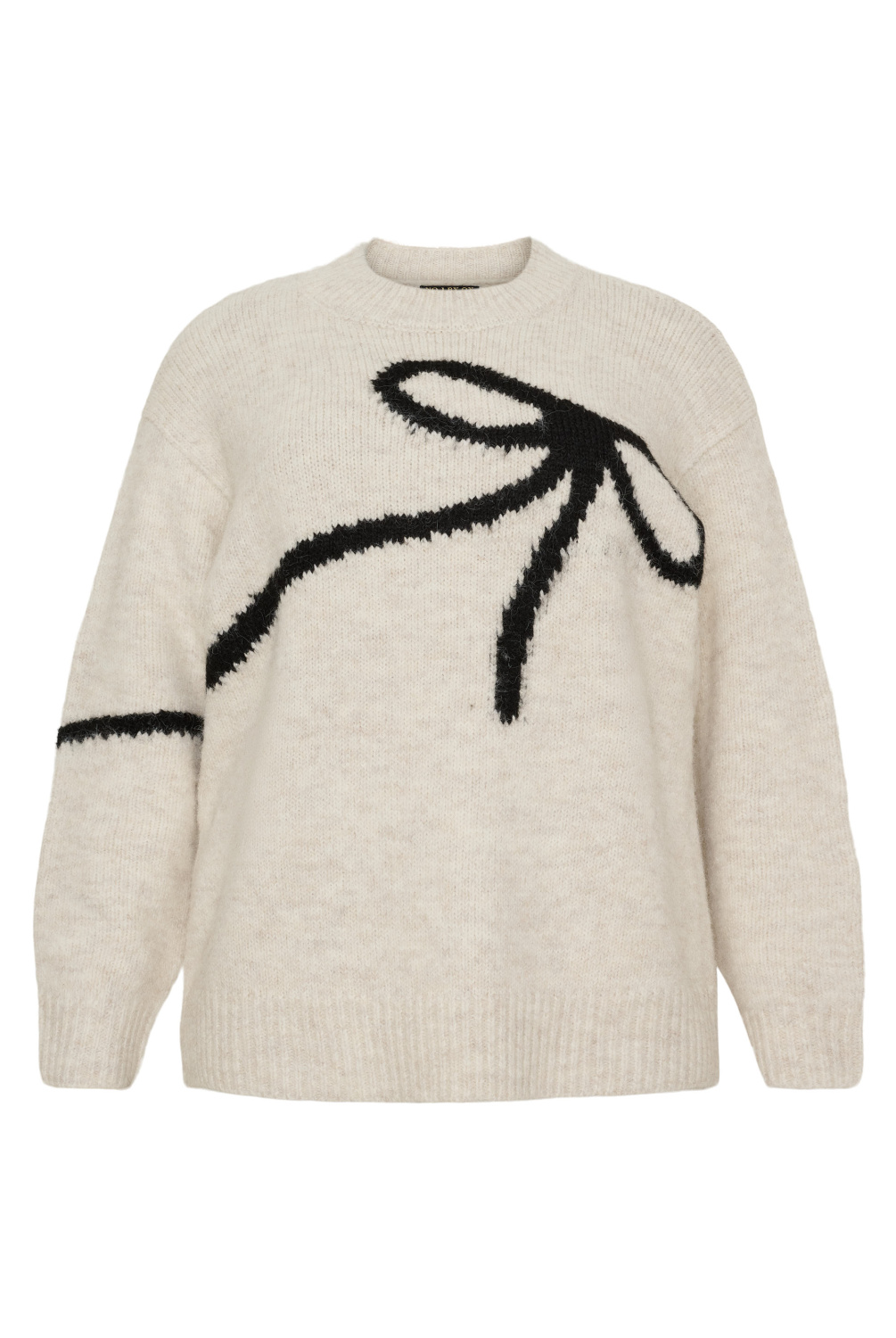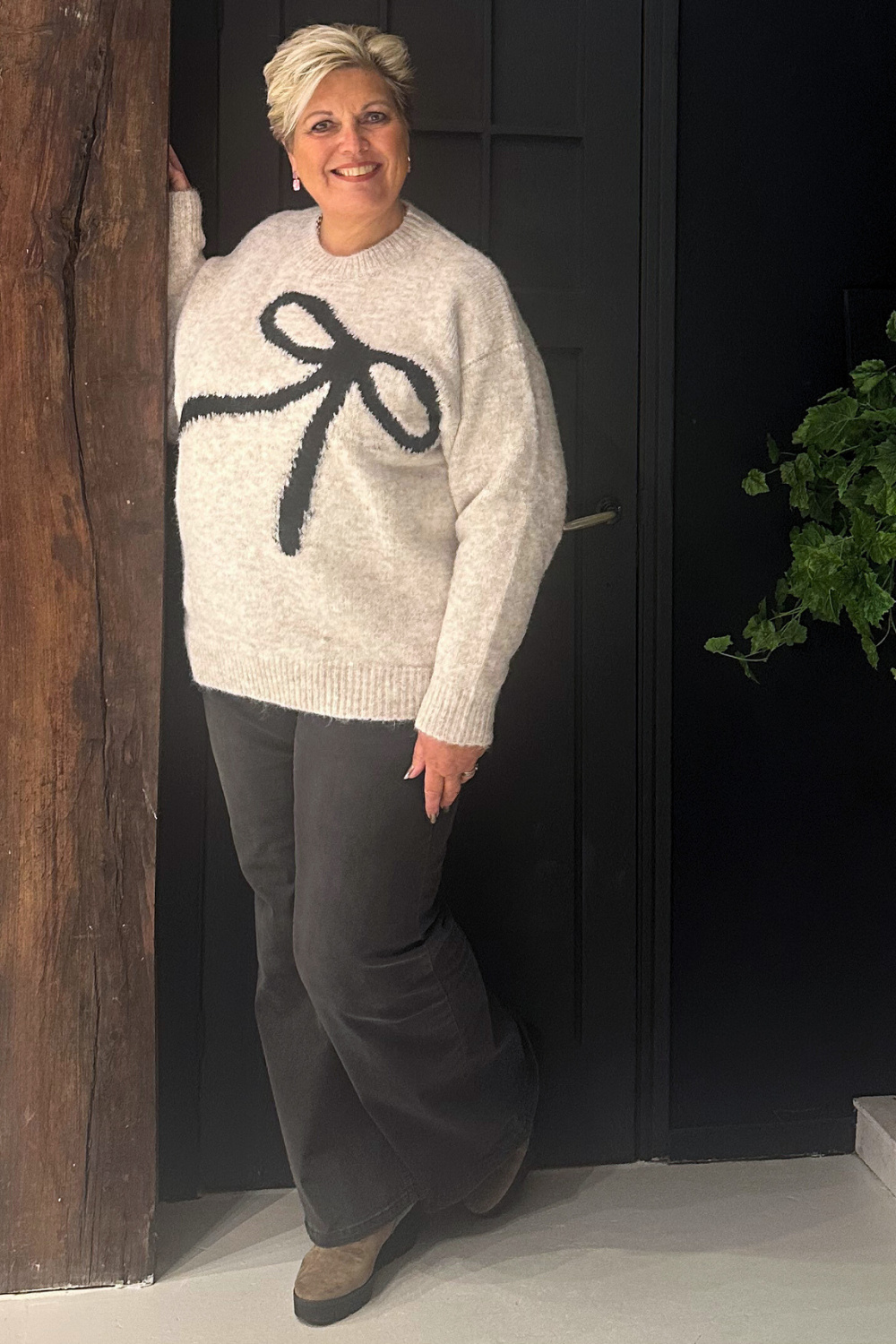 Zachte en stijlvolle trui van gebreide stof in een heerlijke melangekwaliteit. De trui is ontworpen in een lichte crèmekleur met een opvallend zwart strikdetail, dat een vrouwelijke en moderne uitstraling geeft. Hij heeft een ronde hals, lange mouwen en een ontspannen pasvorm, waardoor hij zowel comfortabel als gemakkelijk te combineren is voor dagelijks gebruik. Perfect voor de koele dagen waarop comfort en stijl hand in hand moeten gaan.