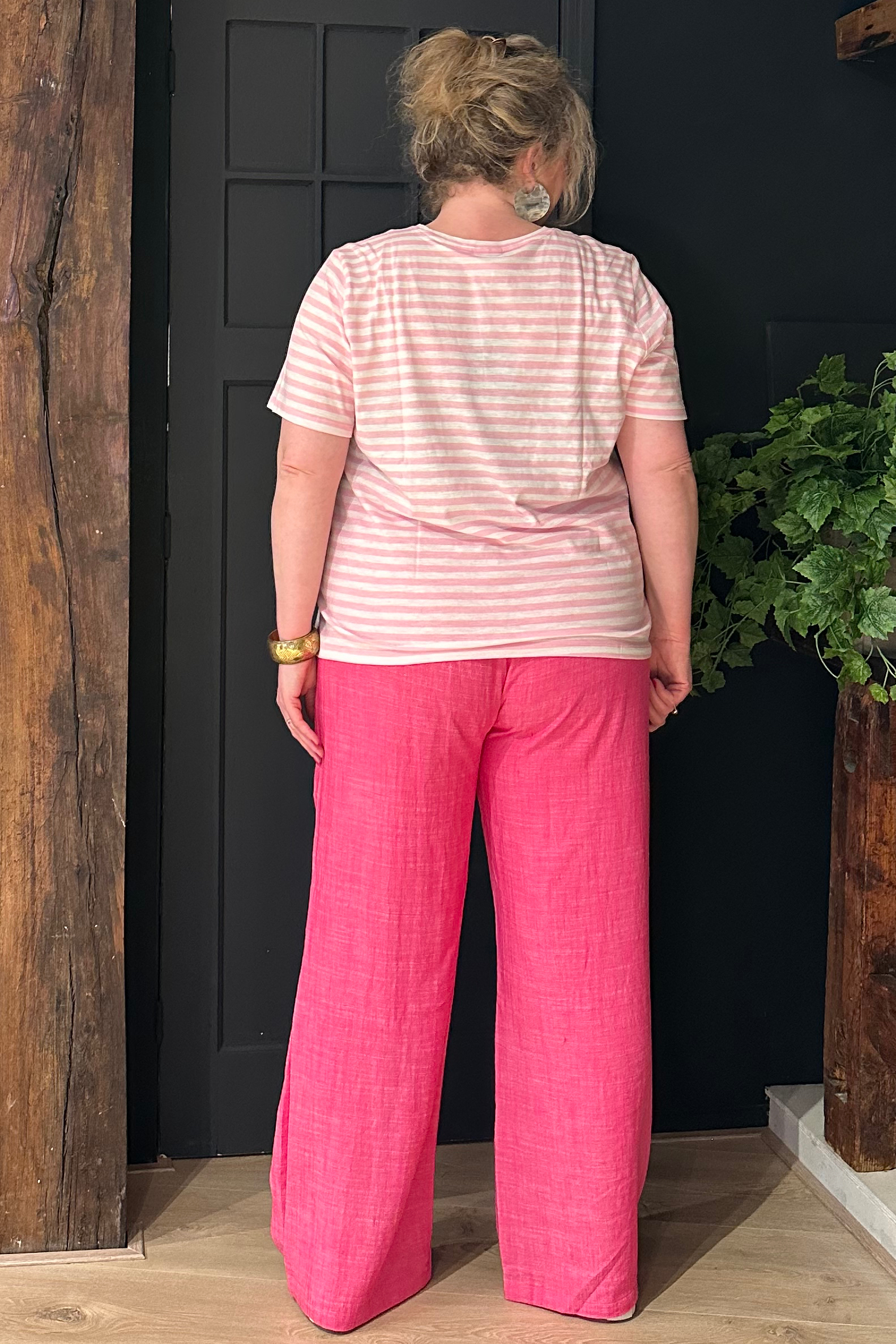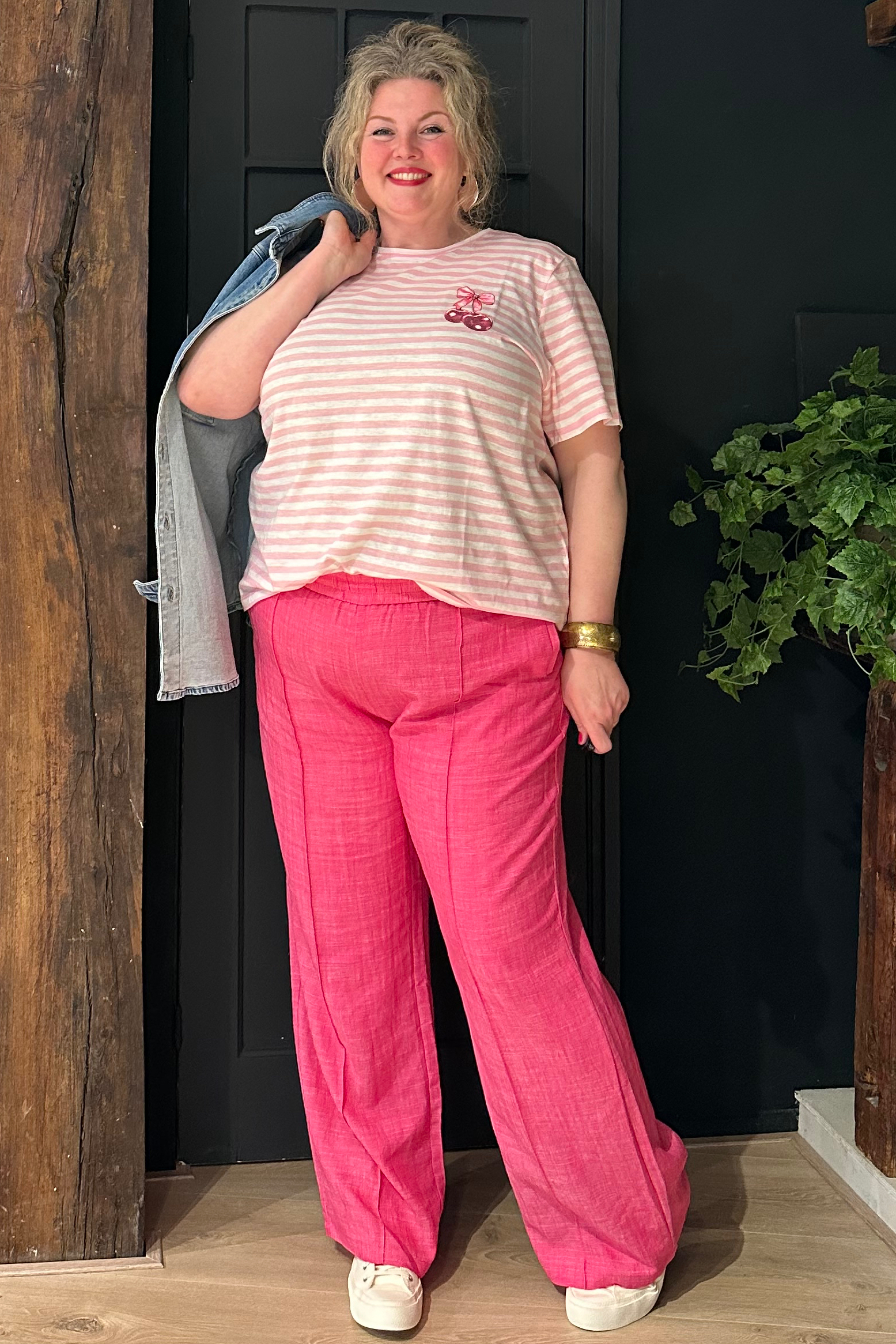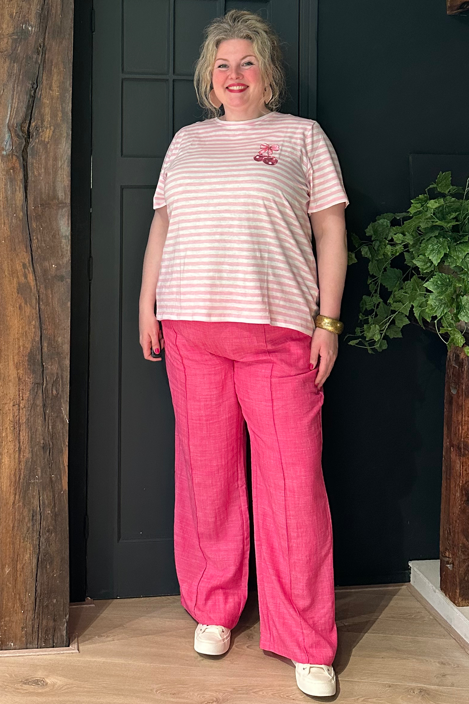 Gestreept jersey t-shirt met glitter kersjes. Hij valt goed op maat, maar als je een shirt wilt wat meer oversized valt, raden we je aan een maat groter te bestellen.