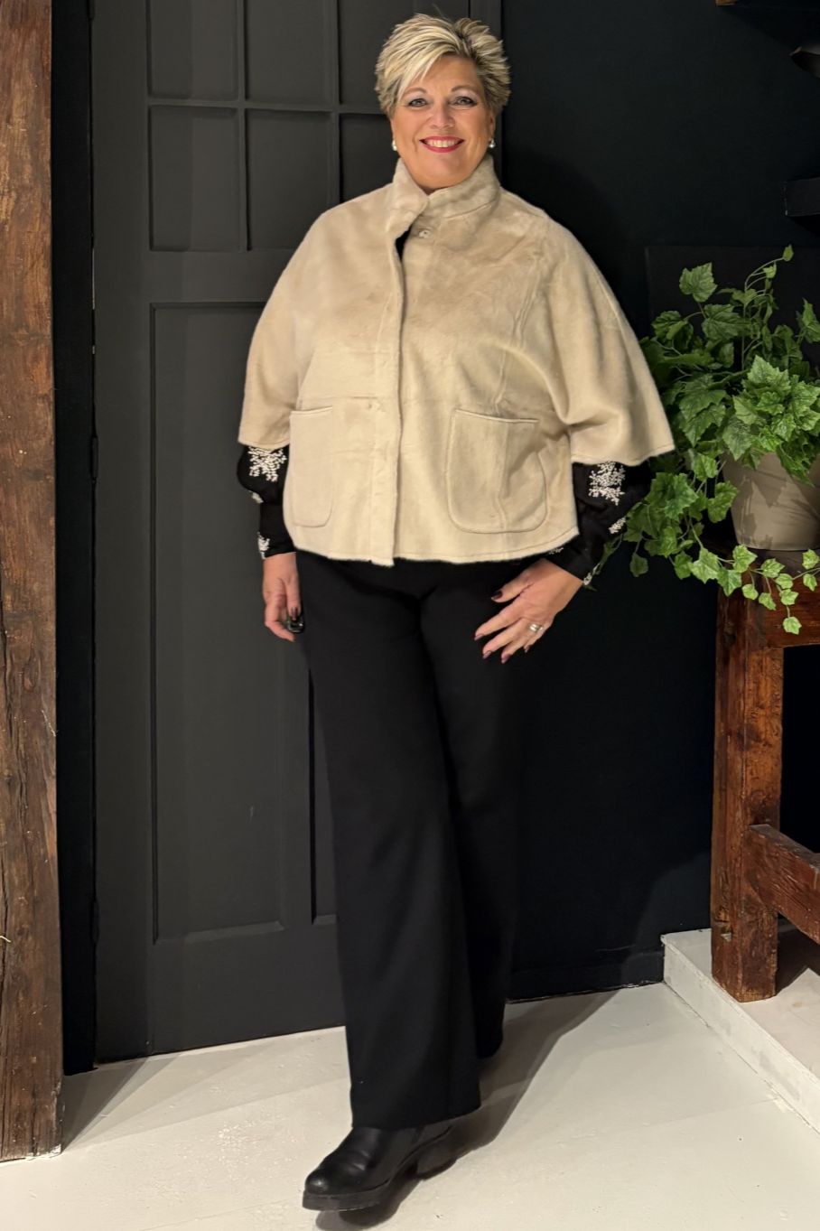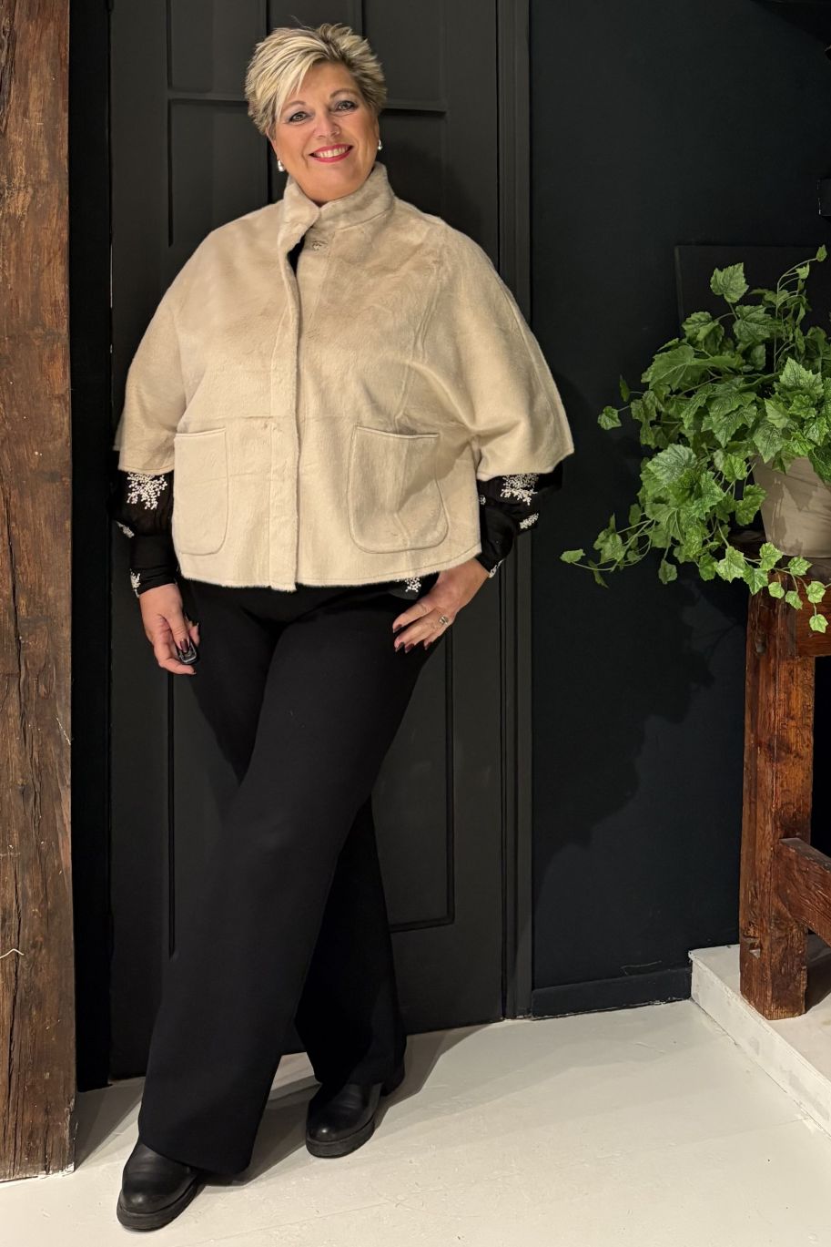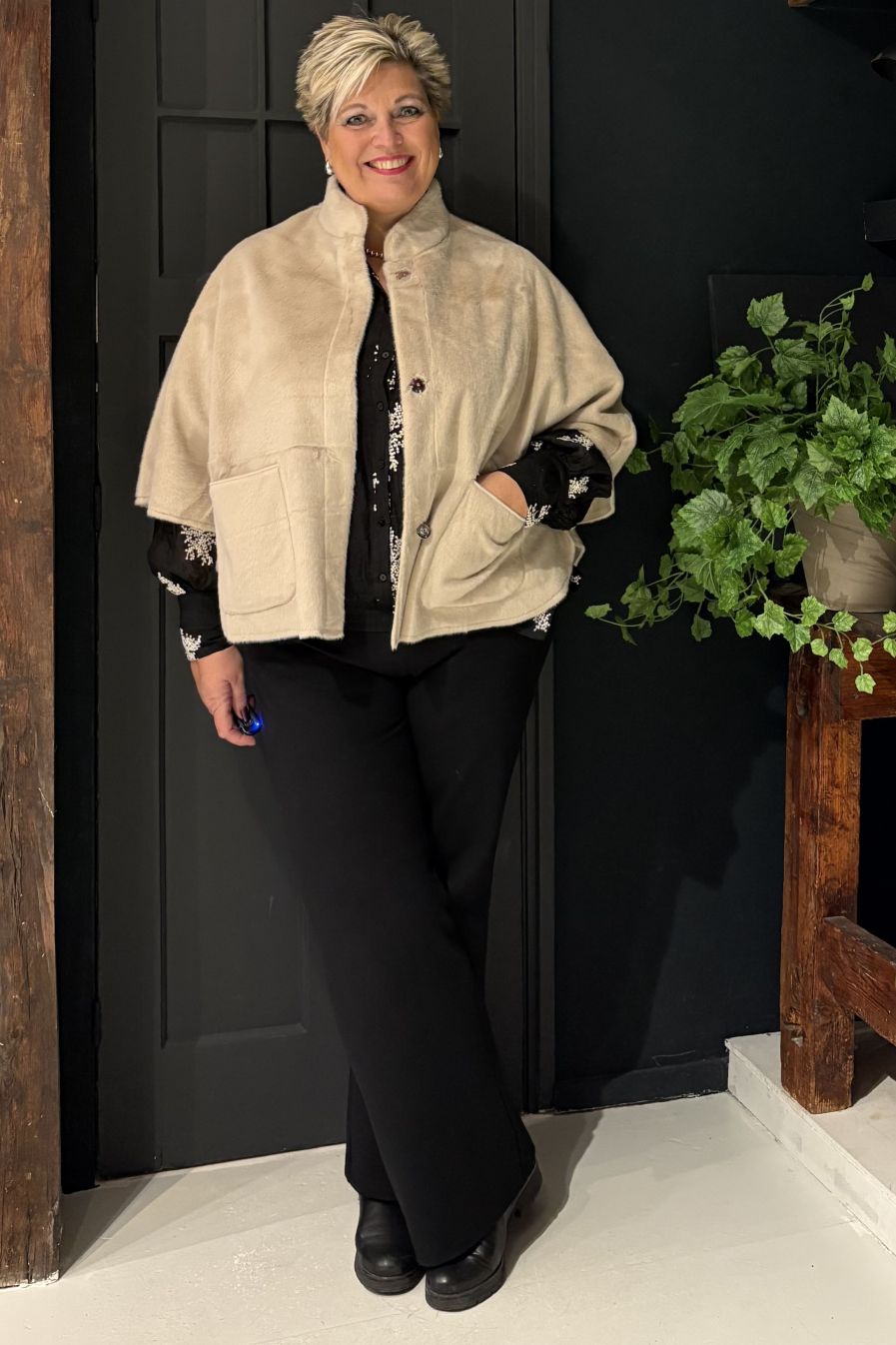 Cape met drukkersluiting aan de voorzijde èn zijkant. Twee zakjes.