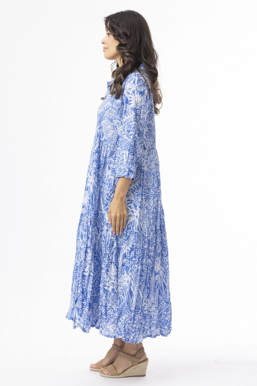 Maak kennis met onze Aksharay Blue Midi Jurk! Dit opvallende item heeft een speelse mix van print en kleur, waardoor het ideaal is voor zonnige dagen. Met de ontspannen pasvorm, gelaagde rok, klassieke knoopsluiting, driekwart mouwen en ademende stof blijf je het hele seizoen comfortabel en stijlvol. Klassieke kraag Midlengte3/4 mouwen Doorgeknopte sluiting 100% biologische katoen Koud met de hand wassen
