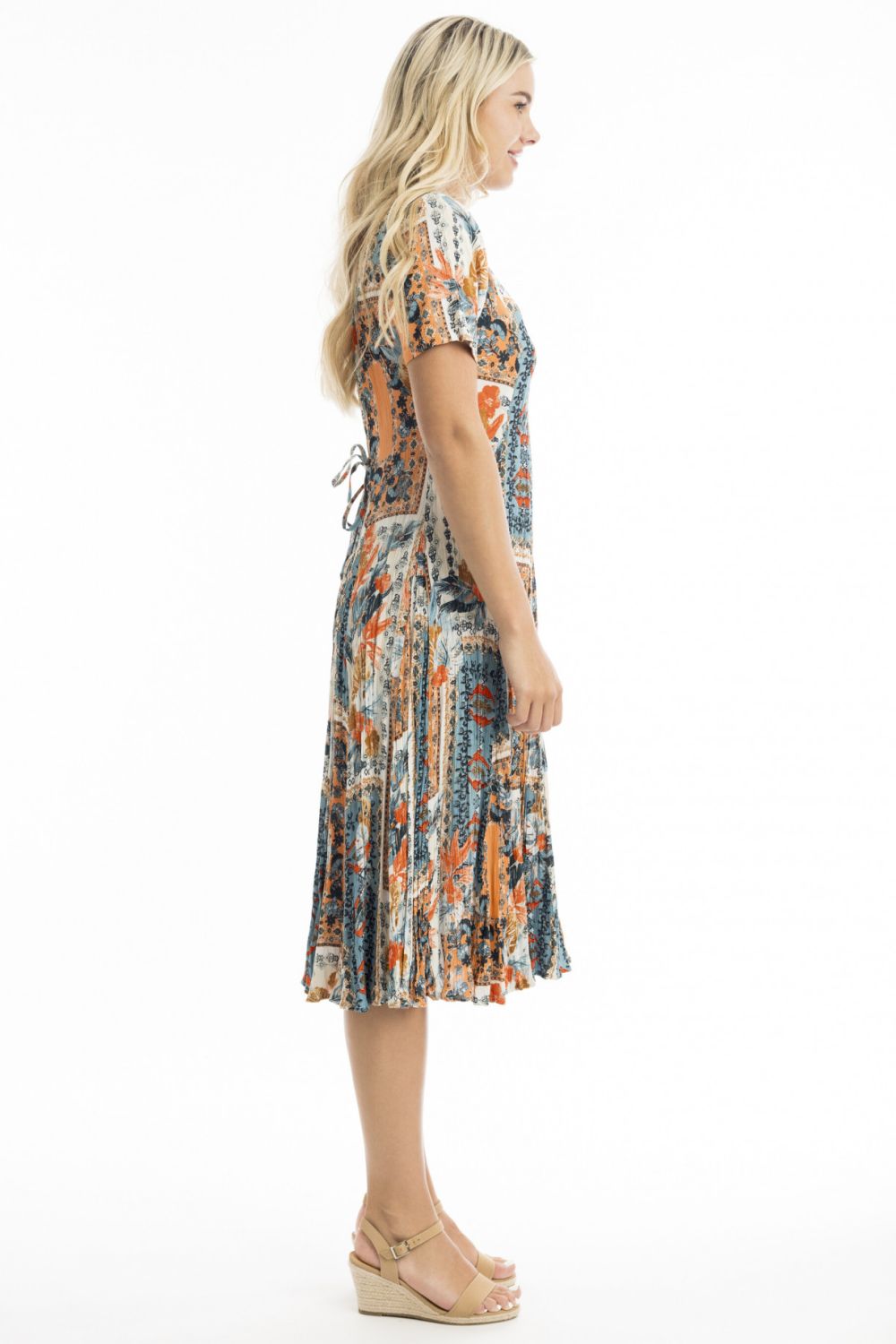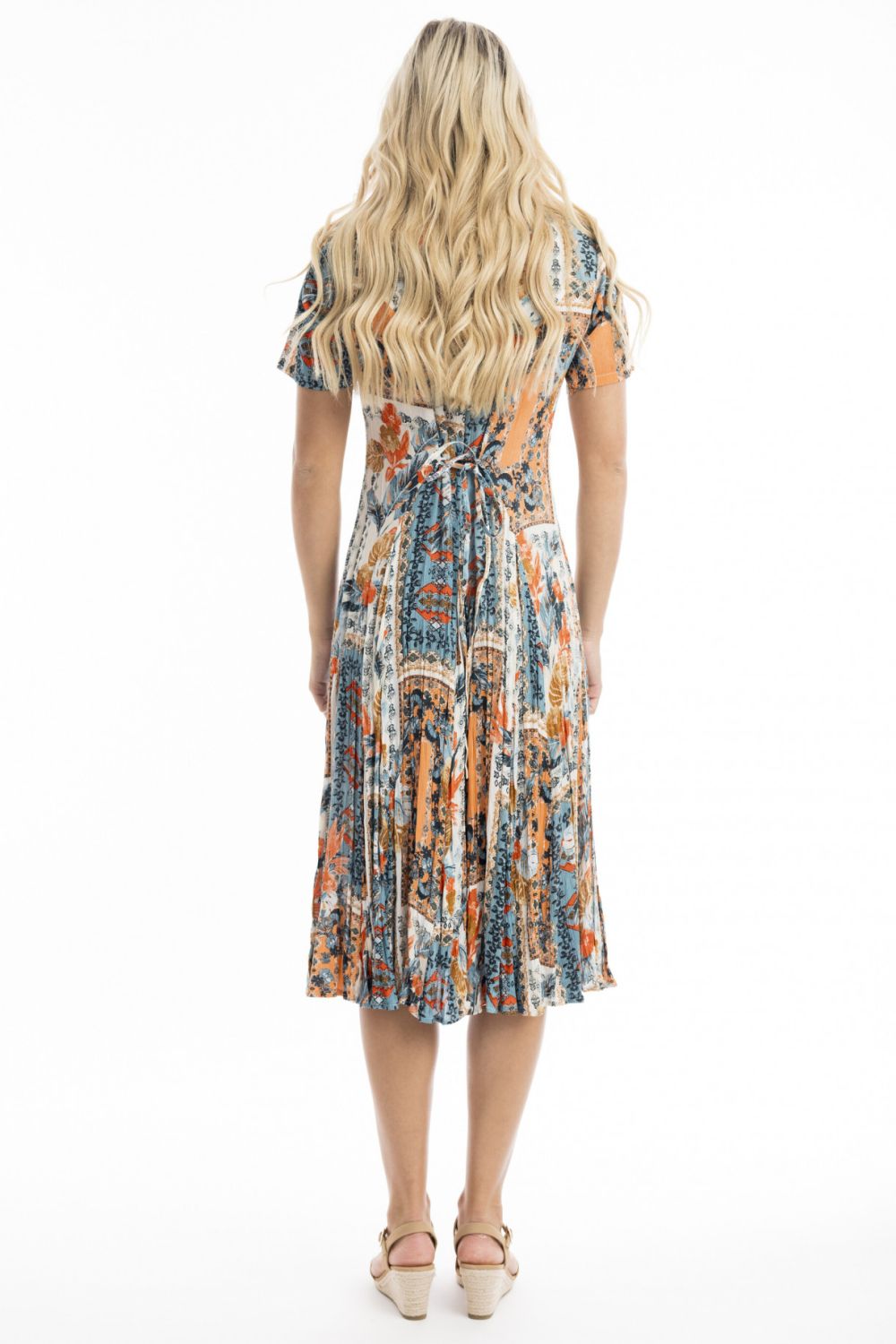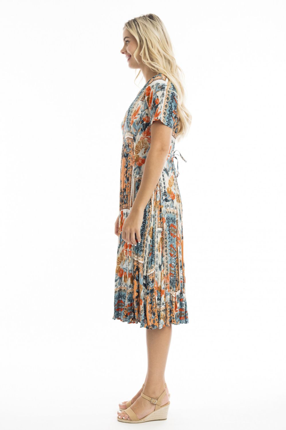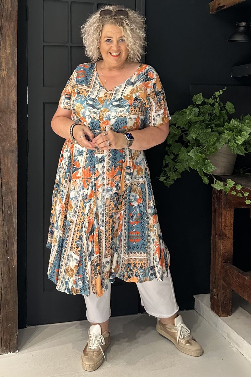 Blijf cool en stijlvol met onze kleurrijke Godet-jurk. Het is gemaakt van natuurlijke vezels en heeft korte mouwen, een flatterende v-halslijn, een prachtige kleurrijke print en prachtige inzetstukken door de rok die de rok prachtig vallen en swingen. Deze jurk is ideaal om te genieten van warme zomerdagen en combineert comfort en stijl moeiteloos.