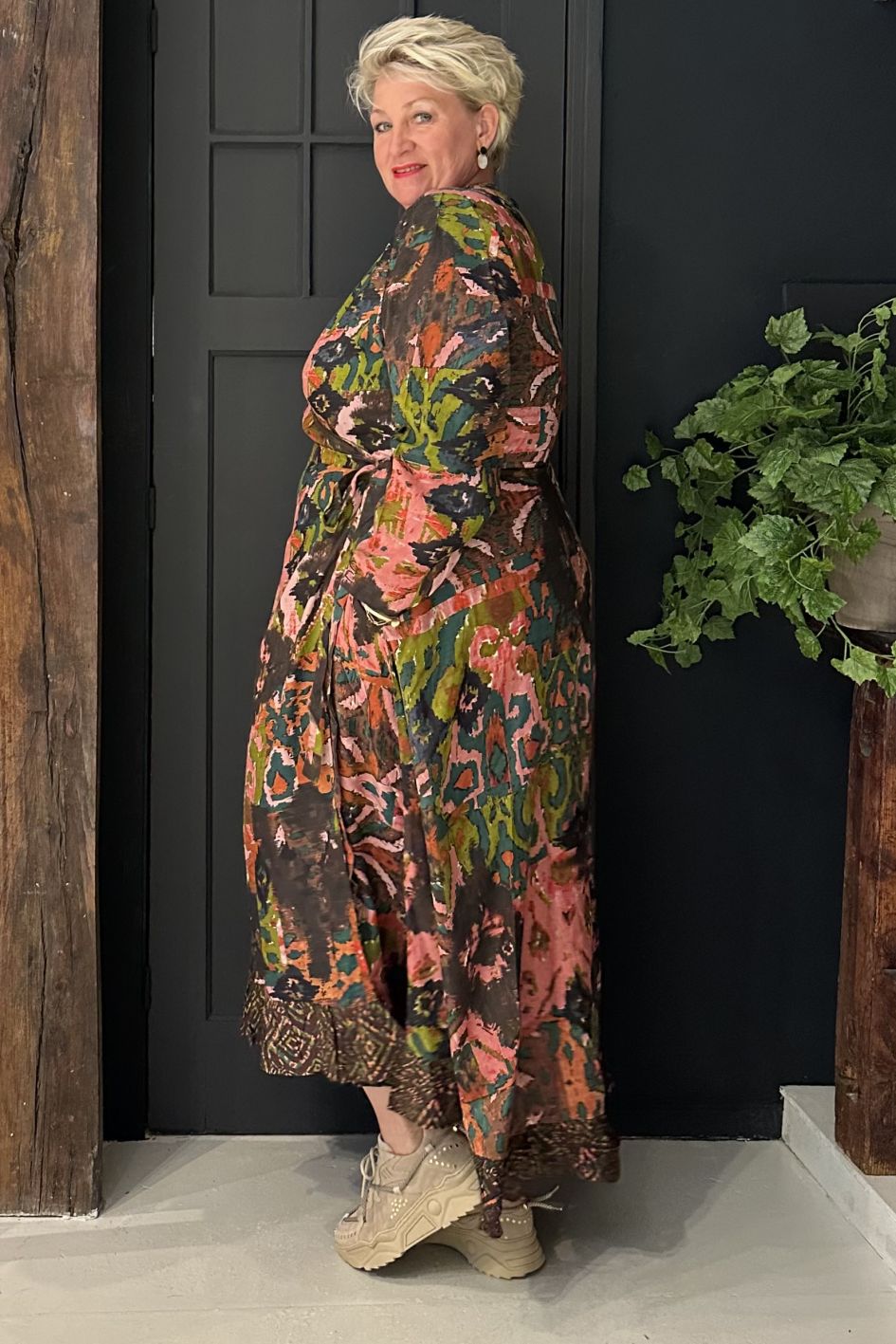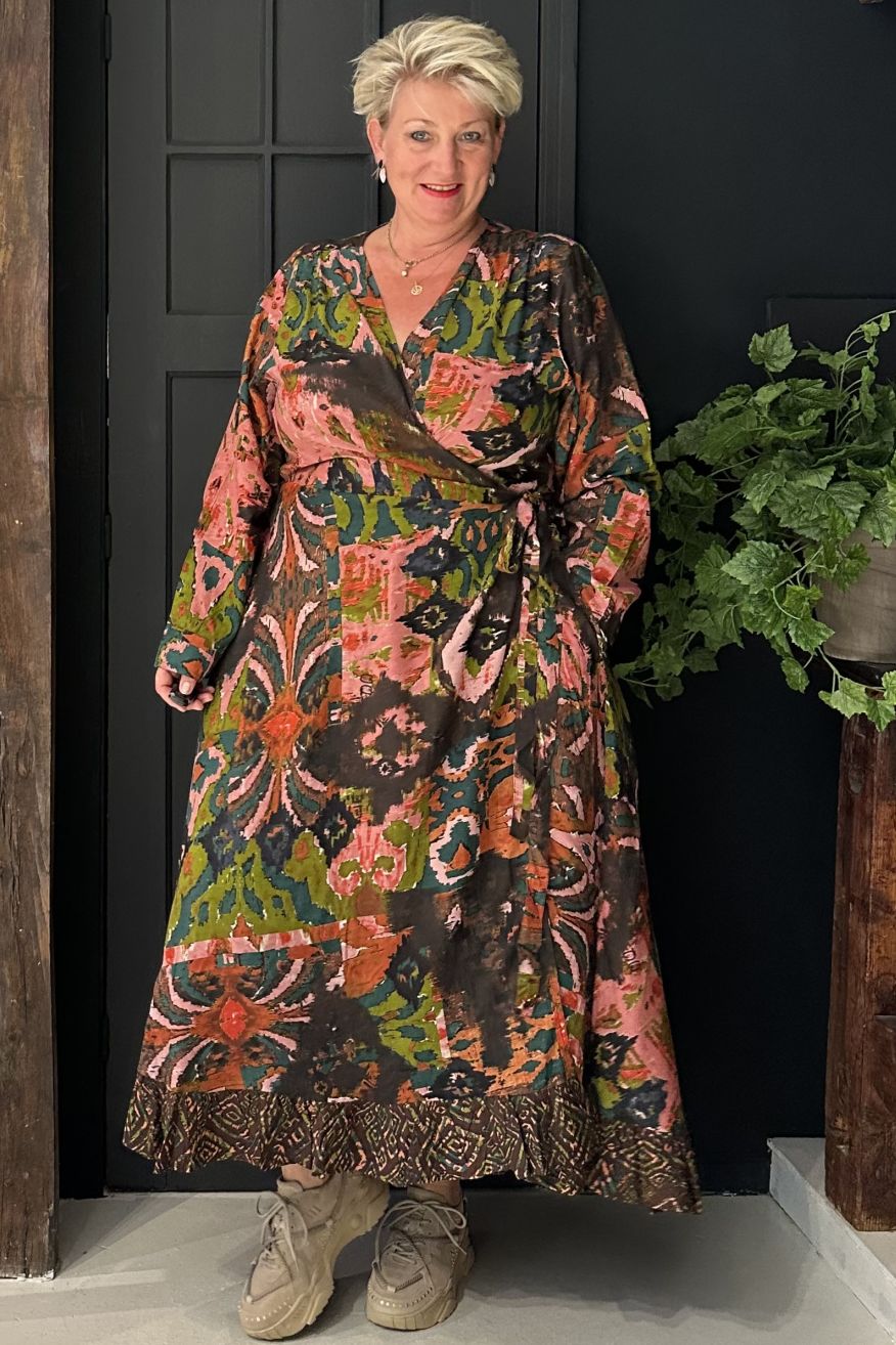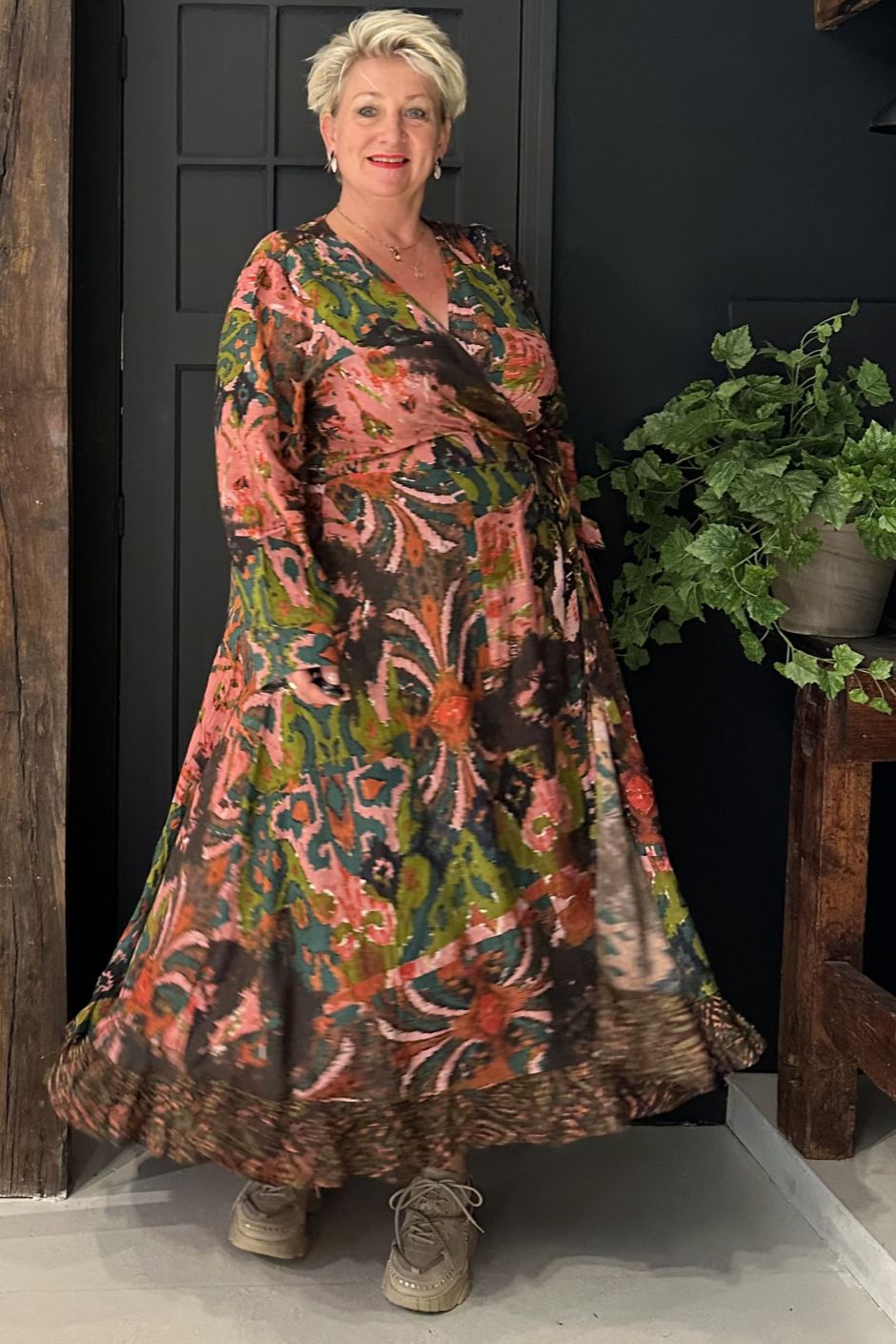 Deze wikkeljurk is elegant en veelzijdig. De wikkelstijl accentueert de taille en stroomt vervolgens over het lichaam in een volle rok met een geplooide zoom met ruches, waardoor een prachtige vorm en beweging ontstaat om het figuur te accentueren. De ingewikkelde bloemenprint, prachtige kleuren en het flatterende ontwerp zorgen ervoor dat je bij elke gelegenheid een statement maakt.