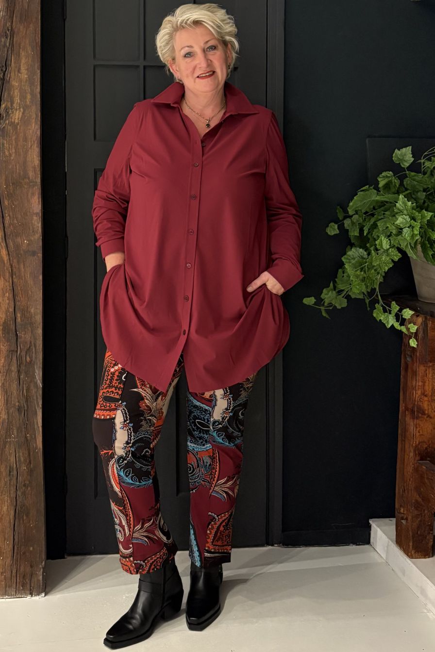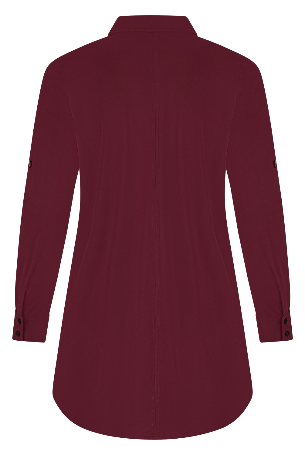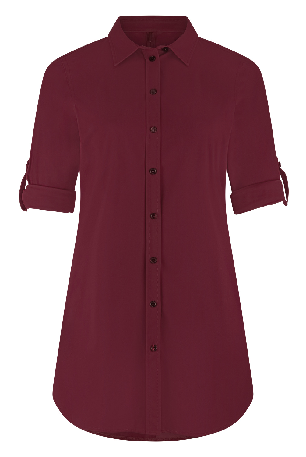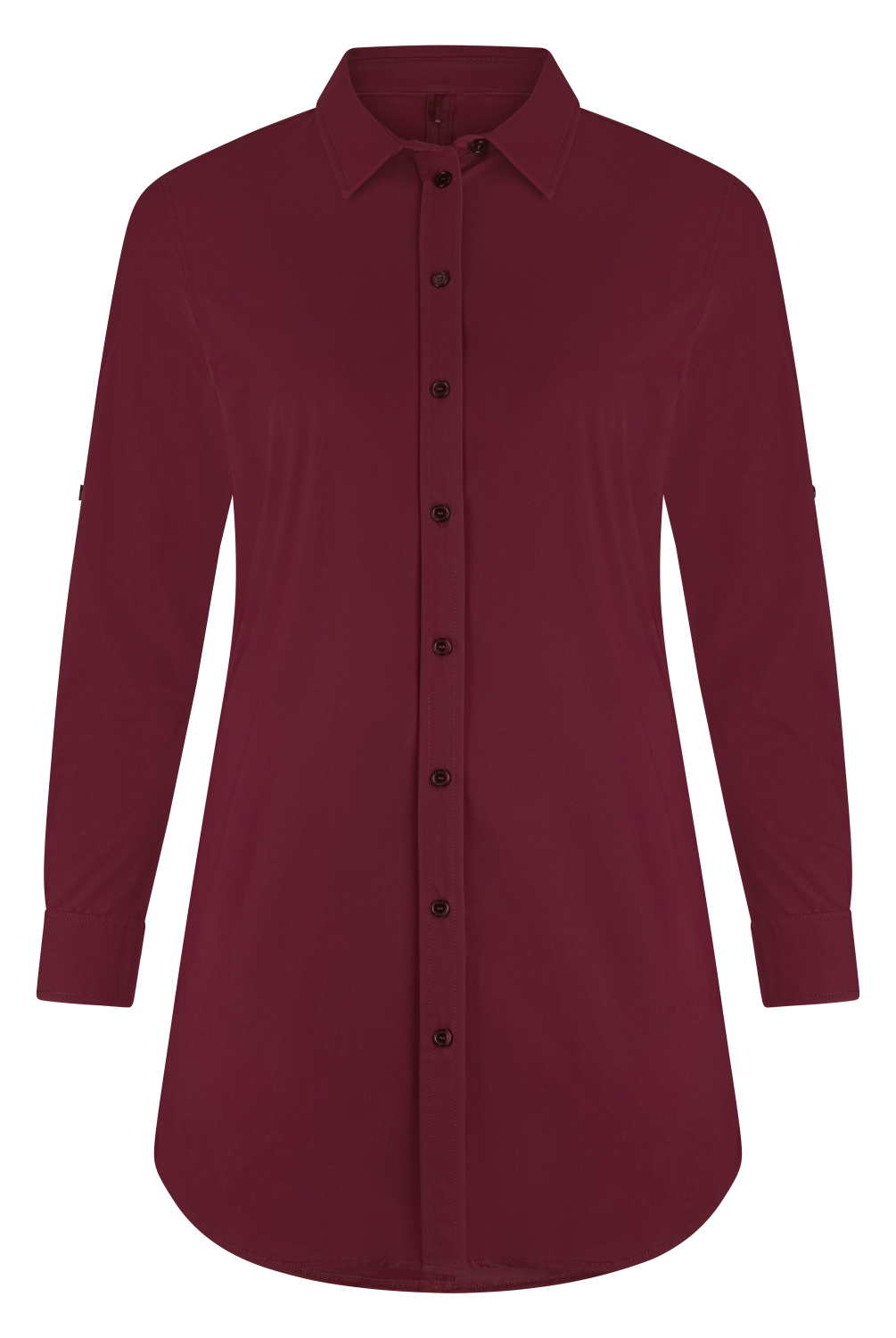 Lange blouse met overhemdkraag en knoopsluiting. Oprolbare lange mouwen met lummel en manchet met twee knoopjes. Aan de onderzijde heeft deze blouse afgeronde hoeken met zijsplit. Engelse naad op rugpand.