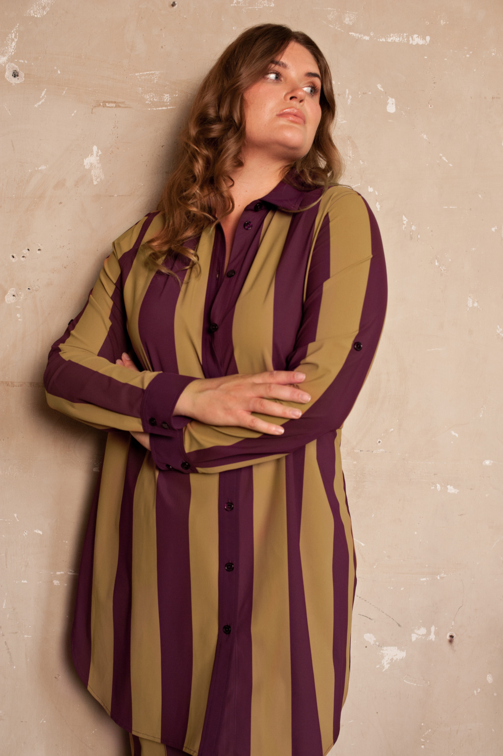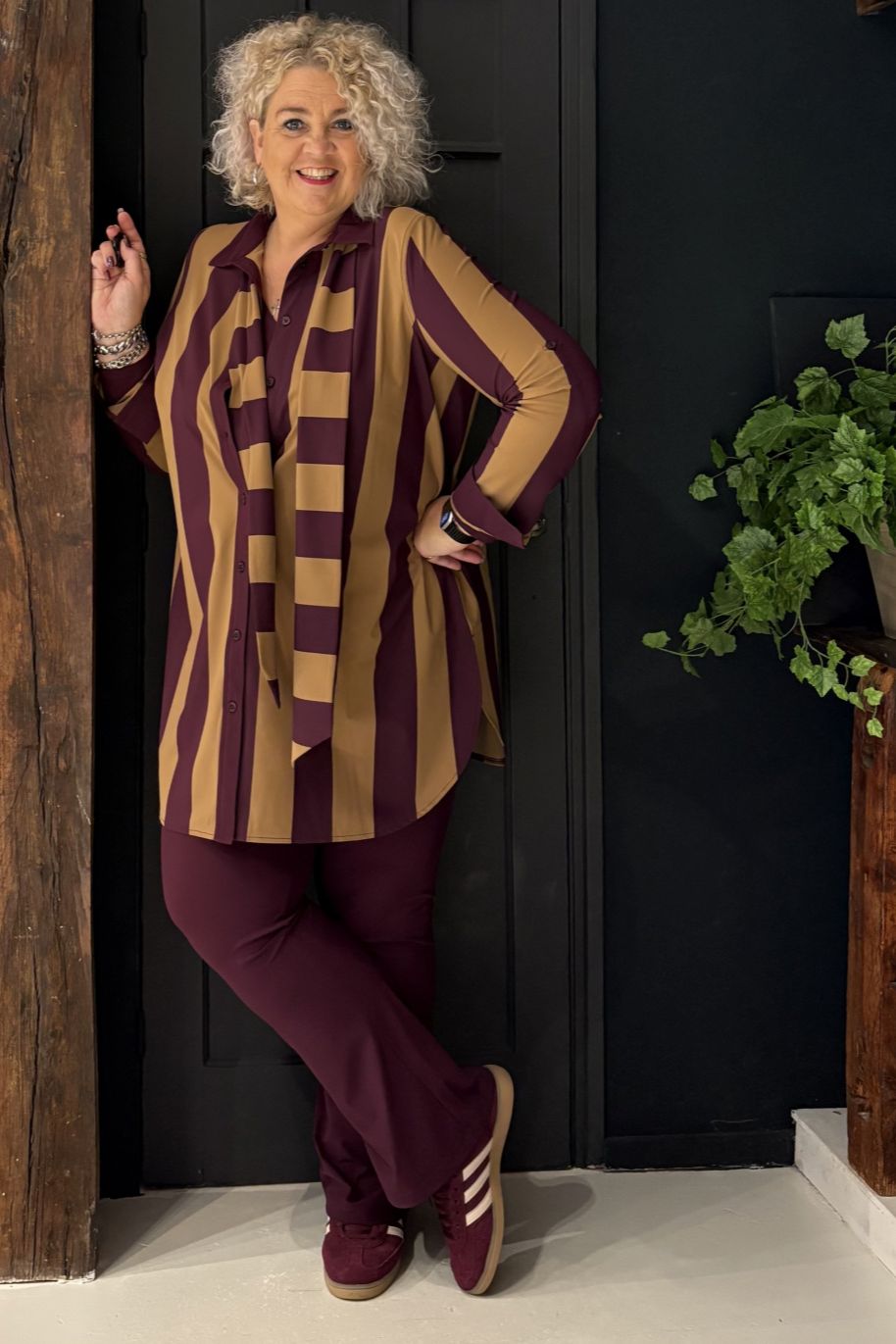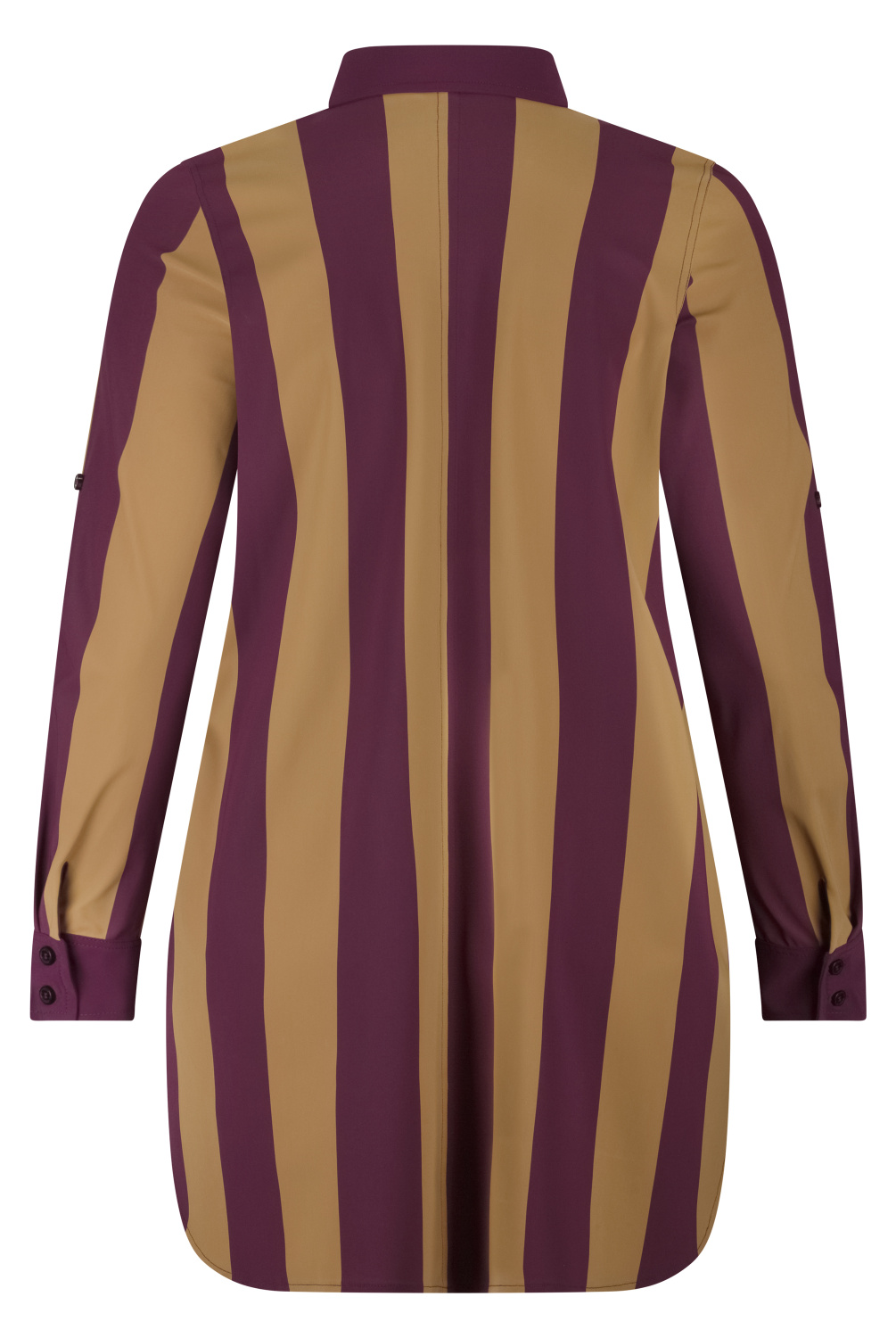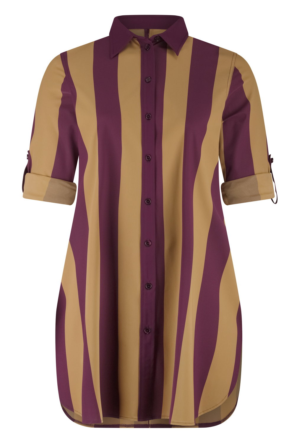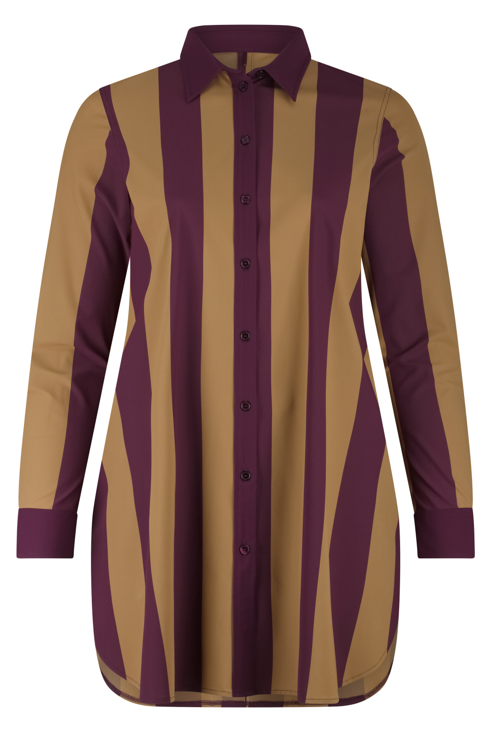 Lange blouse met overhemdkraag en knoopsluiting. Oprolbare lange mouwen met lummel en manchet met twee knoopjes. Aan de onderzijde heeft deze blouse afgeronde hoeken met zijsplit. Engelse naad op rugpand.