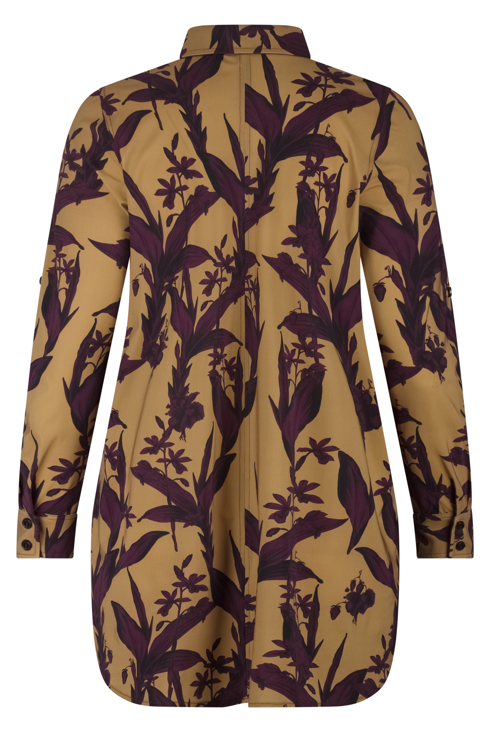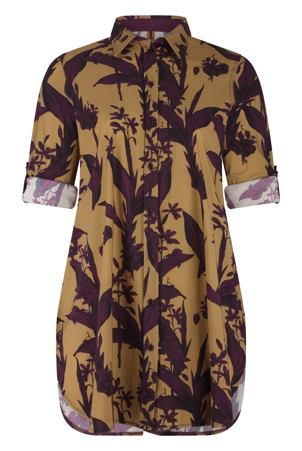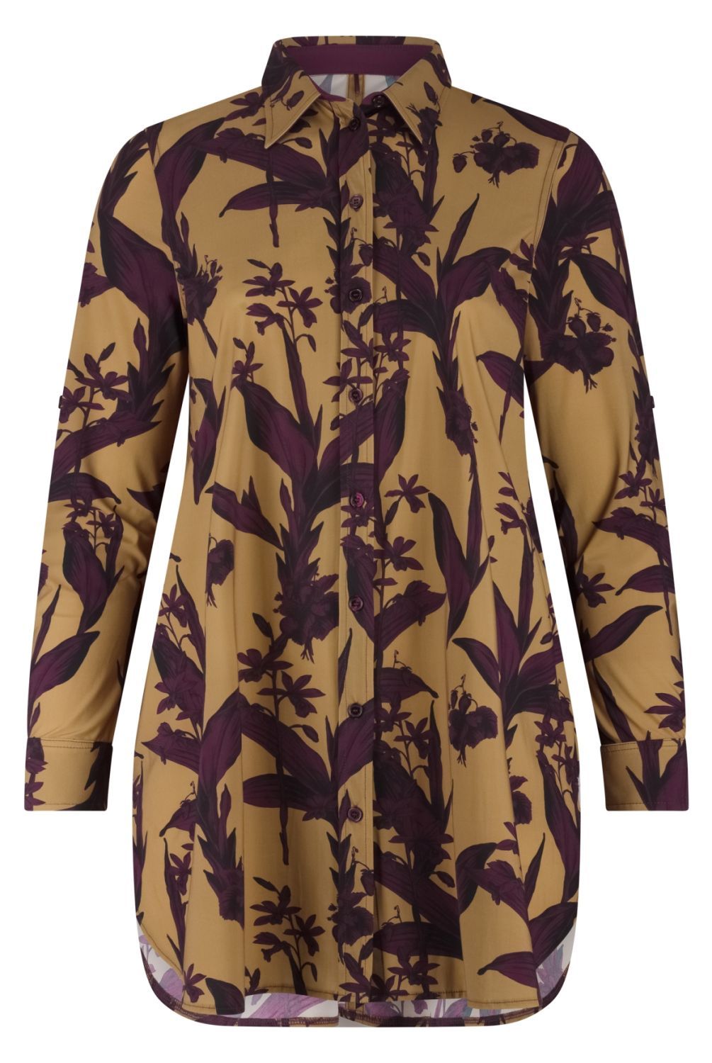 Lange blouse met overhemdkraag en knoopsluiting. Oprolbare lange mouwen met lummel en manchet met twee knoopjes. Aan de onderzijde heeft deze blouse afgeronde hoeken met zijsplit. Engelse naad op rugpand.