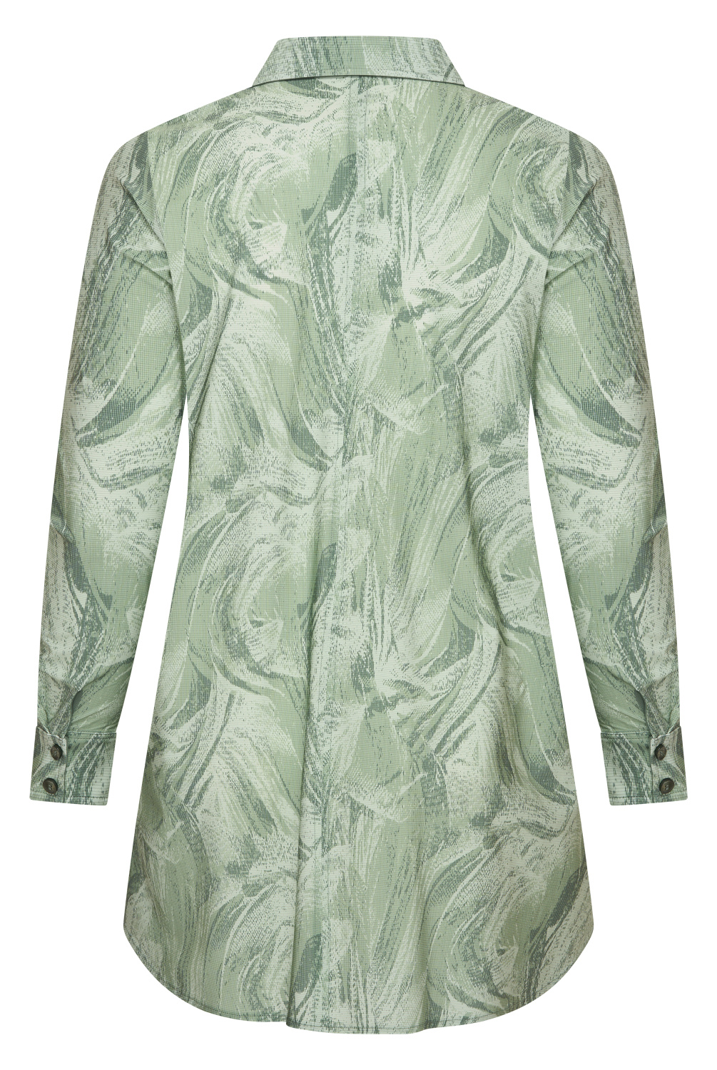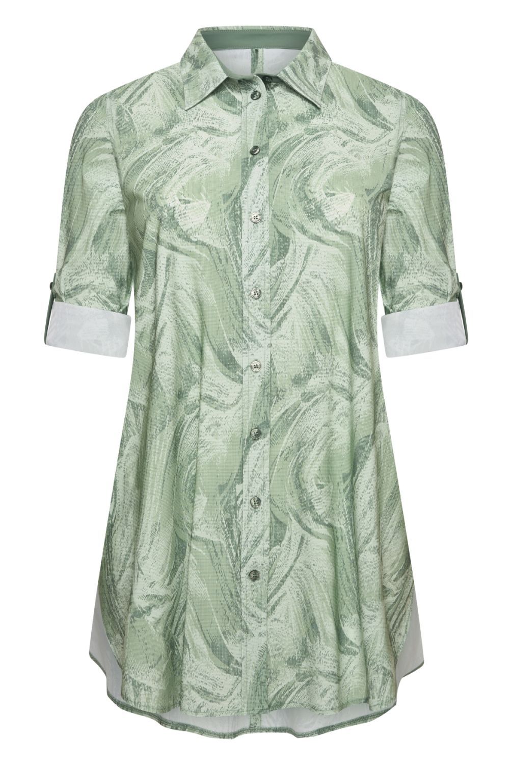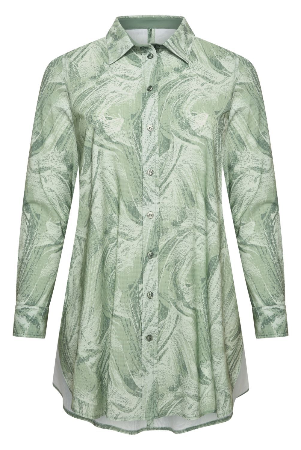 Lange blouse met overhemdkraag en knoopsluiting. Oprolbare lange mouwen met lummel en manchet met twee knoopjes. Aan de onderzijde heeft deze blouse afgeronde hoeken met zijsplit. Engelse naad op rugpand.