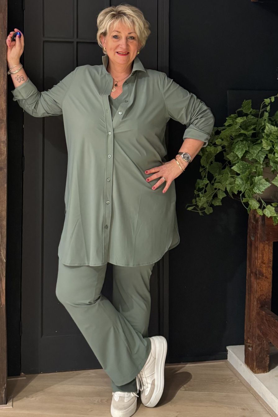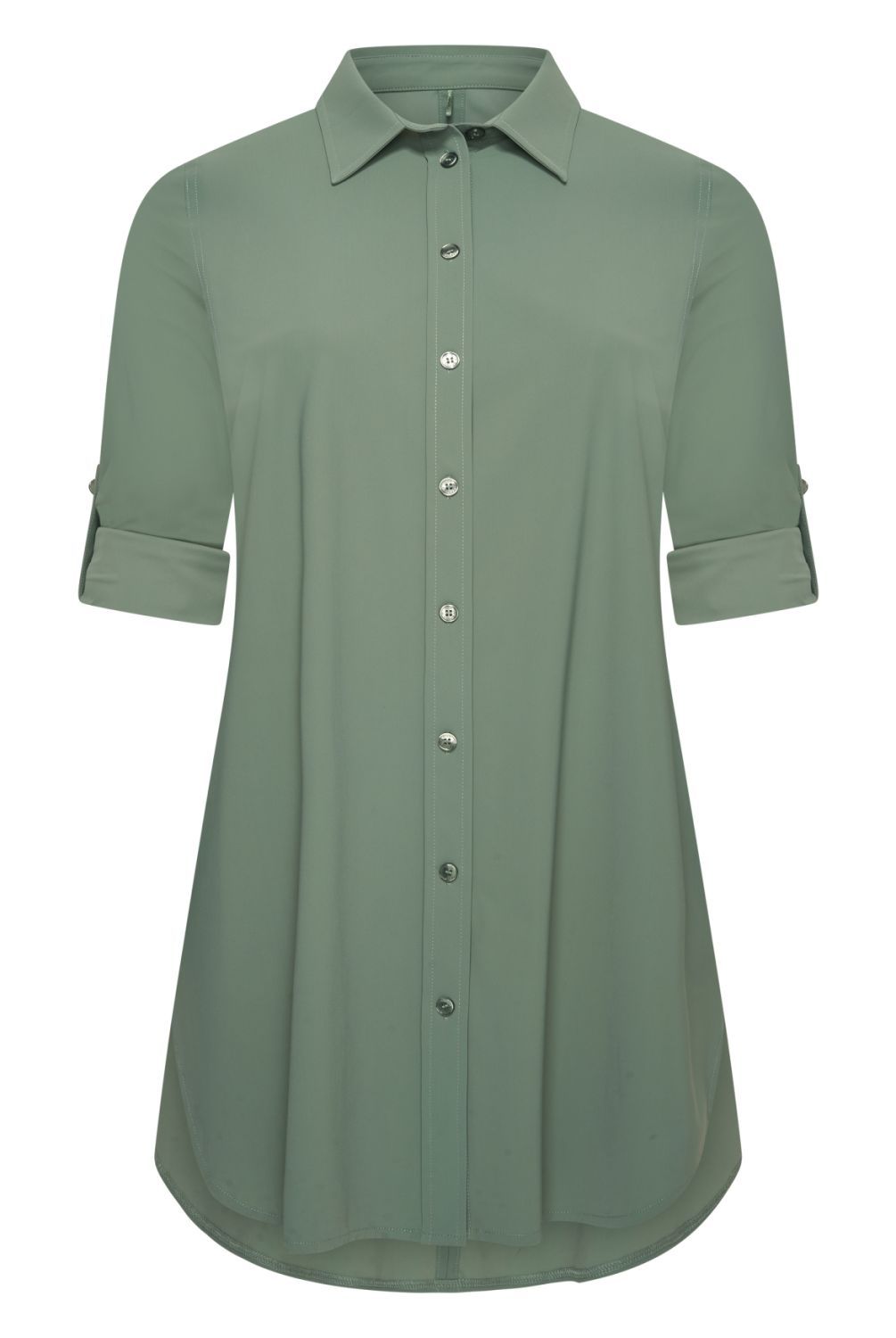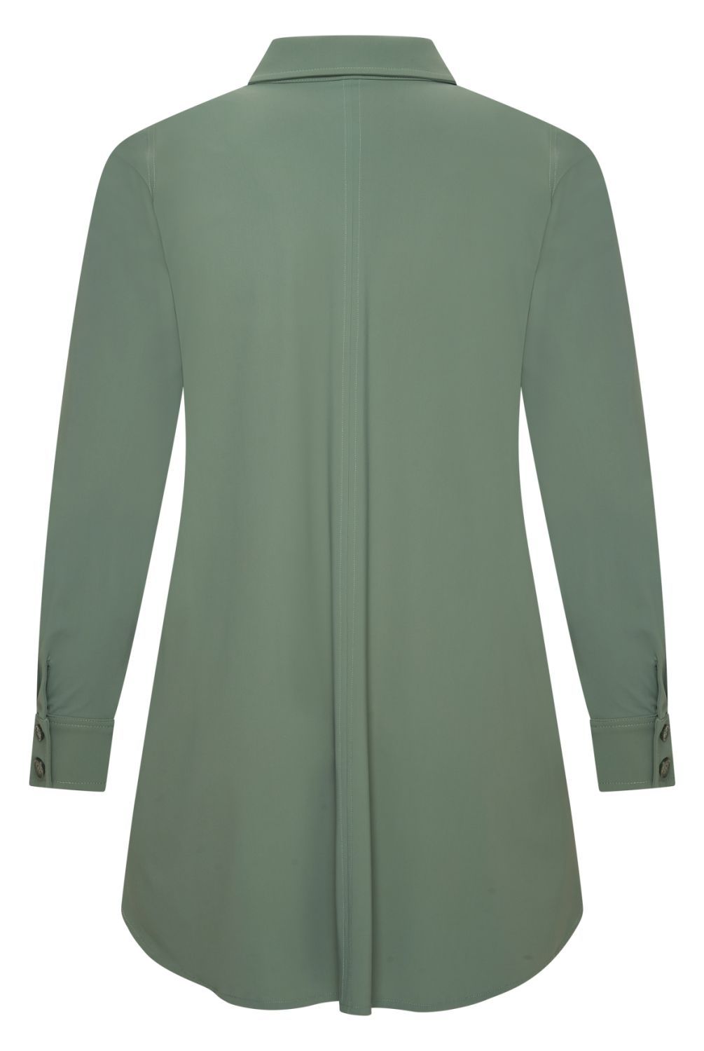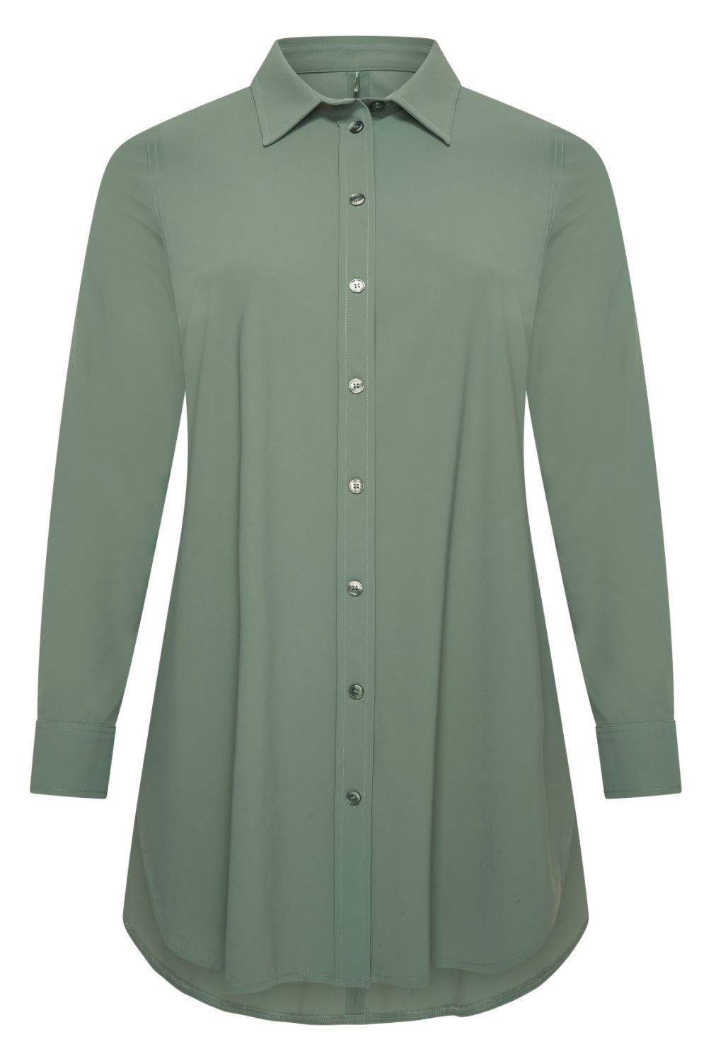 Lange blouse met overhemdkraag en knoopsluiting. Oprolbare lange mouwen met lummel en manchet met twee knoopjes. Aan de onderzijde heeft deze blouse afgeronde hoeken met zijsplit. Engelse naad op rugpand.
