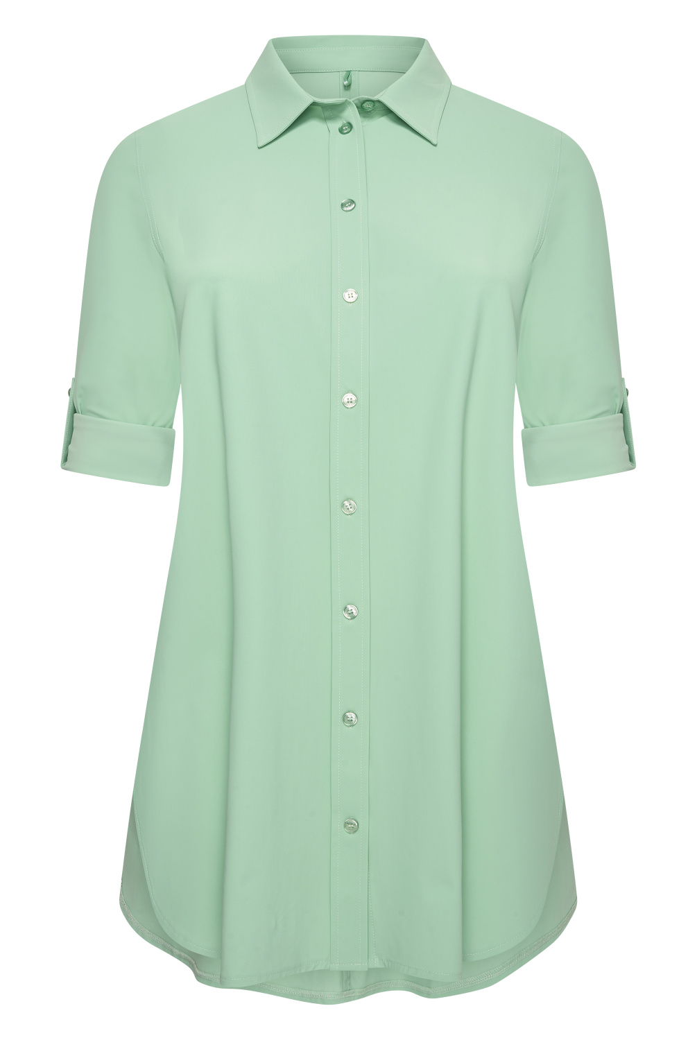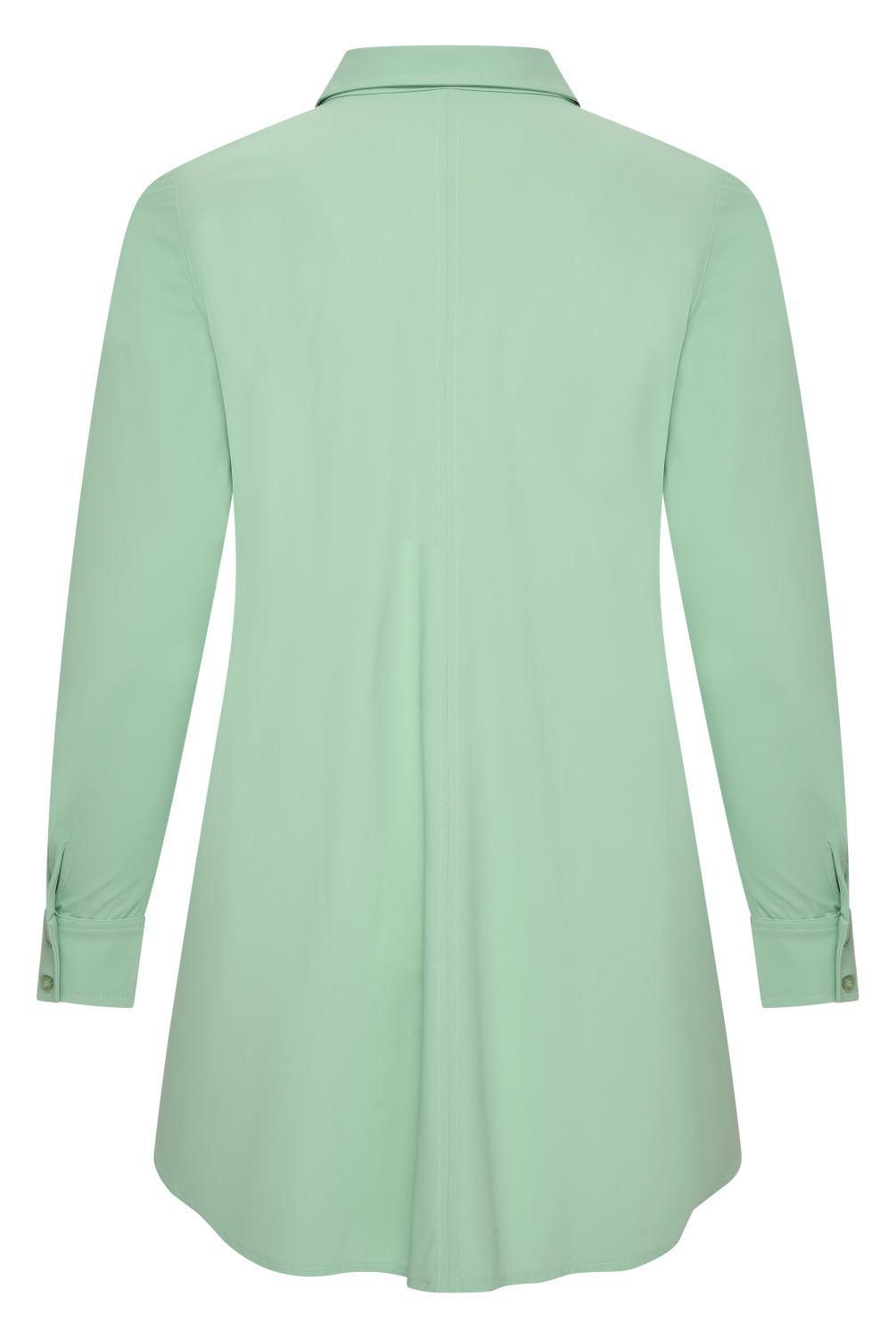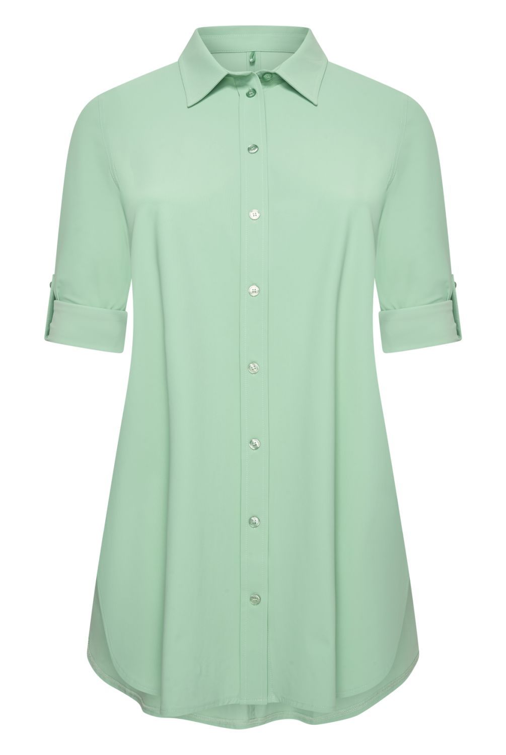 Lange blouse met overhemdkraag en knoopsluiting. Oprolbare lange mouwen met lummel en manchet met twee knoopjes. Aan de onderzijde heeft deze blouse afgeronde hoeken met zijsplit. Engelse naad op rugpand.