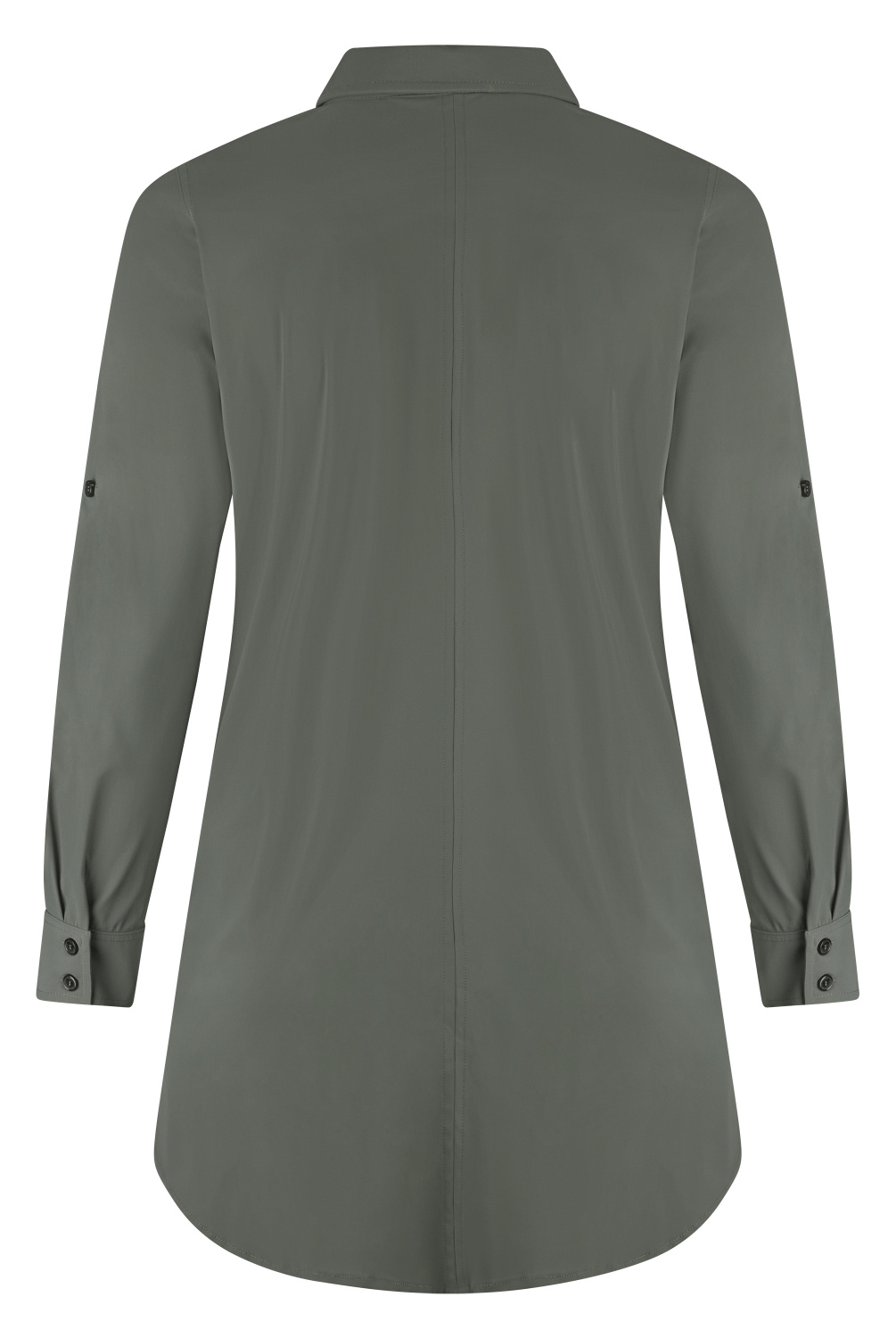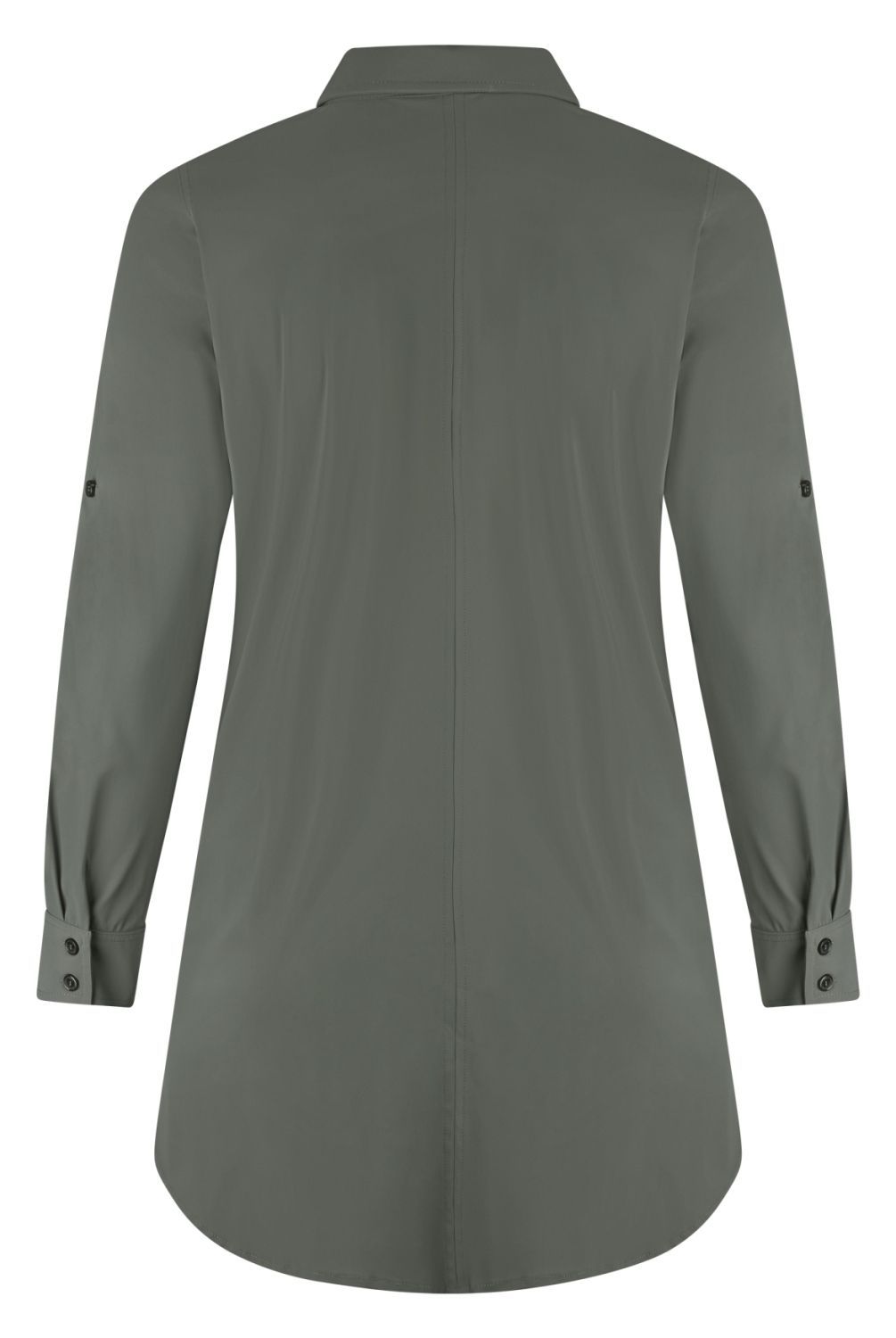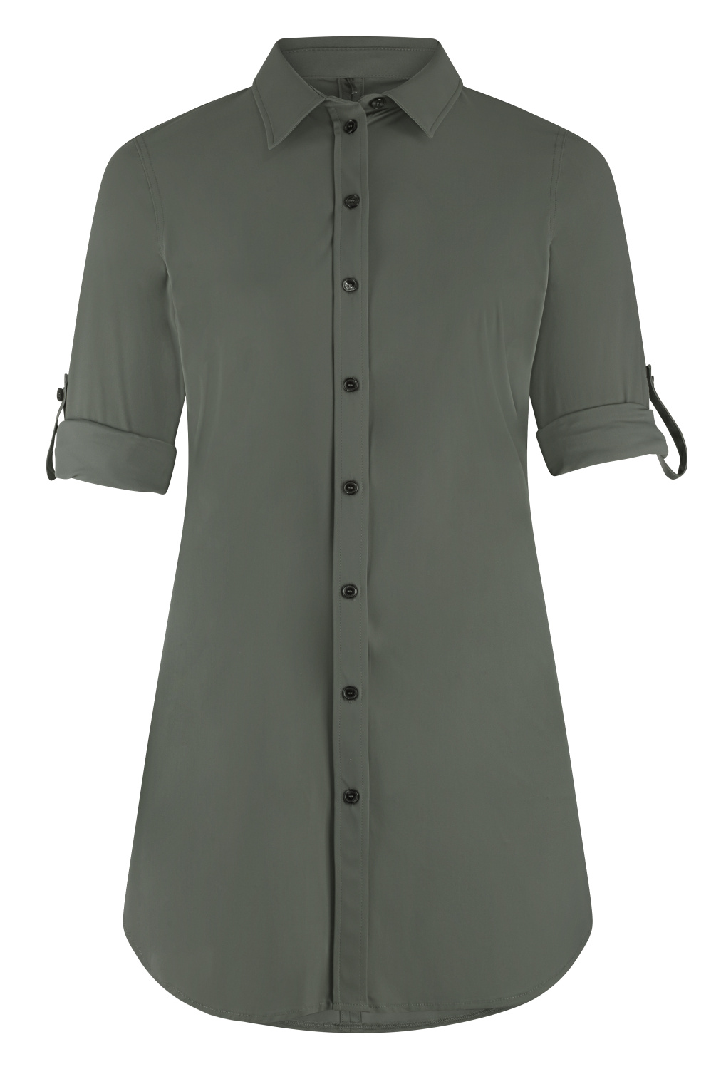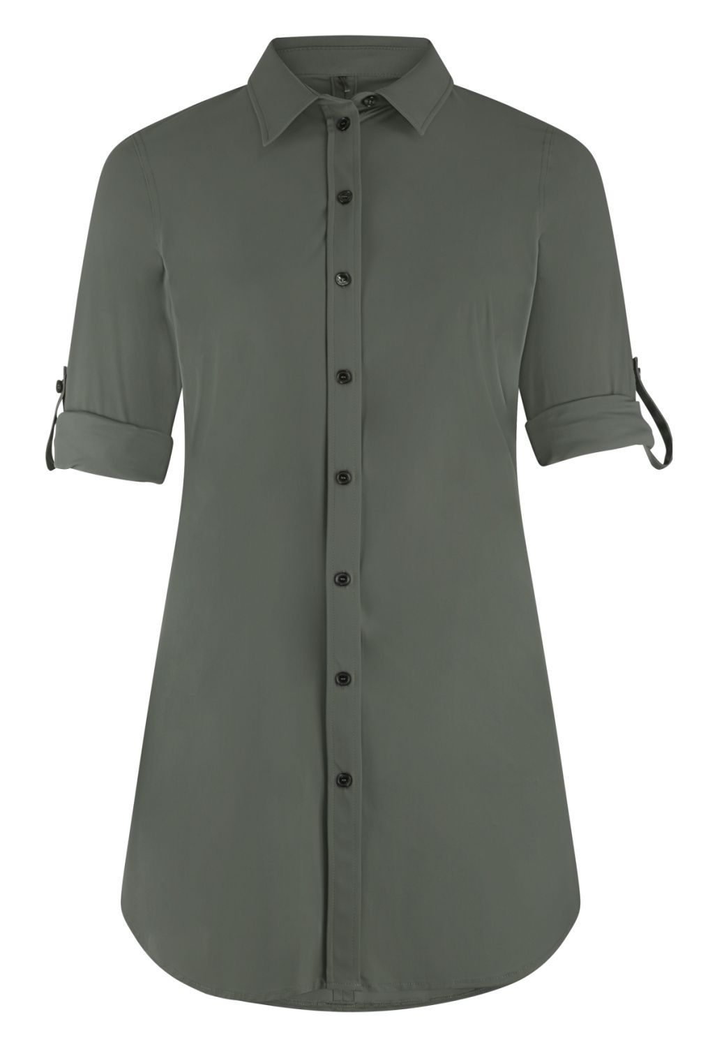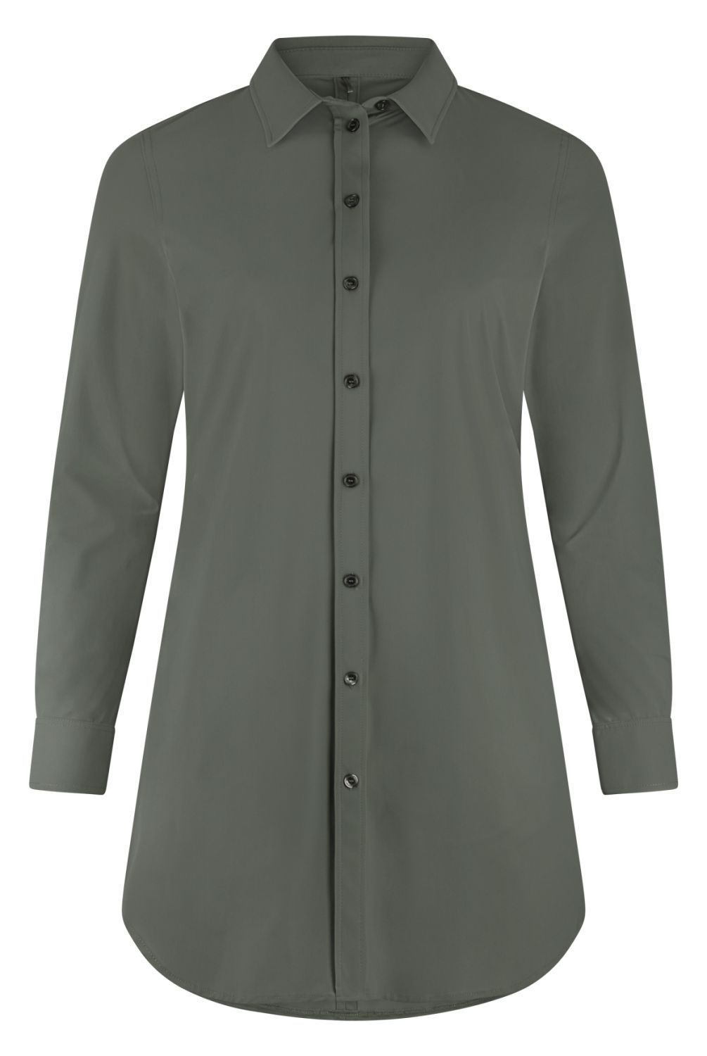 Lange blouse met overhemdkraag en knoopsluiting. Oprolbare lange mouwen met lummel en manchet met twee knoopjes. Aan de onderzijde heeft deze blouse afgeronde hoeken met zijsplit. Engelse naad op rugpand.