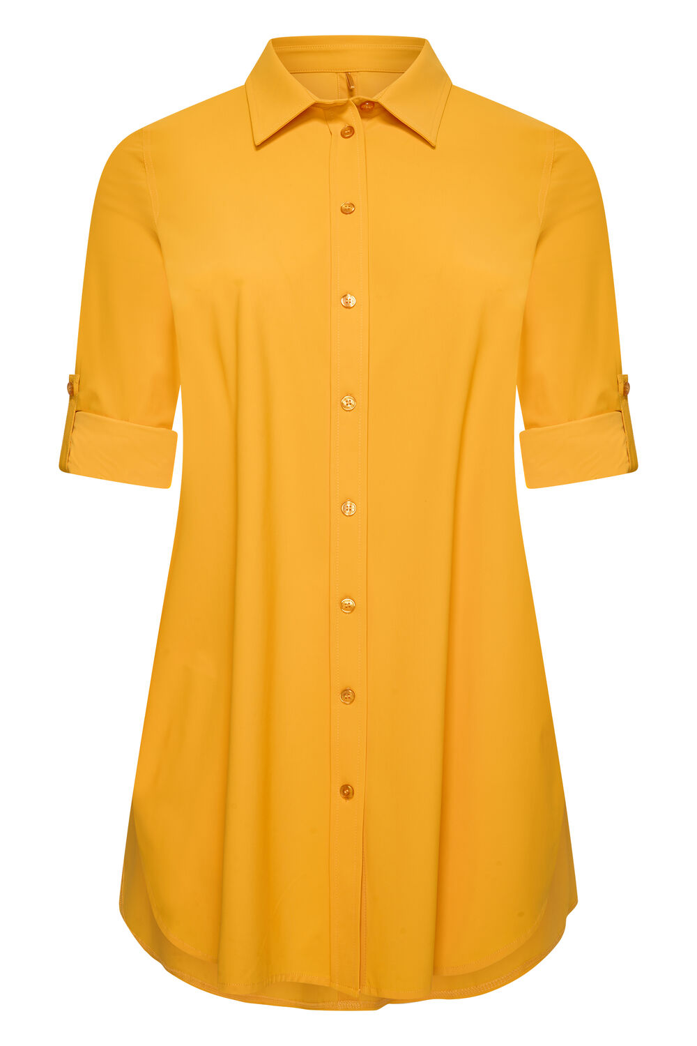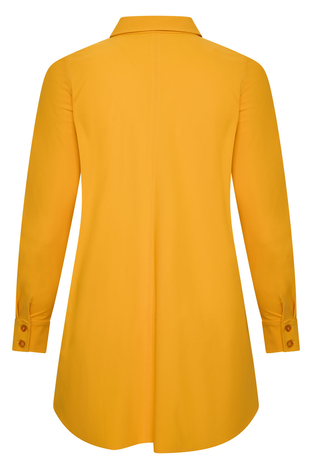 Lange blouse met overhemdkraag en knoopsluiting. Oprolbare lange mouwen met lummel en manchet met twee knoopjes. Aan de onderzijde heeft deze blouse afgeronde hoeken met zijsplit. Engelse naad op rugpand.