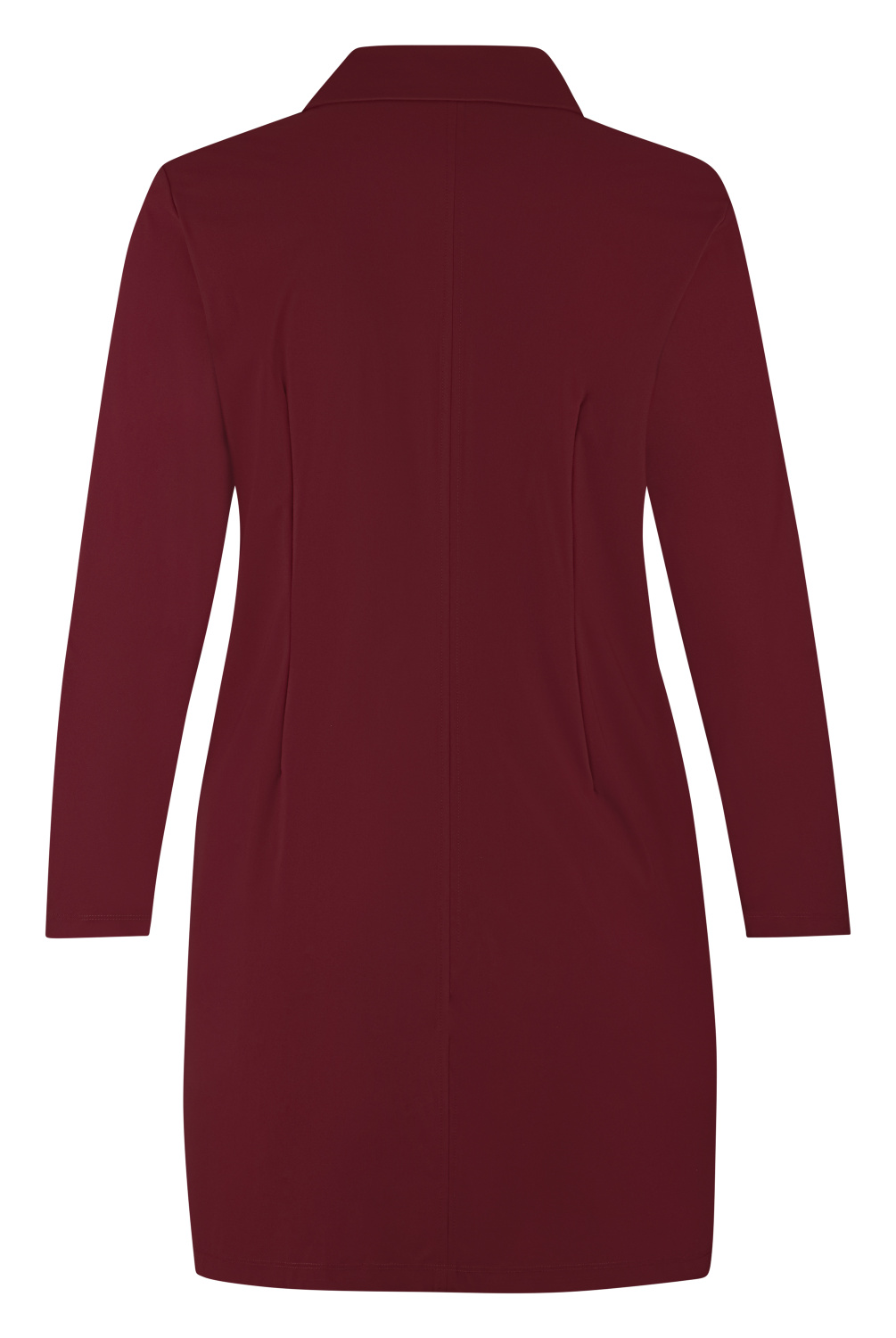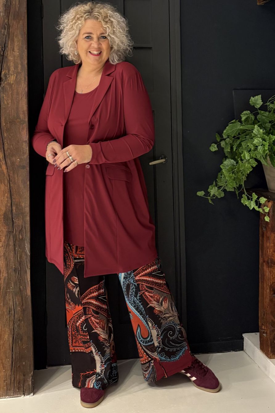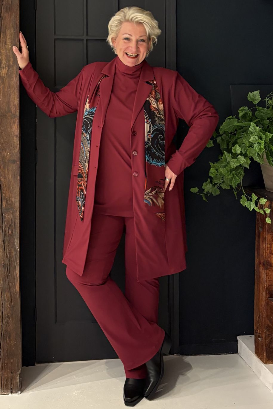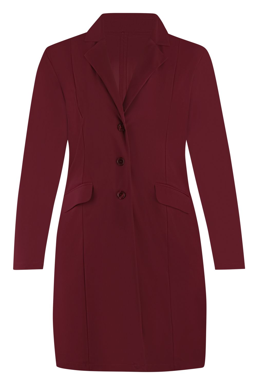 Lange ongevoerde blazer met reverskraag. Lange mouwen met schoudervulling. Aan de voorzijde drie knopen en twee klepzakken. Engelse naad op rugpand.