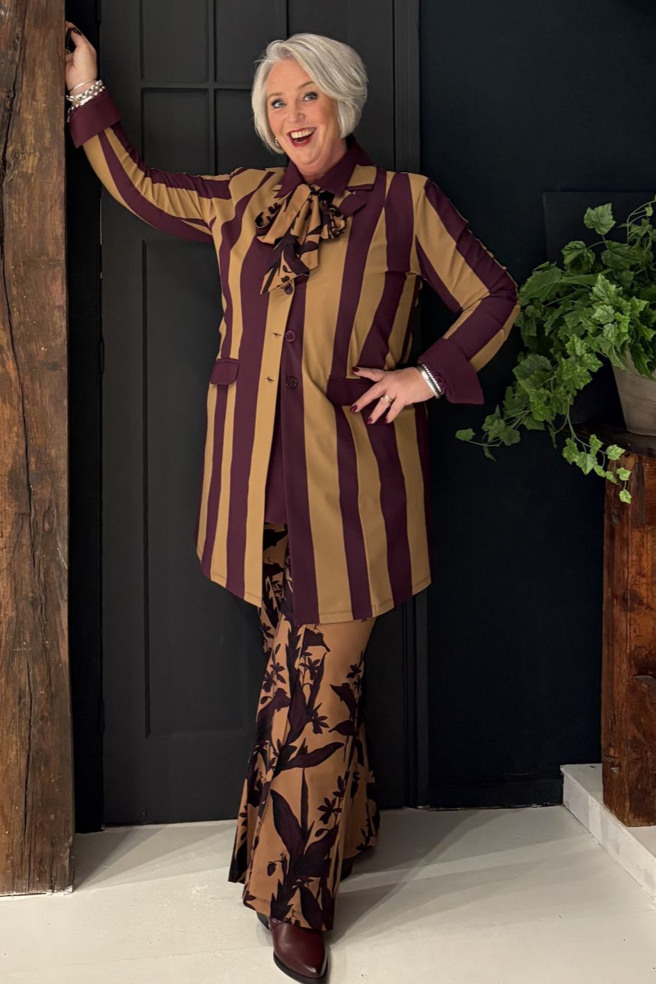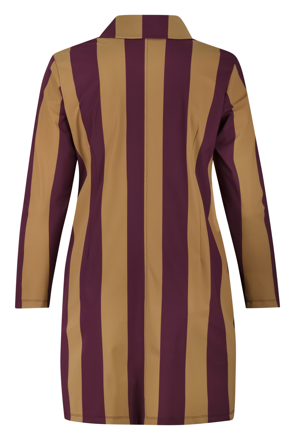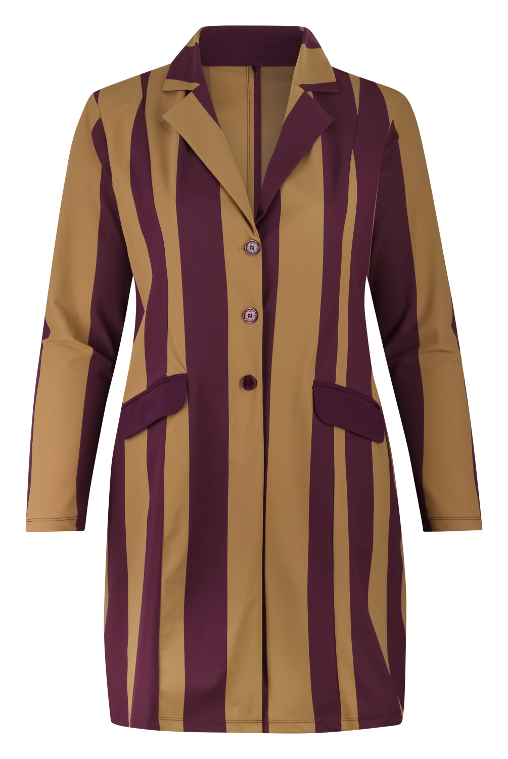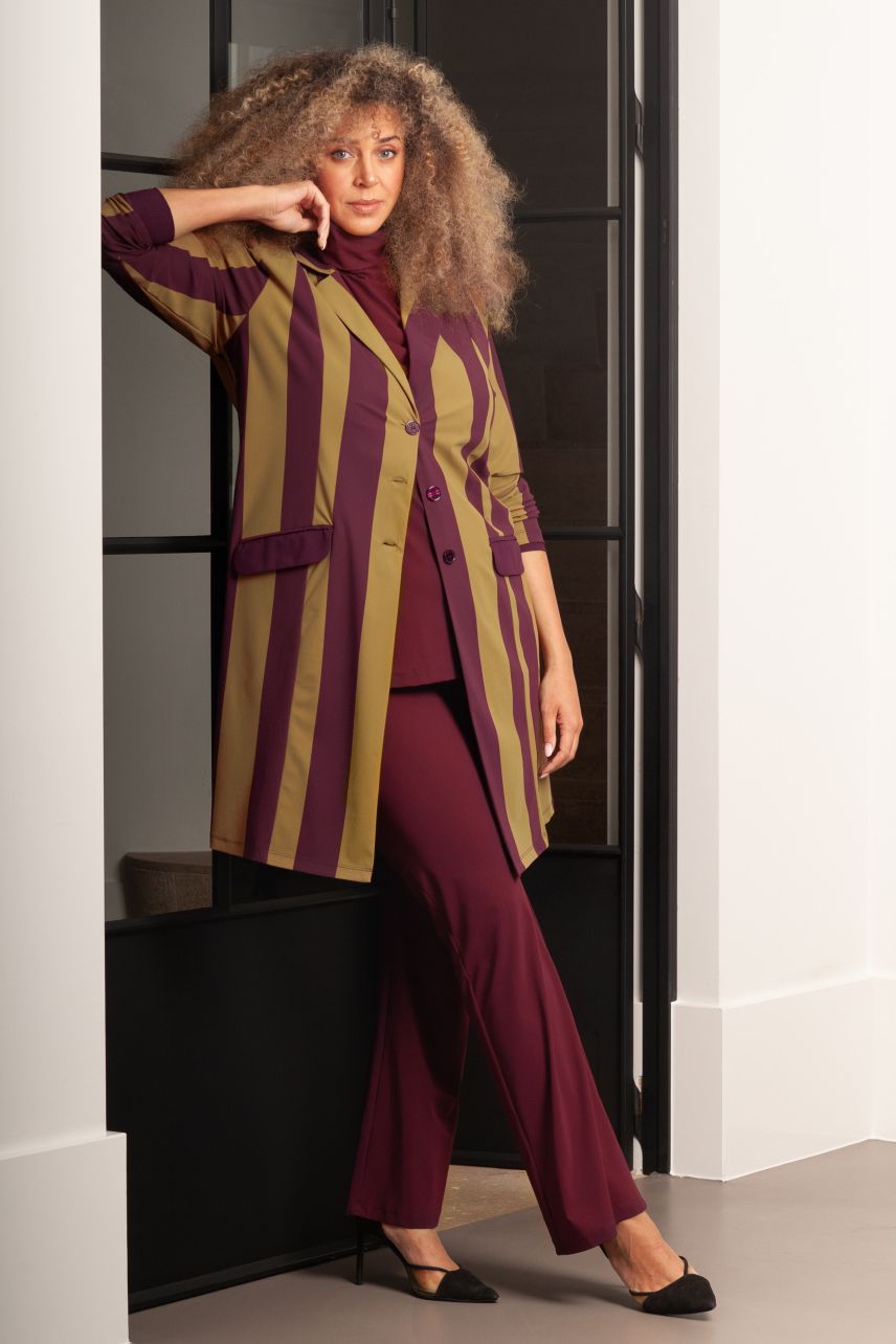 Lange ongevoerde blazer met reverskraag. Lange mouwen met schoudervulling. Aan de voorzijde drie knopen en twee klepzakken. Engelse naad op rugpand.