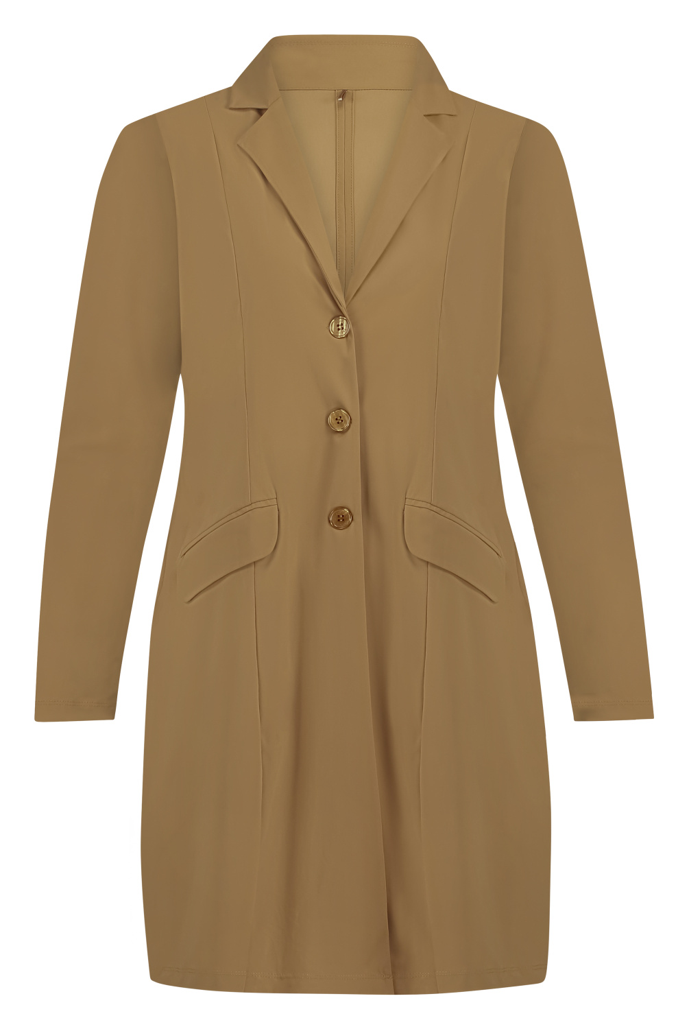 Lange ongevoerde blazer met reverskraag. Lange mouwen met schoudervulling. Aan de voorzijde drie knopen en twee klepzakken. Engelse naad op rugpand.