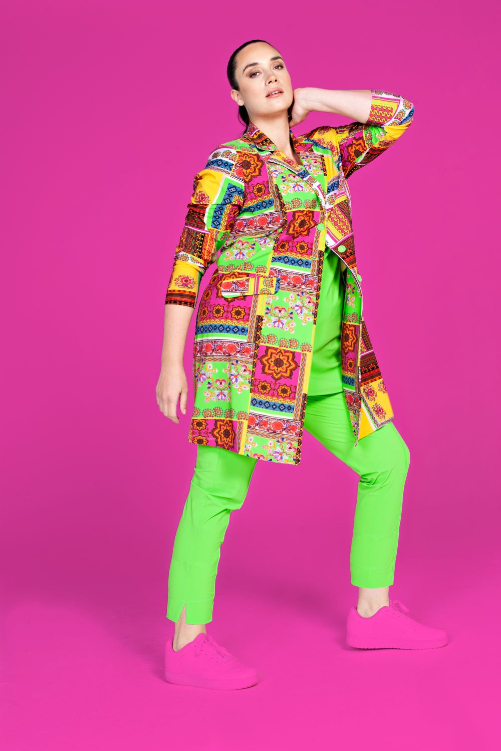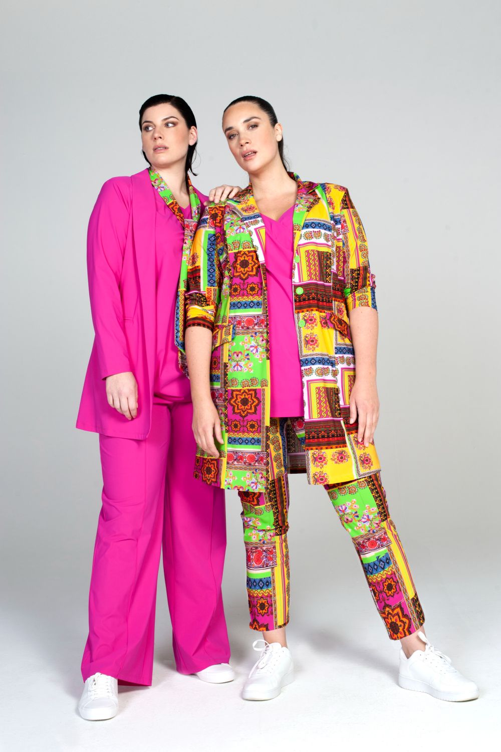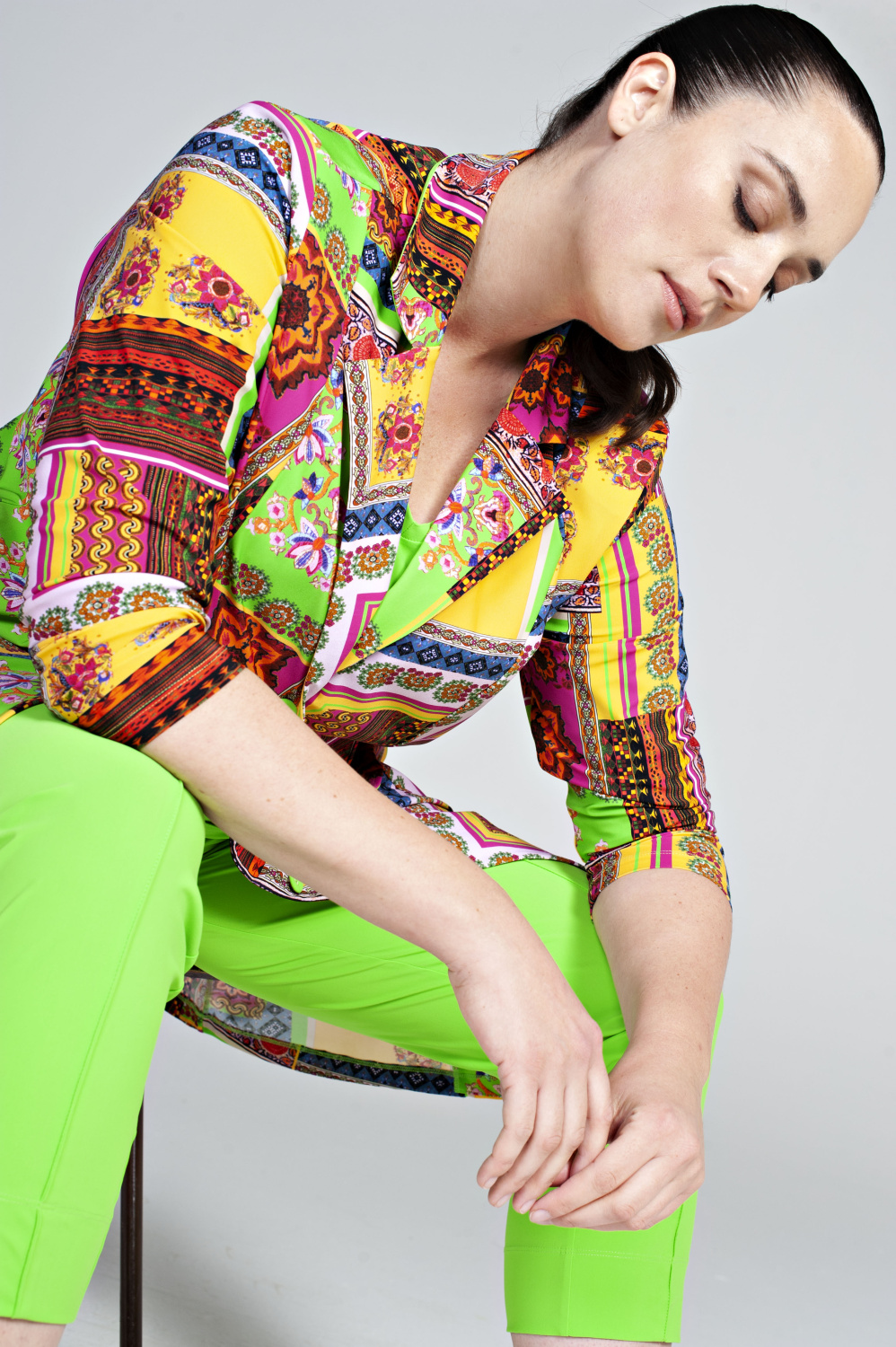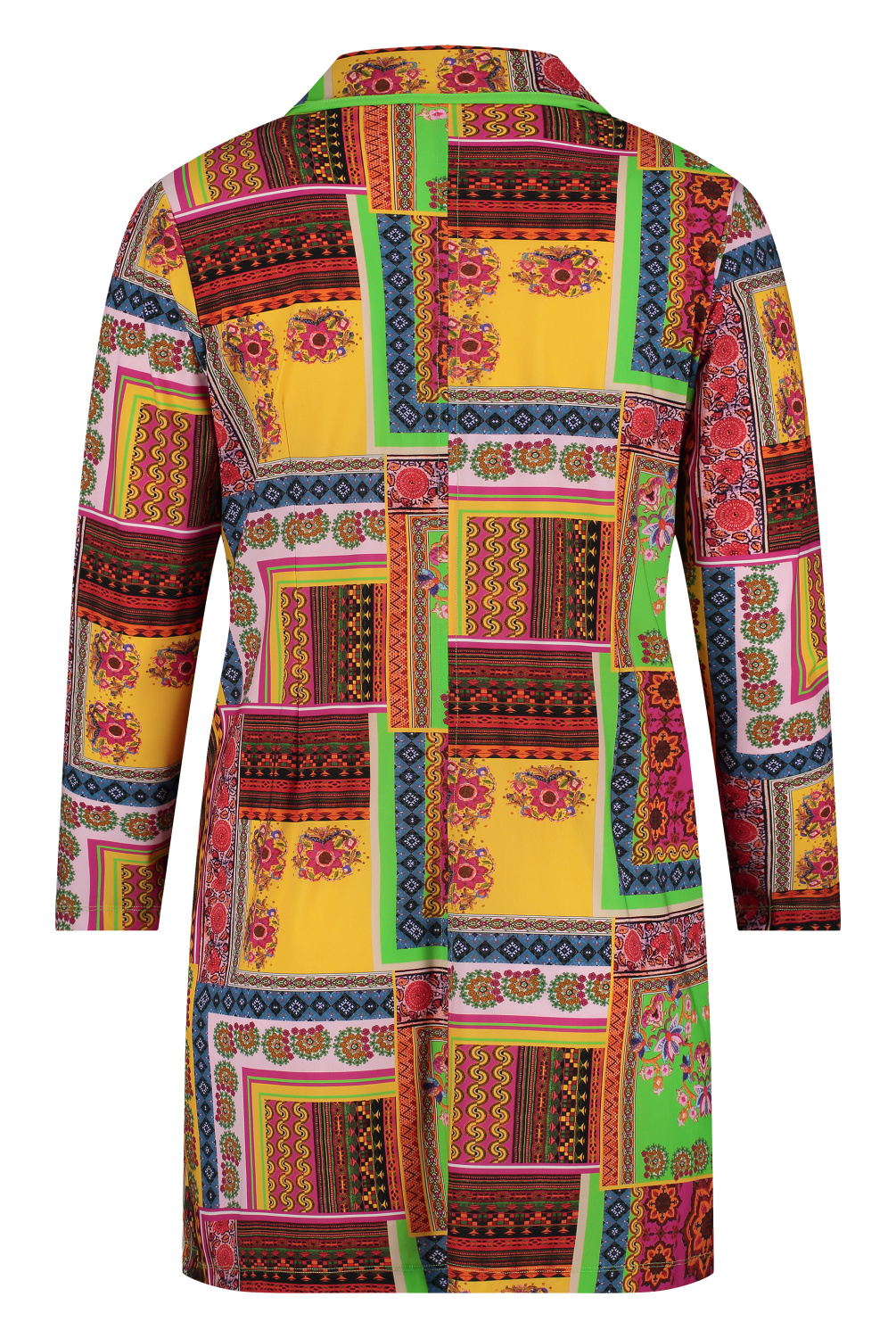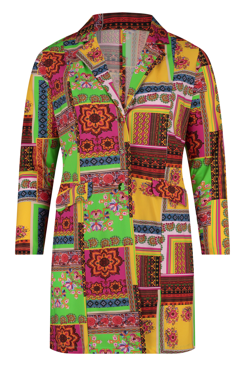 Lange ongevoerde blazer met reverskraag. Lange mouwen met schoudervulling. Aan de voorzijde drie stofknopen en twee klepzakken. Engelse naad op rugpand.