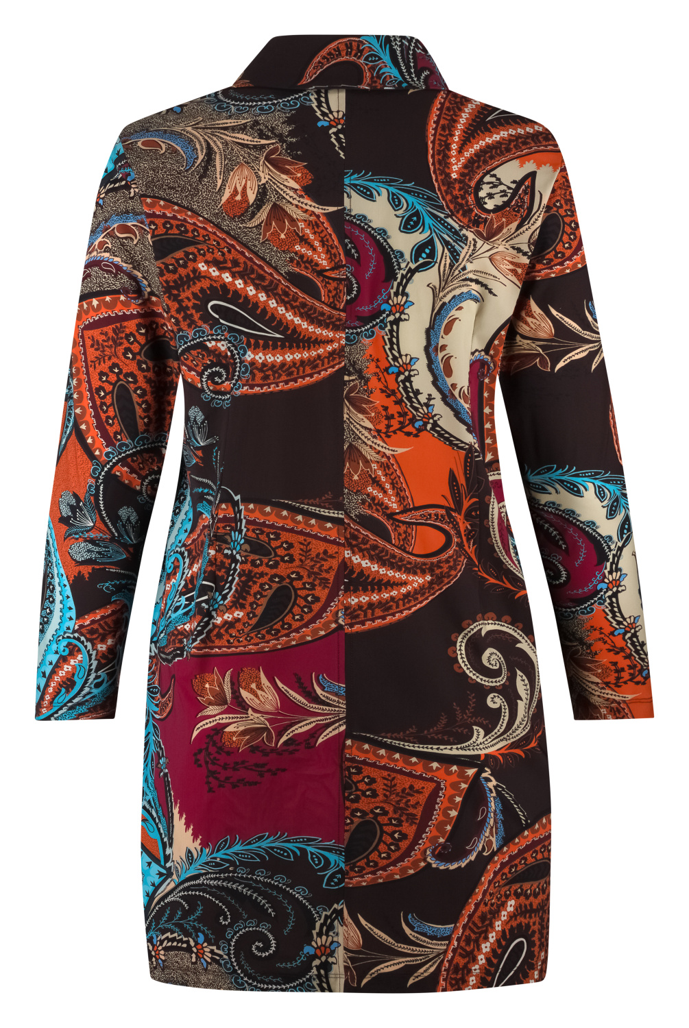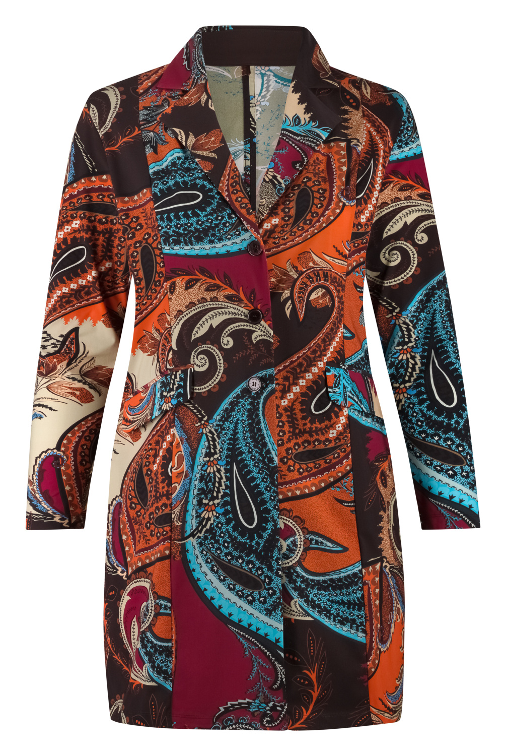 Lange ongevoerde blazer met reverskraag. Lange mouwen met schoudervulling. Aan de voorzijde drie knopen en twee klepzakken. Engelse naad op rugpand.