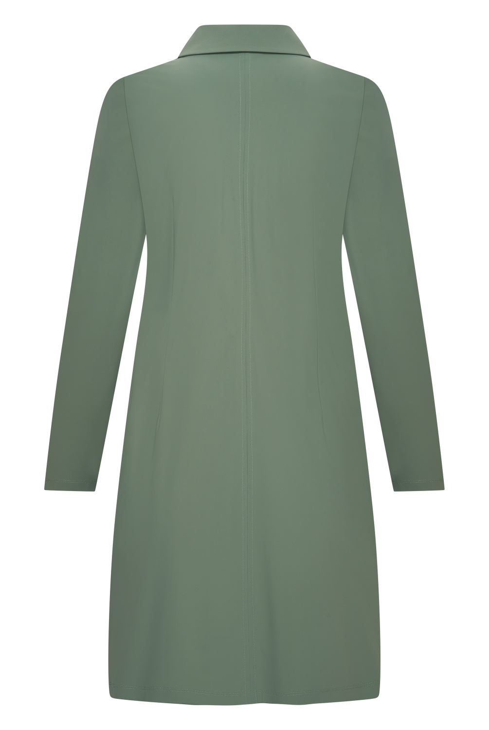 Lange ongevoerde blazer met reverskraag. Lange mouwen met schoudervulling. Aan de voorzijde drie knopen en twee klepzakken. Engelse naad op rugpand.