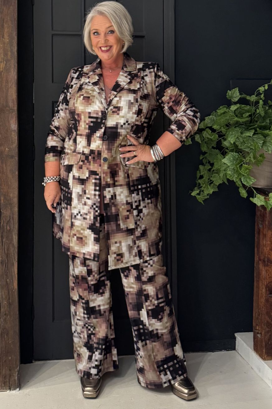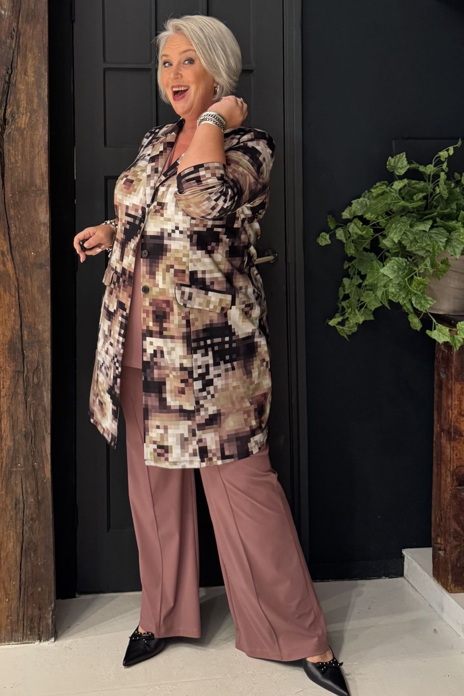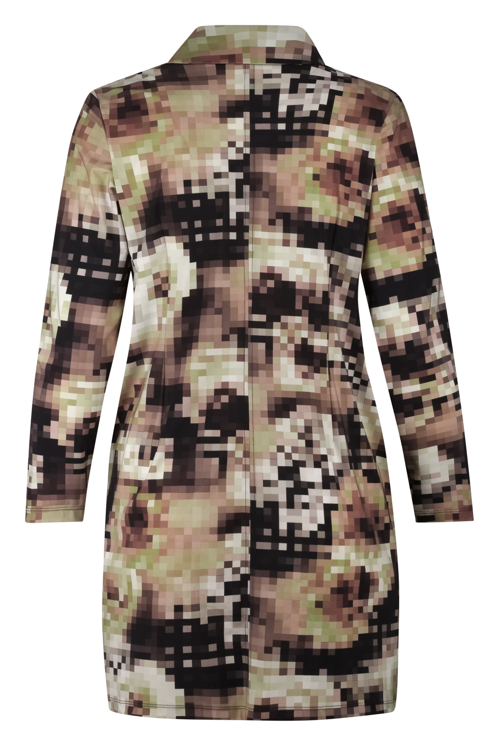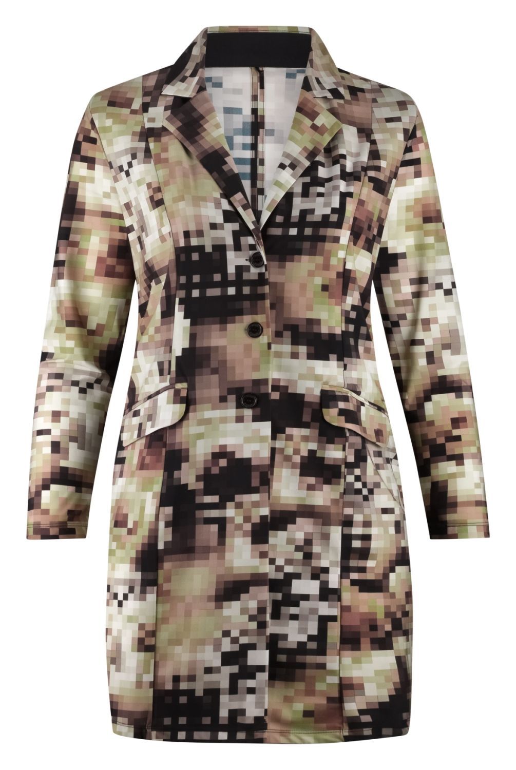 Lange ongevoerde blazer met reverskraag. Lange mouwen met schoudervulling. Aan de voorzijde drie knopen en twee klepzakken. Engelse naad op rugpand.