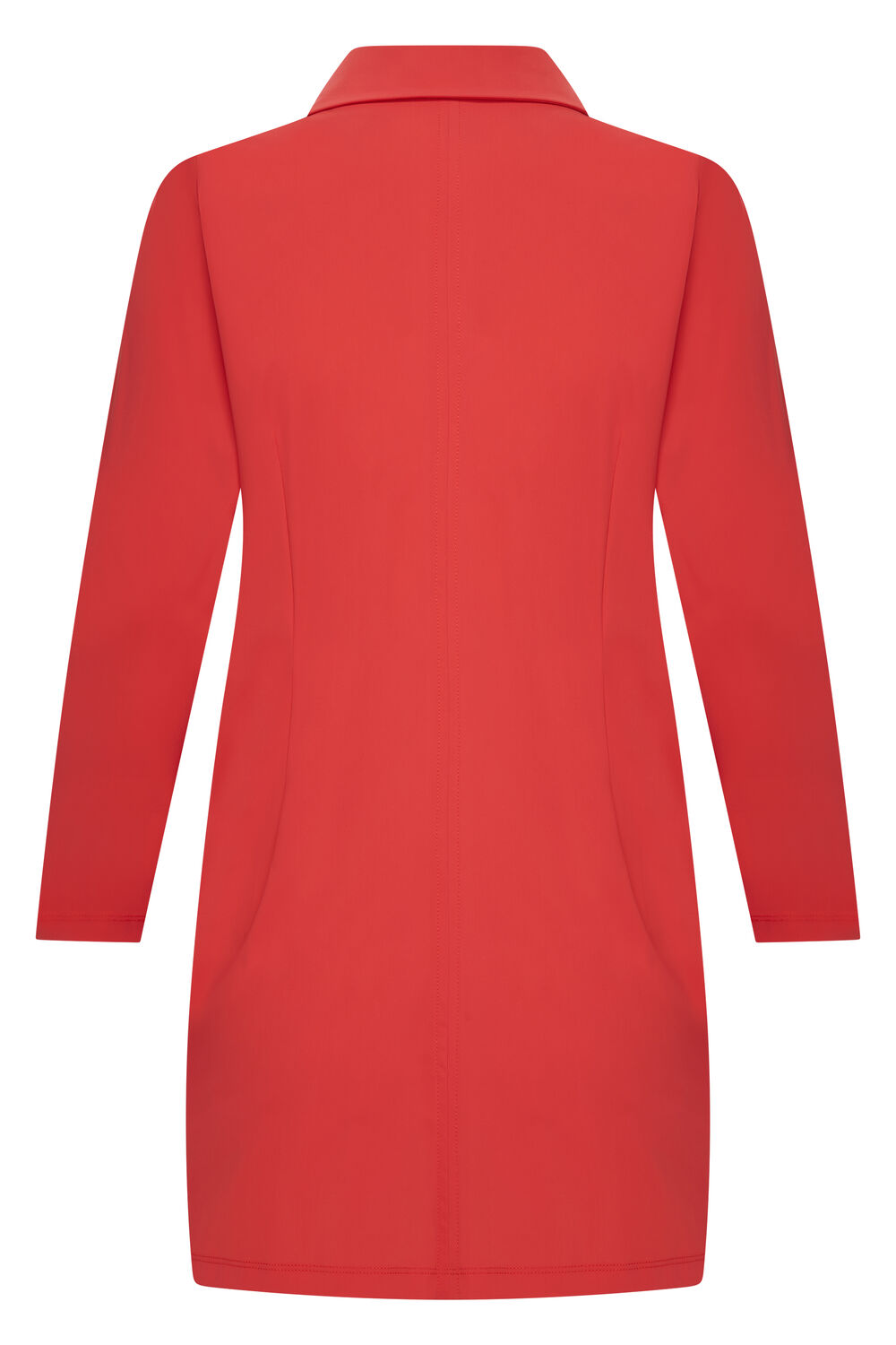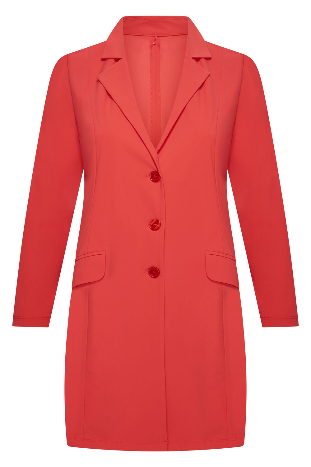 Lange ongevoerde blazer met reverskraag. Lange mouwen met schoudervulling. Aan de voorzijde drie knopen en twee klepzakken. Engelse naad op rugpand.