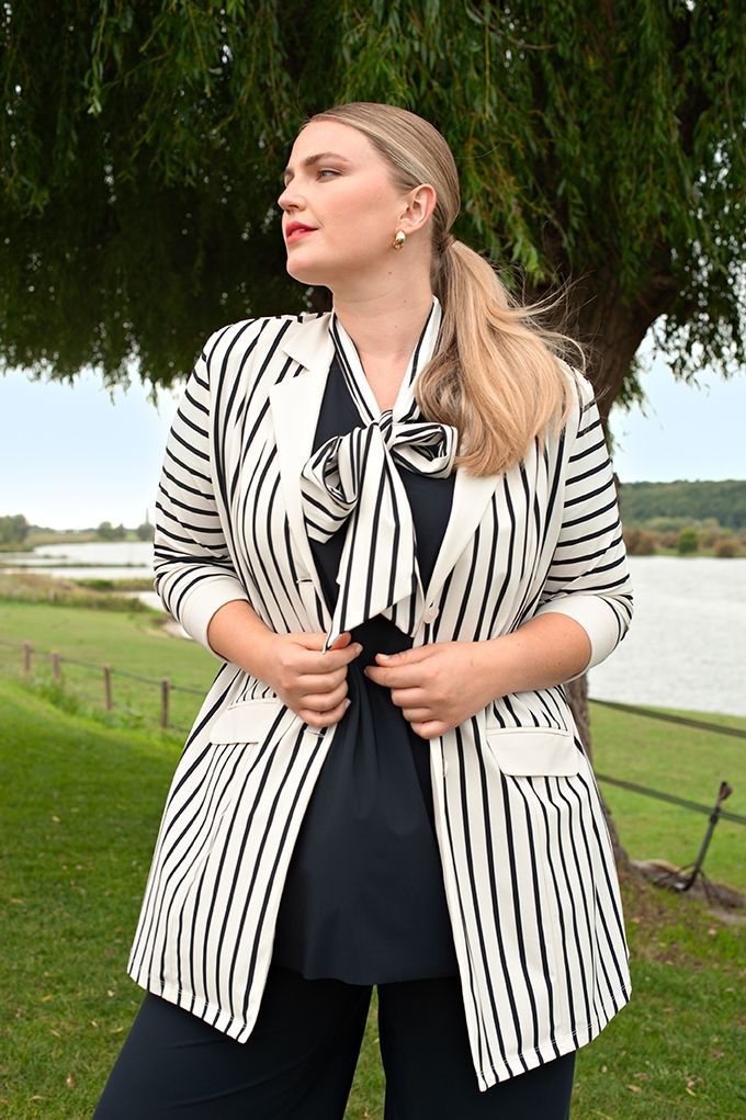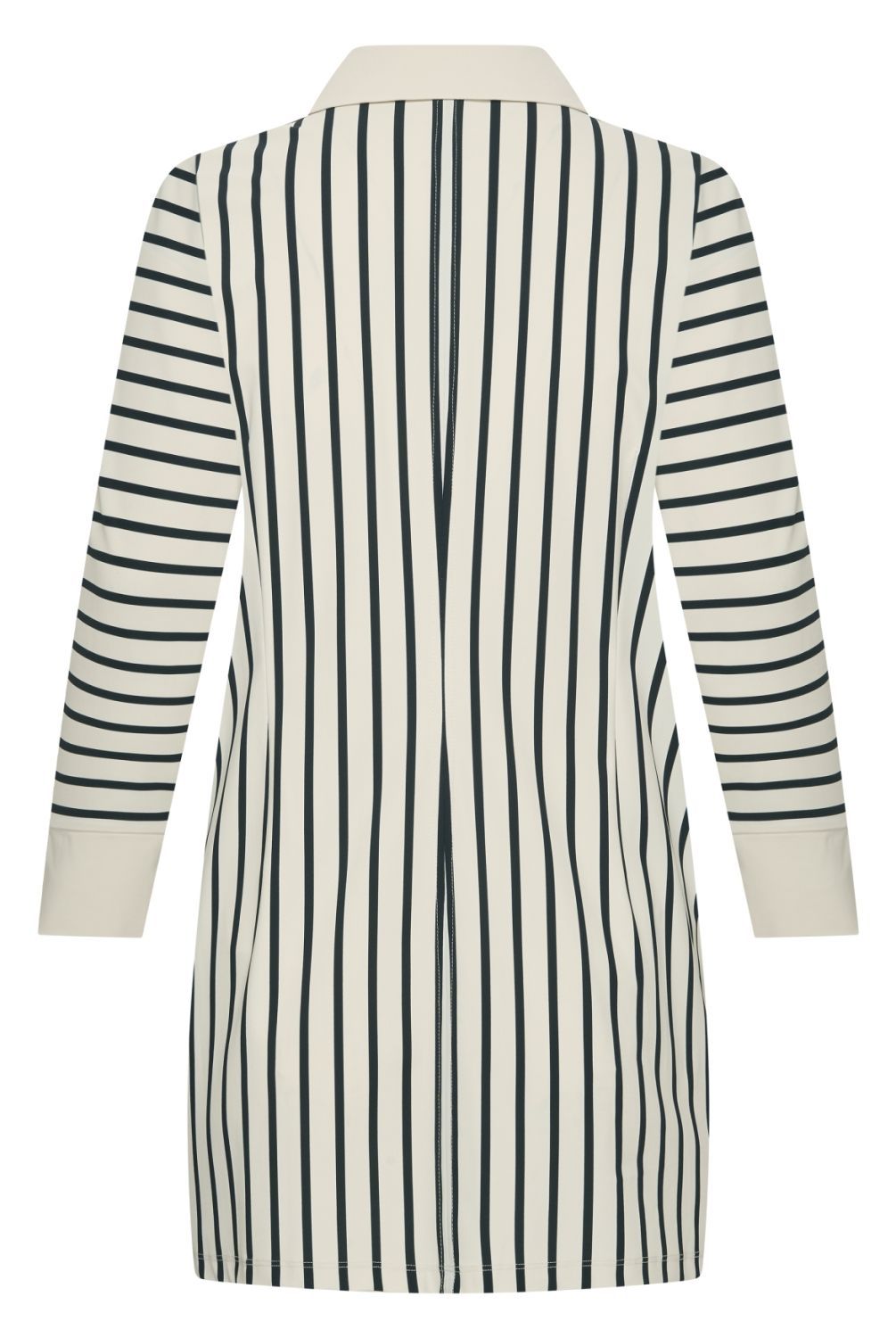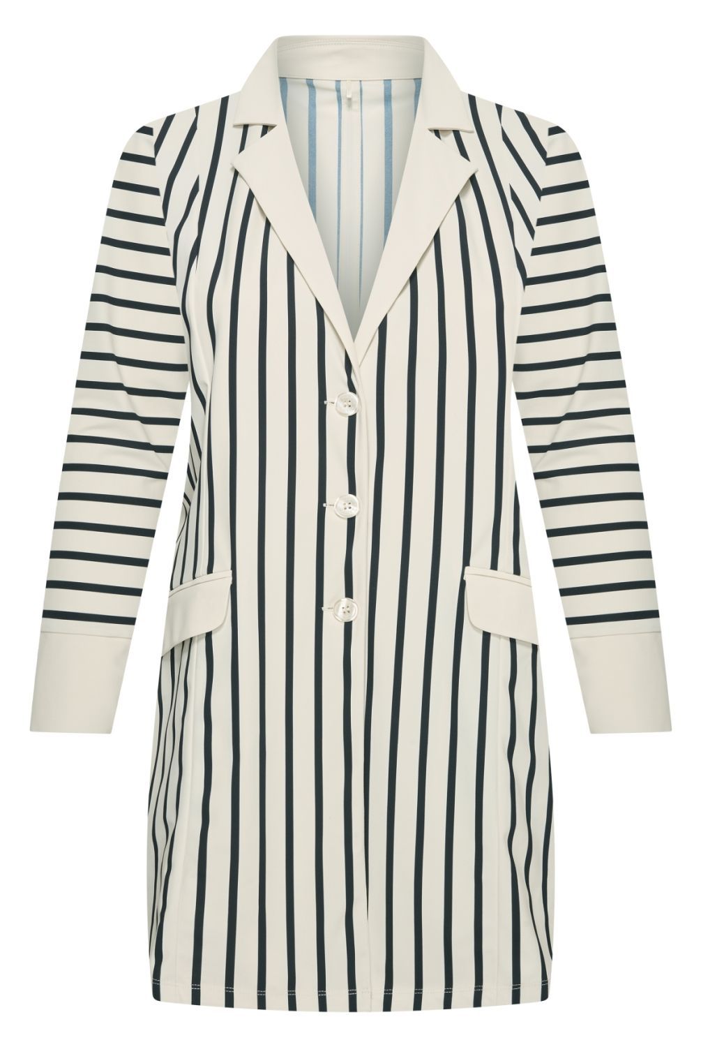 Midi lengte ongevoerde blazer met reverskraag. Lange mouwen met schoudervulling. Aan de voorzijde drie knopen en twee klepzakken. Engelse naad op rugpand.