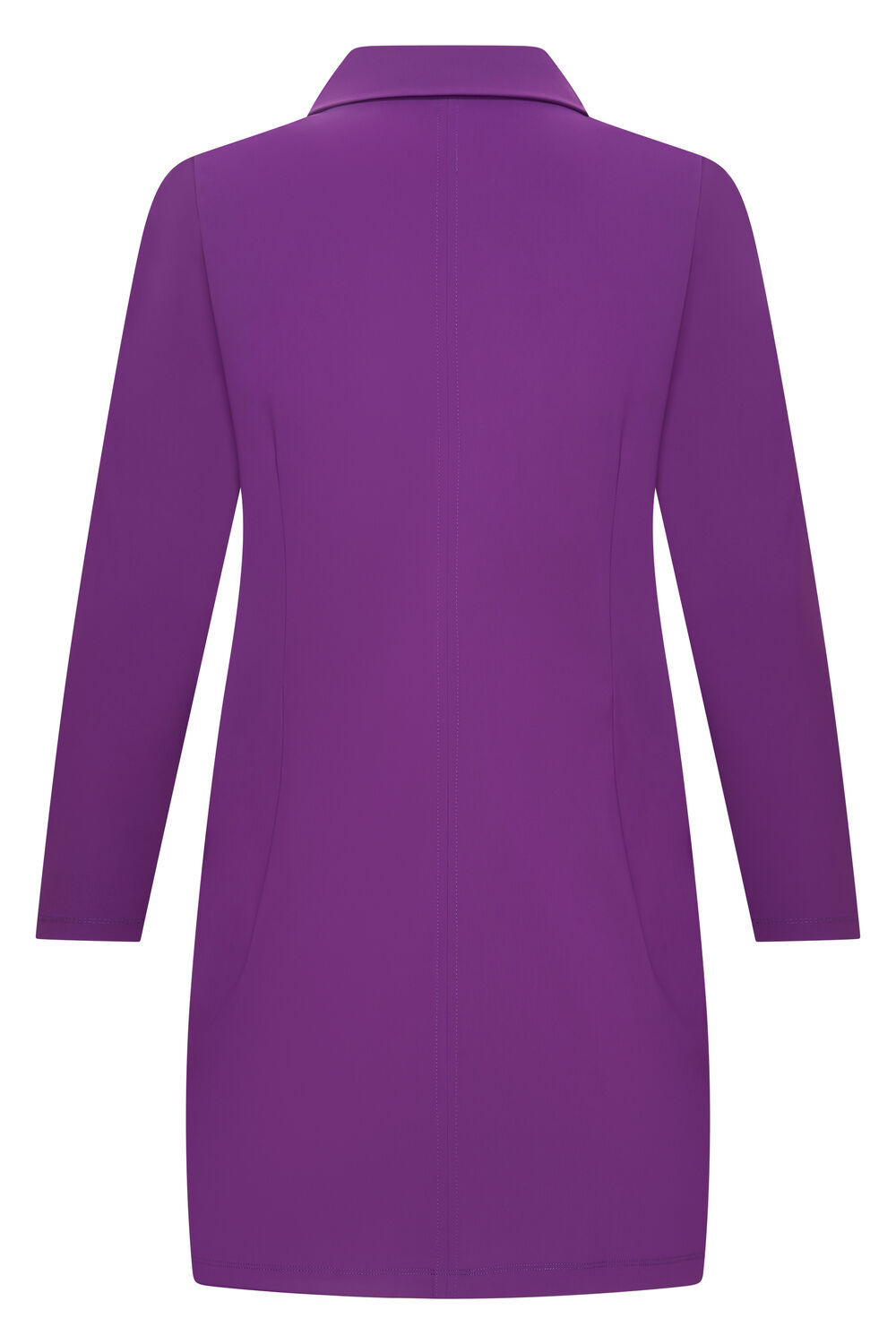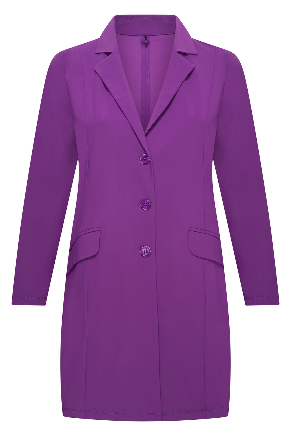 Midi lengte ongevoerde blazer met reverskraag. Lange mouwen met schoudervulling. Aan de voorzijde drie knopen en twee klepzakken. Engelse naad op rugpand.