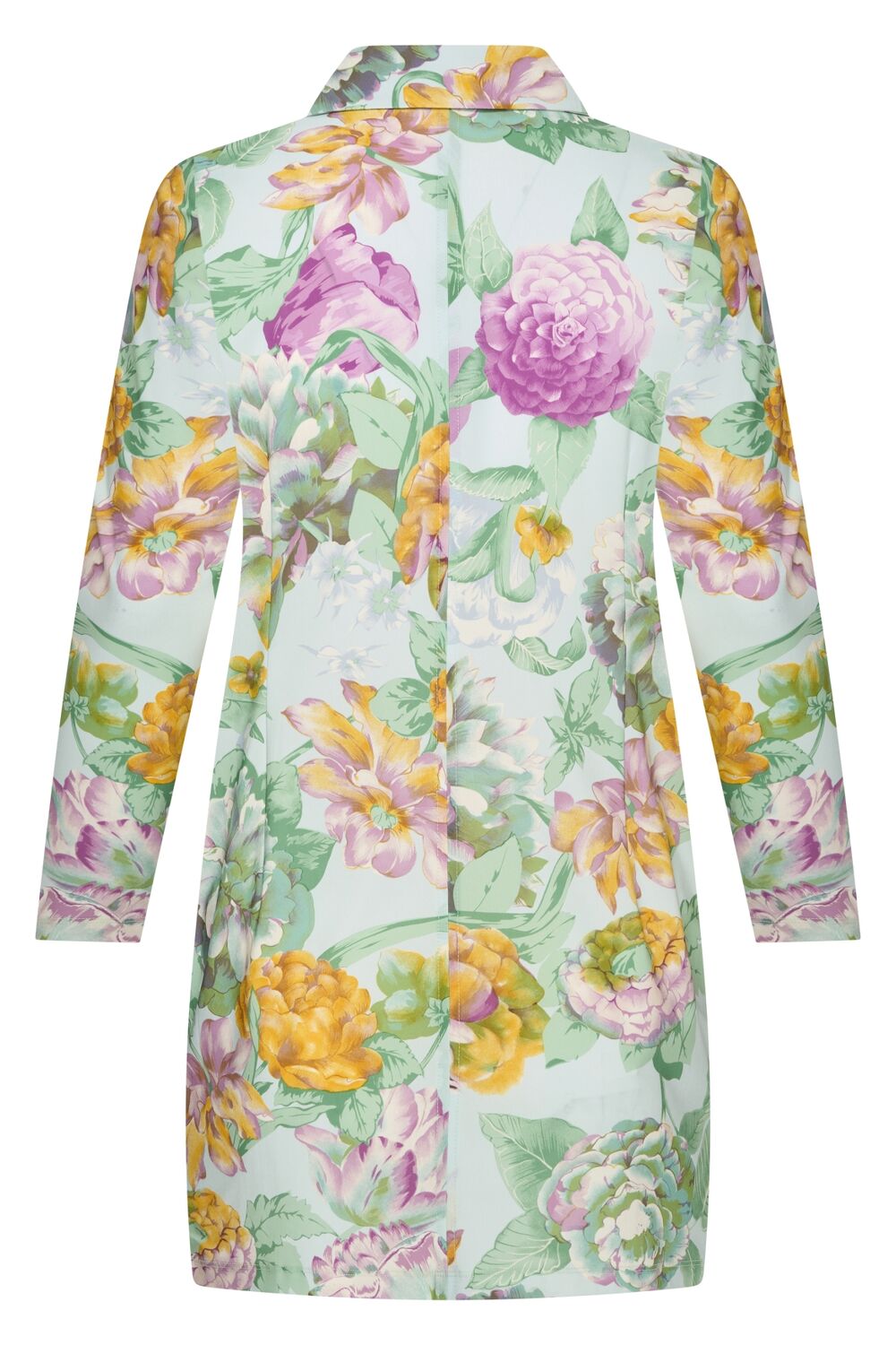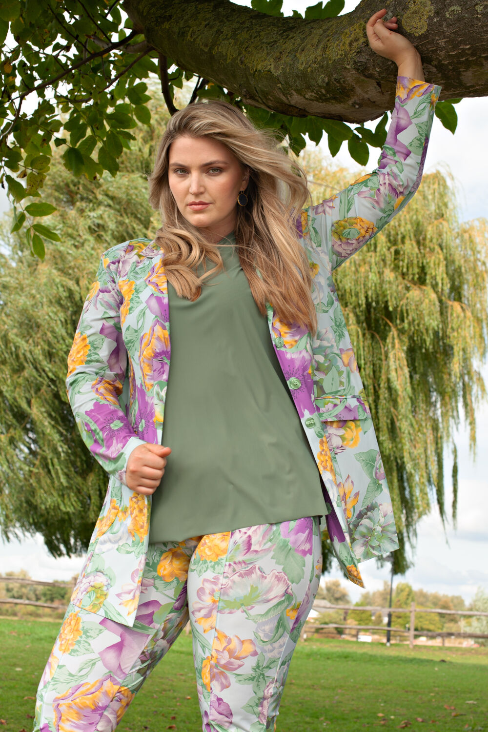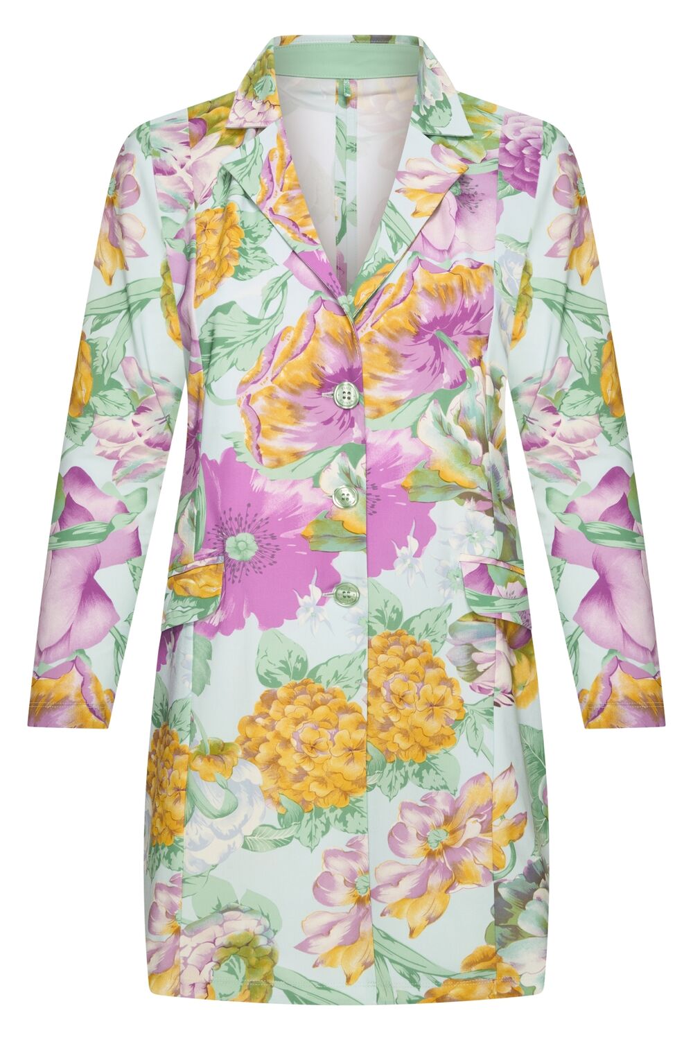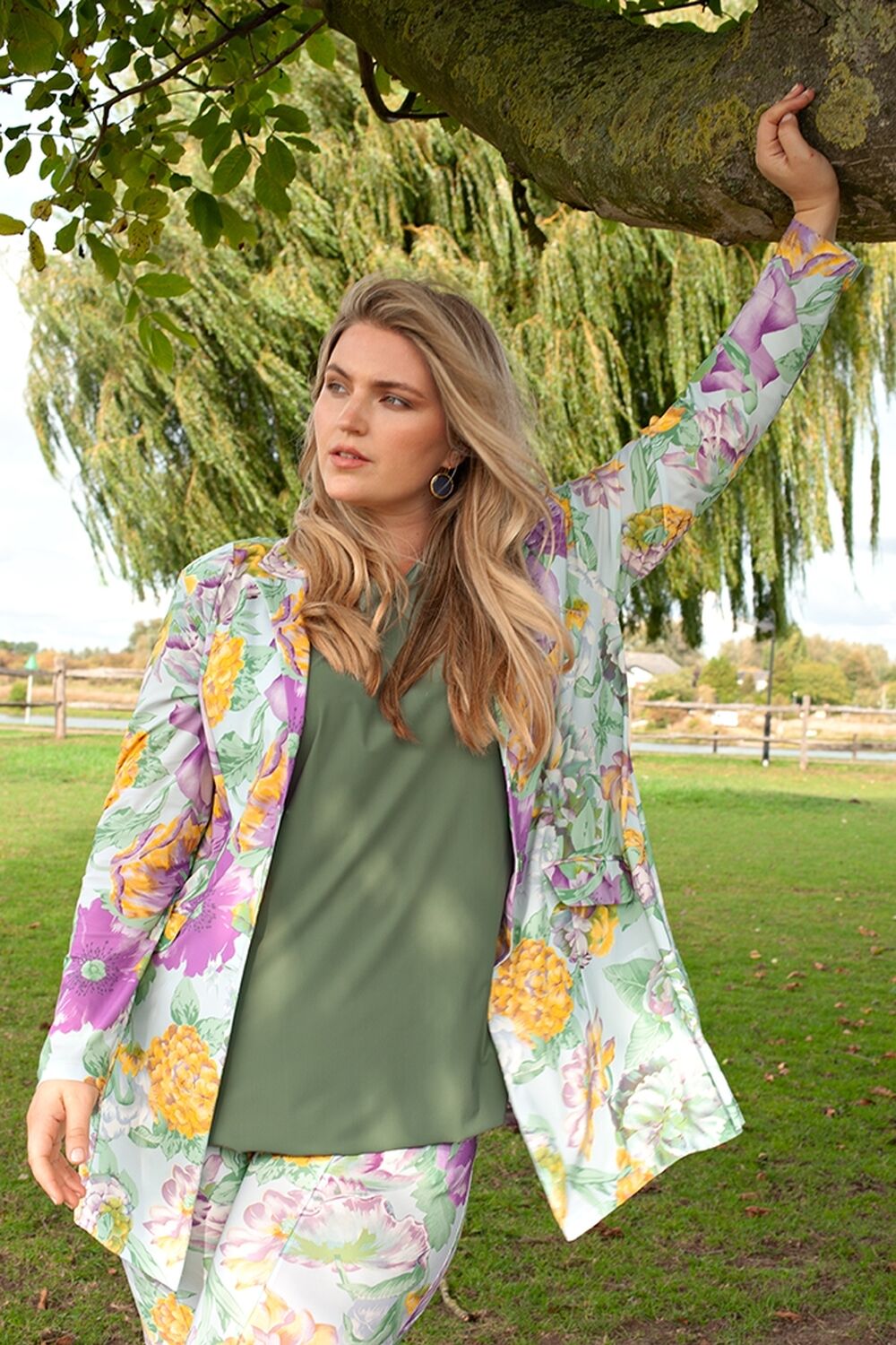 Let op; dit is een nieuw Plusbasics item; MIDI, de lengte is 80 cm bij maat 46! Midi lengte ongevoerde blazer met reverskraag. Lange mouwen met schoudervulling. Aan de voorzijde drie knopen en twee klepzakken. Engelse naad op rugpand.